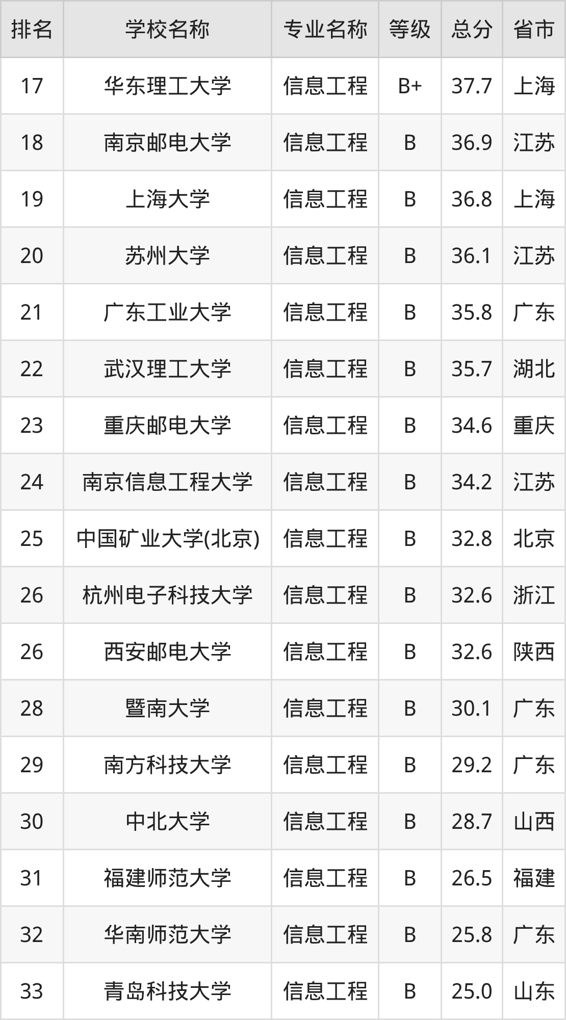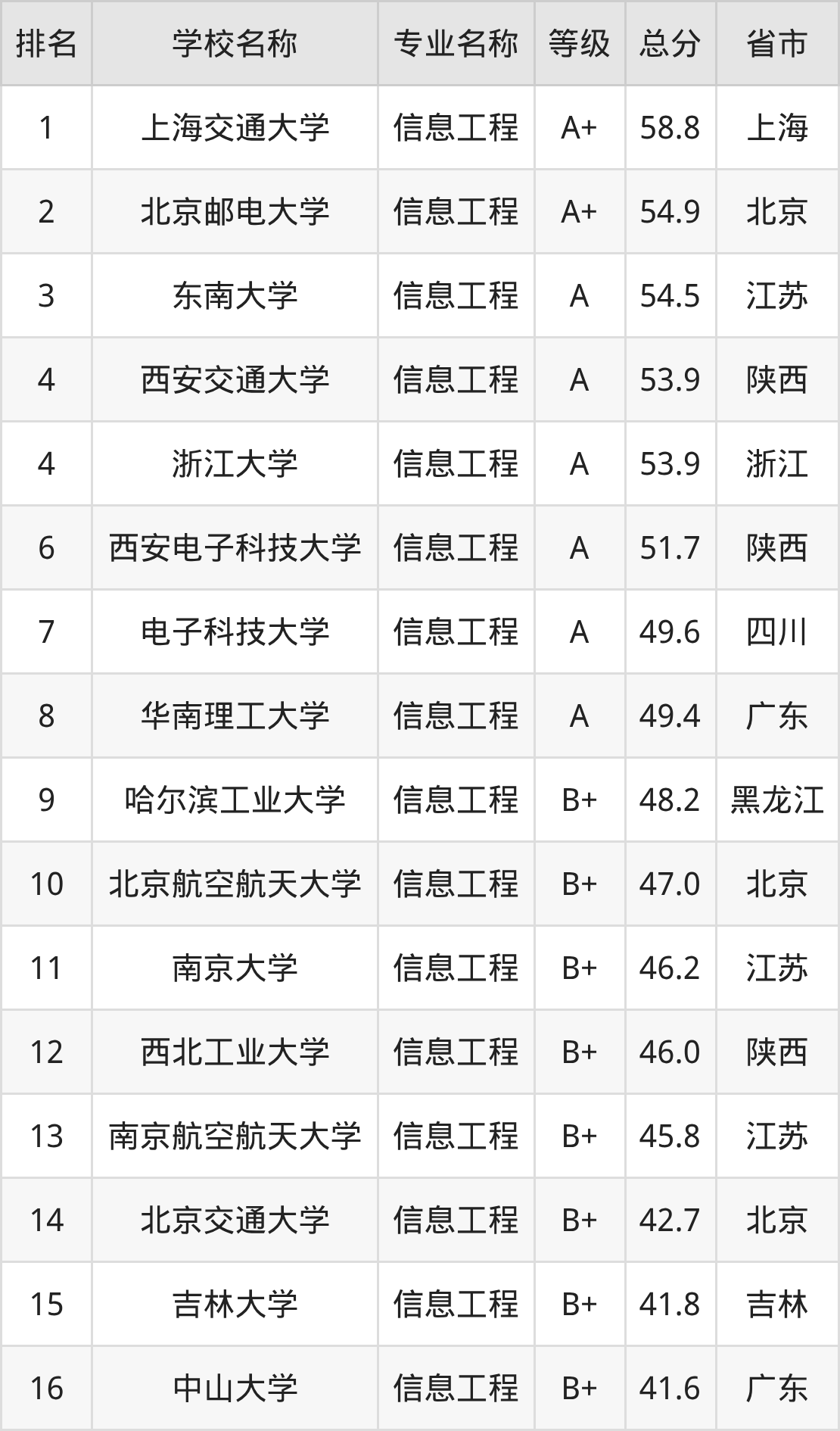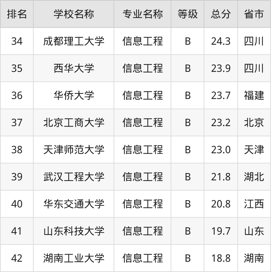 附信息工程专业全国42所院校排名榜单一览表!
