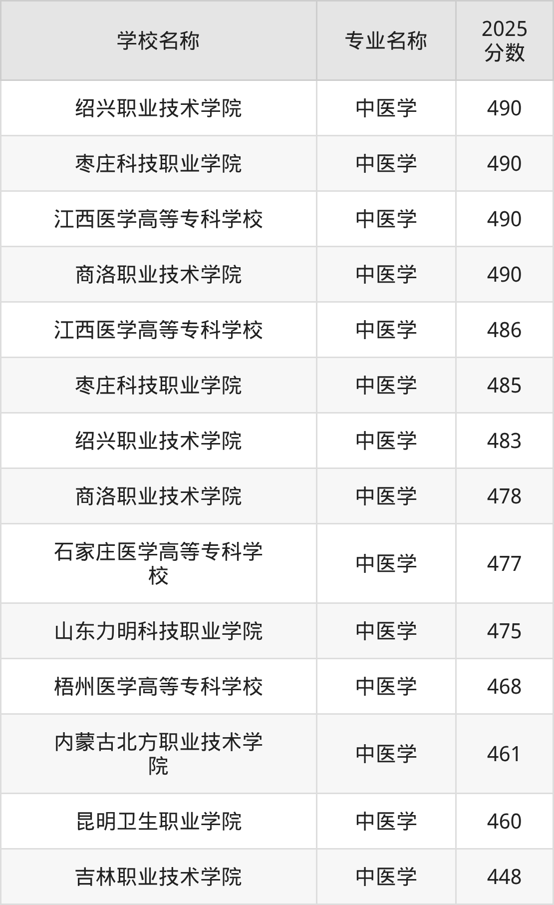 下面是2025年全国专科中医学专业大学录取分数线。