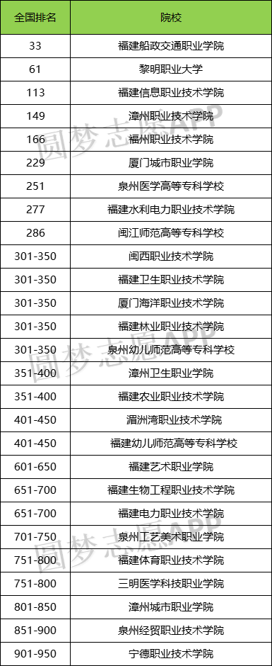 以下为2024年福建公办大专学校完整名单及排名