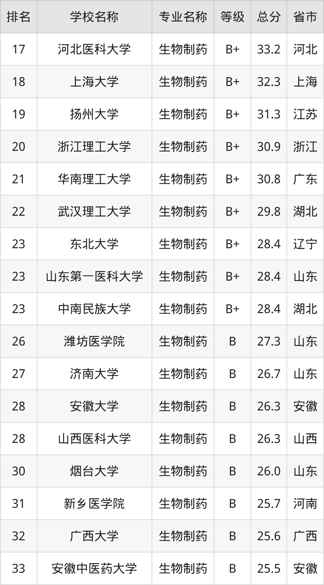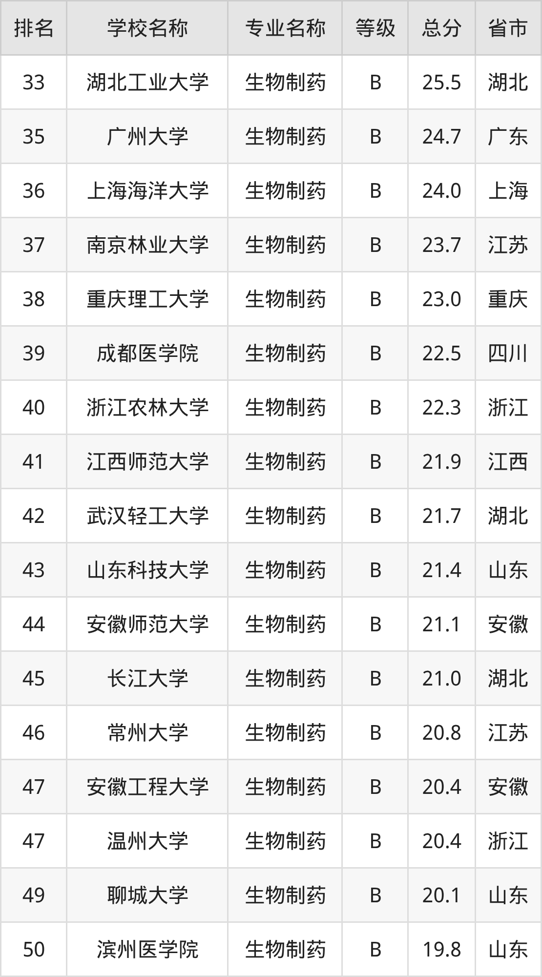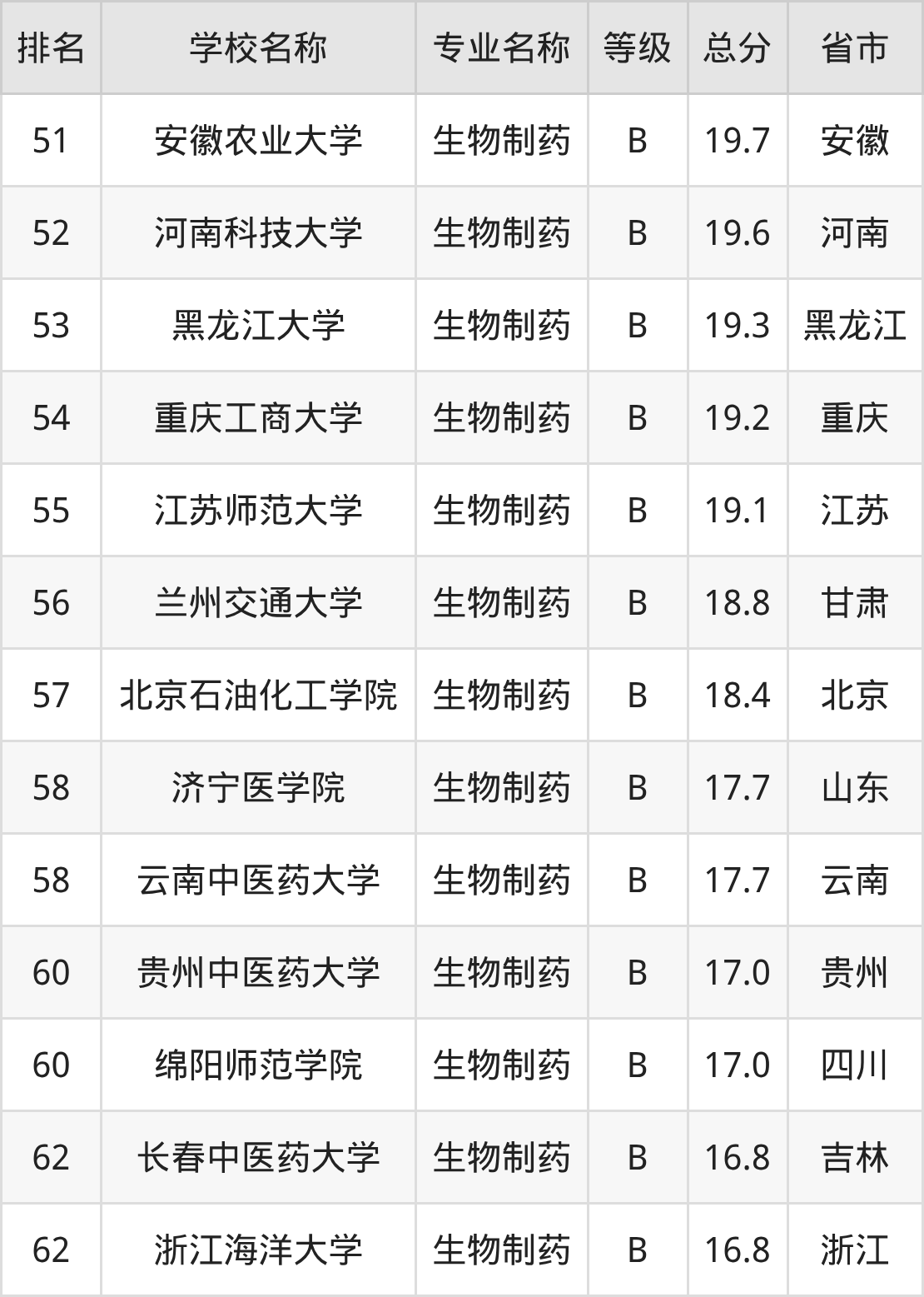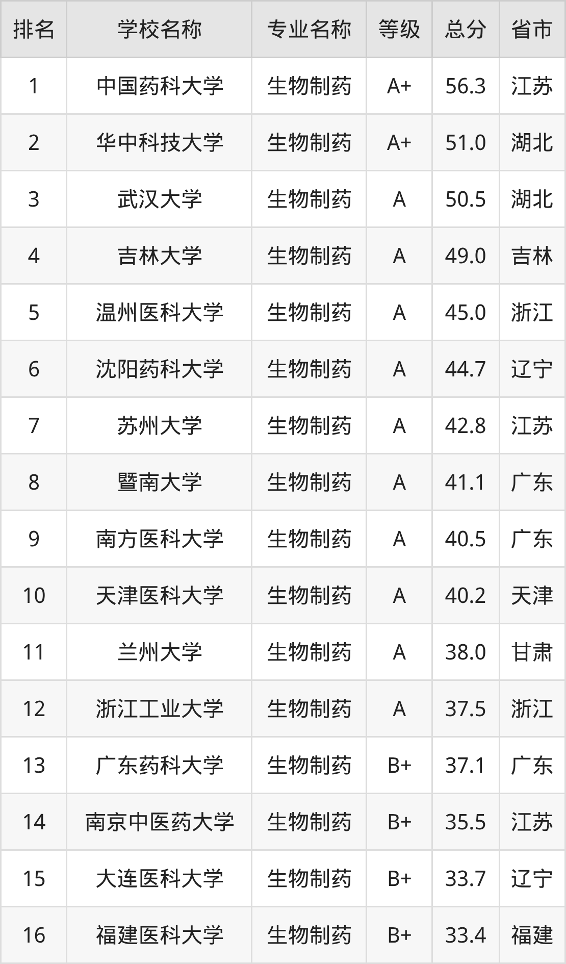 根据软科榜单可知,生物制药专业全国排名前十的大学分别是: