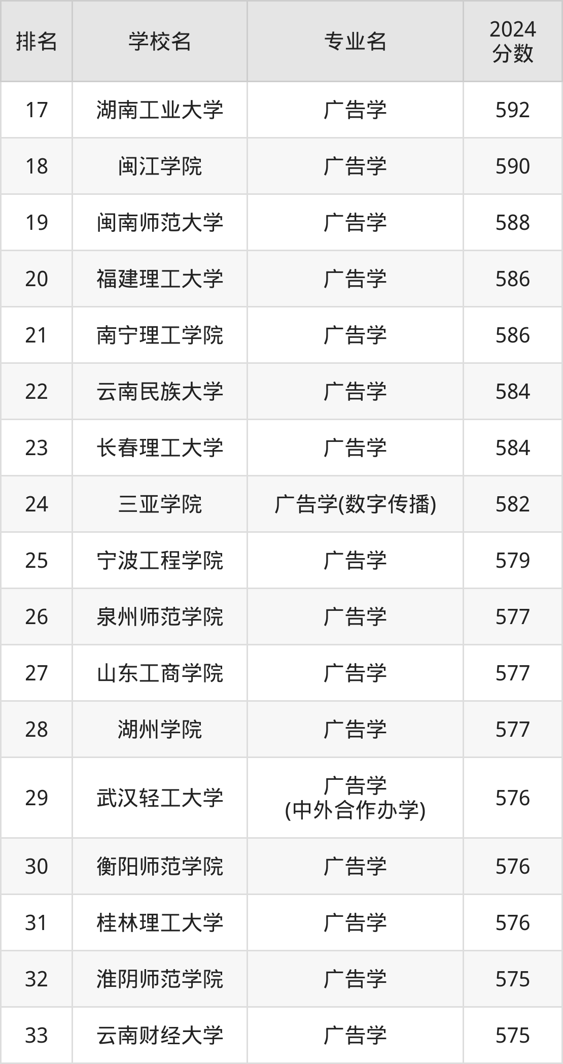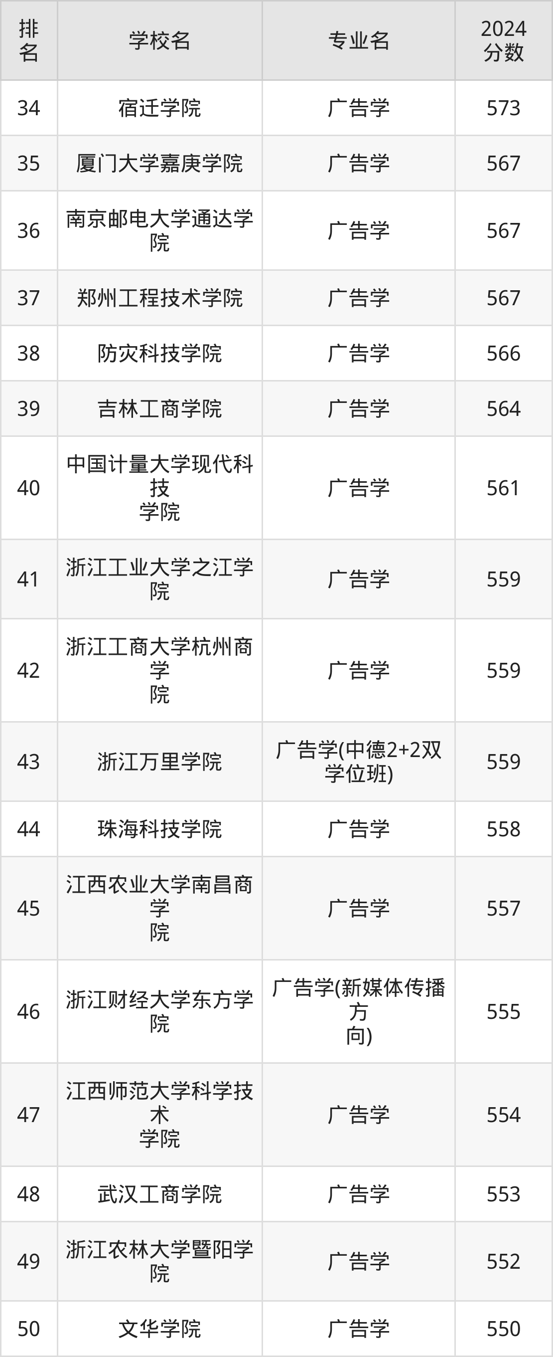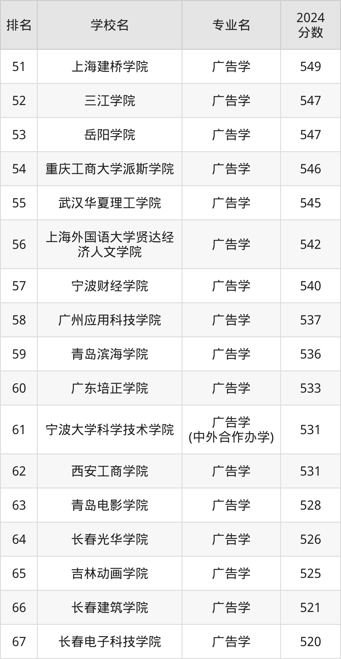 以下为全国广告学专业在浙江省分数线排名前70的大学。