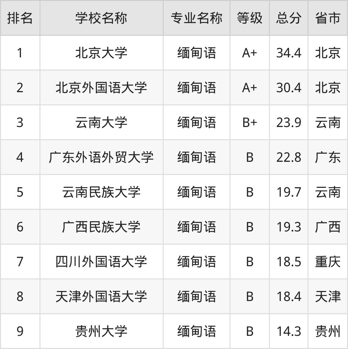 根据软科榜单可知,缅甸语专业全国排名前九的大学分别是: