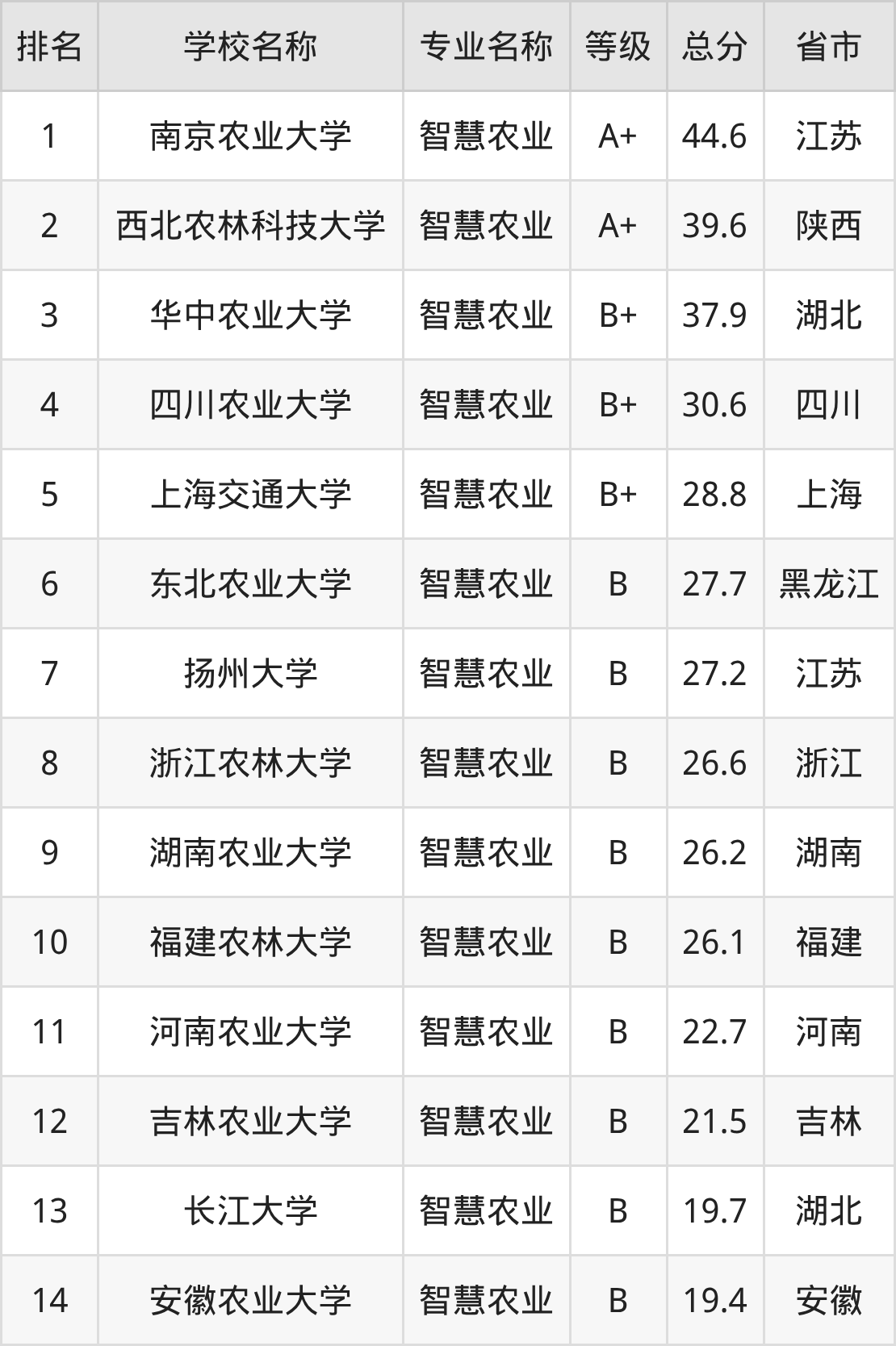 根据软科榜单可知,智慧农业专业全国排名前十的大学分别是: