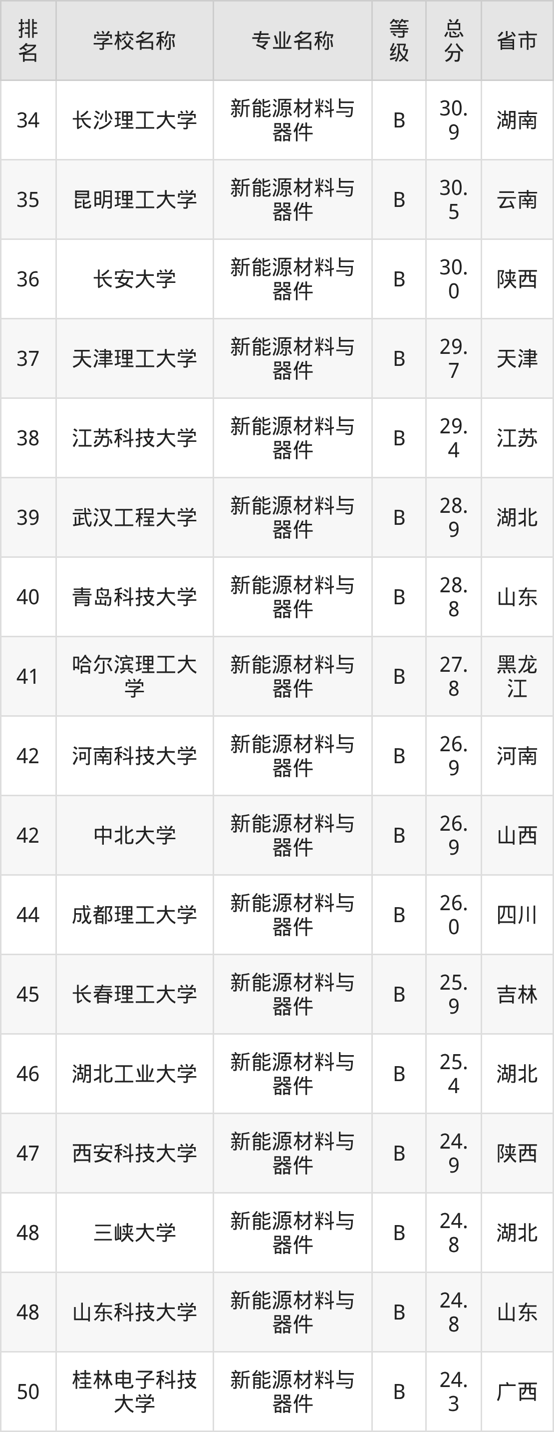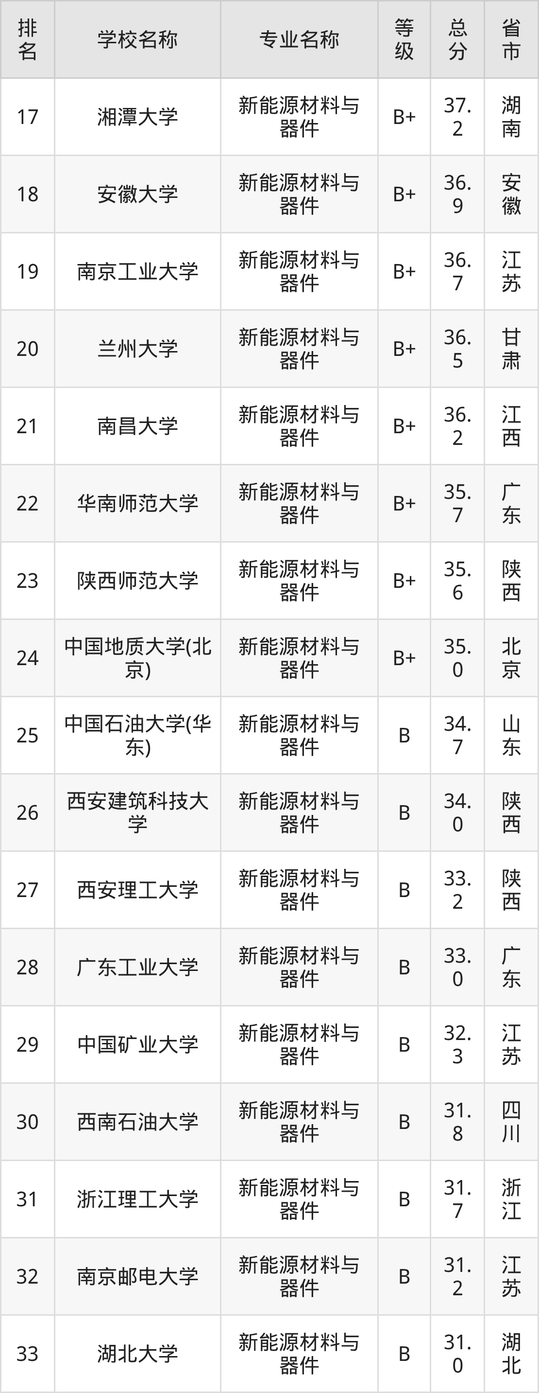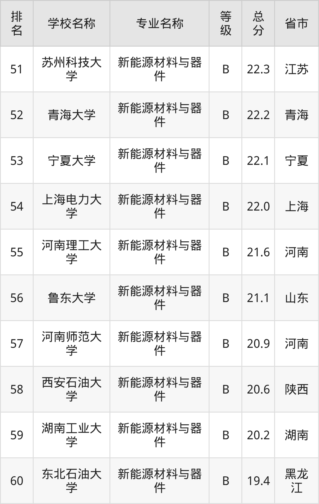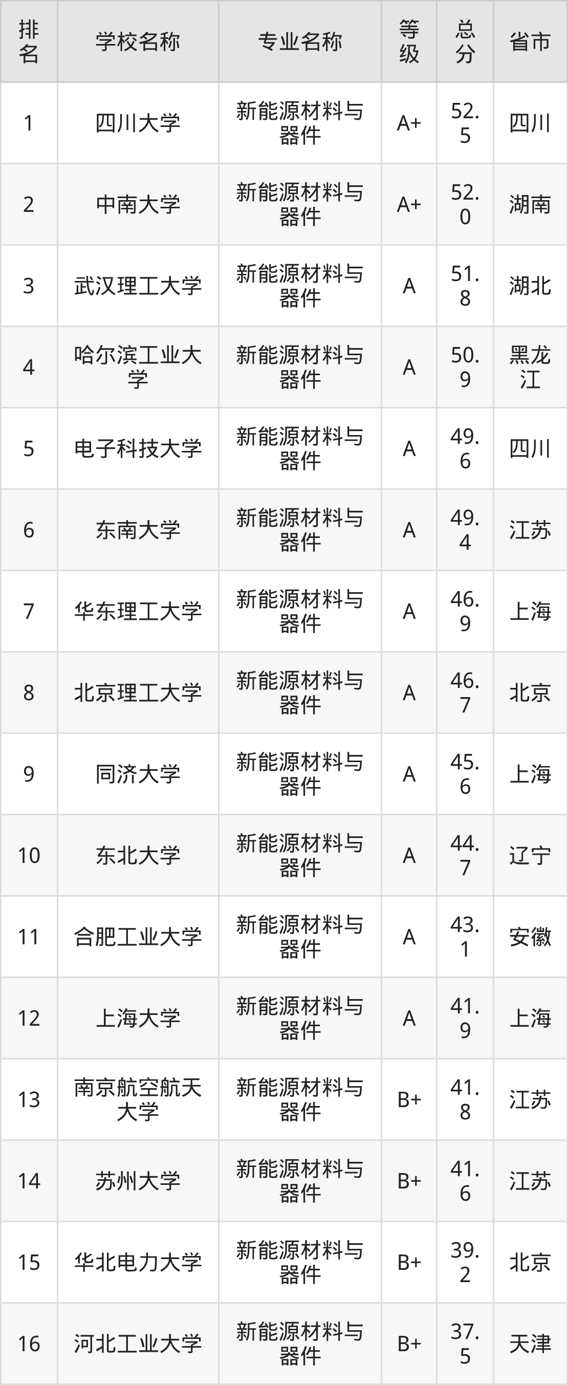 附新能源材料与器件专业全国60所院校排名榜单一览表!