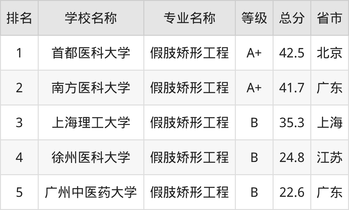 根据软科榜单可知,假肢矫形工程专业全国排名前五的大学分别是: