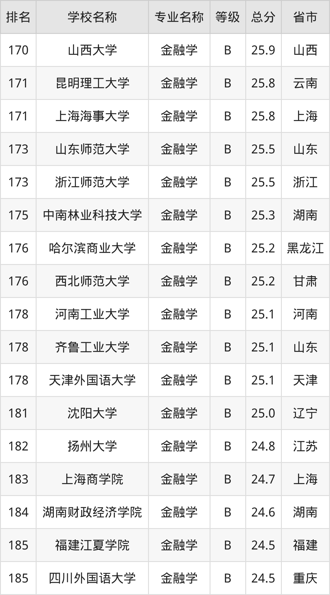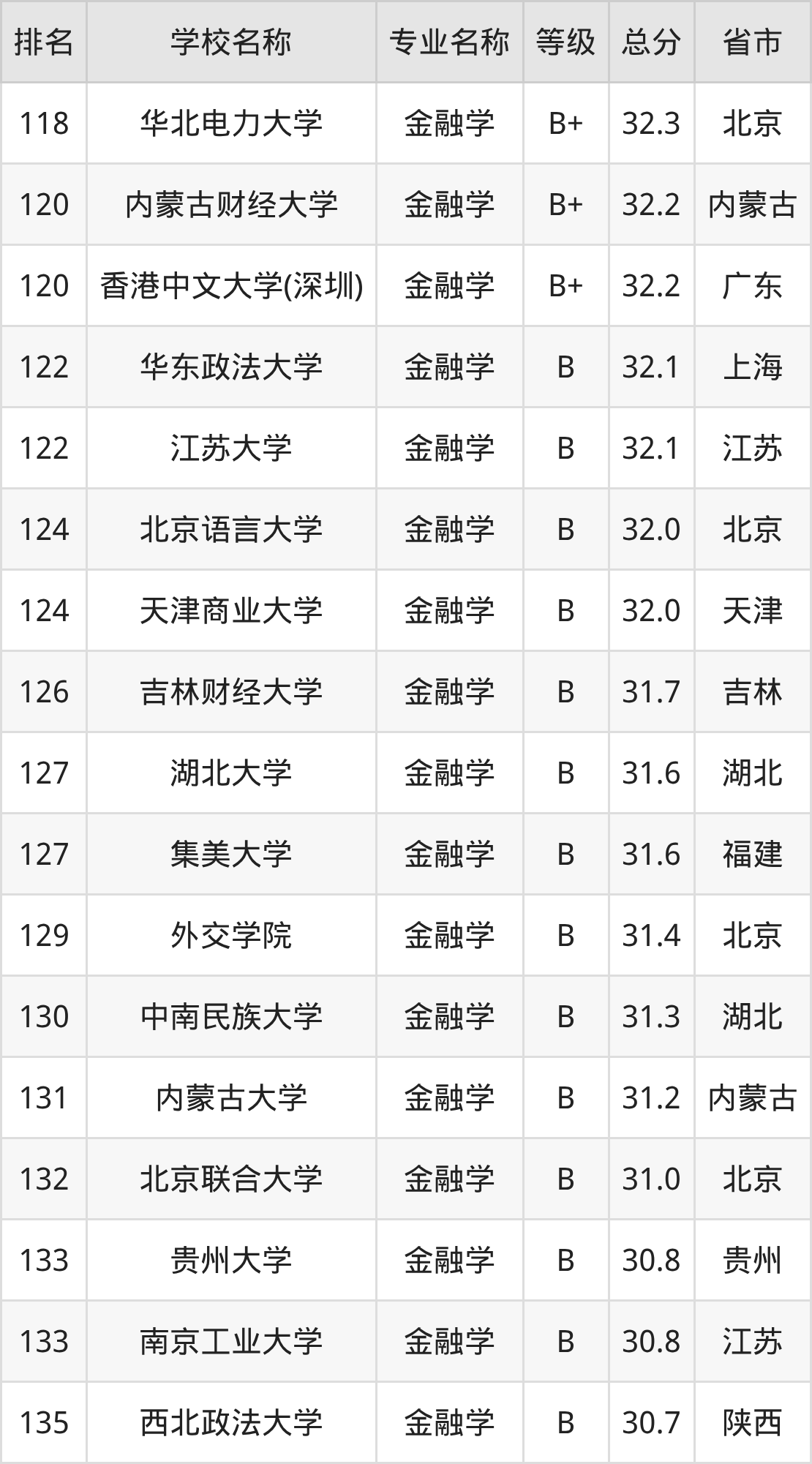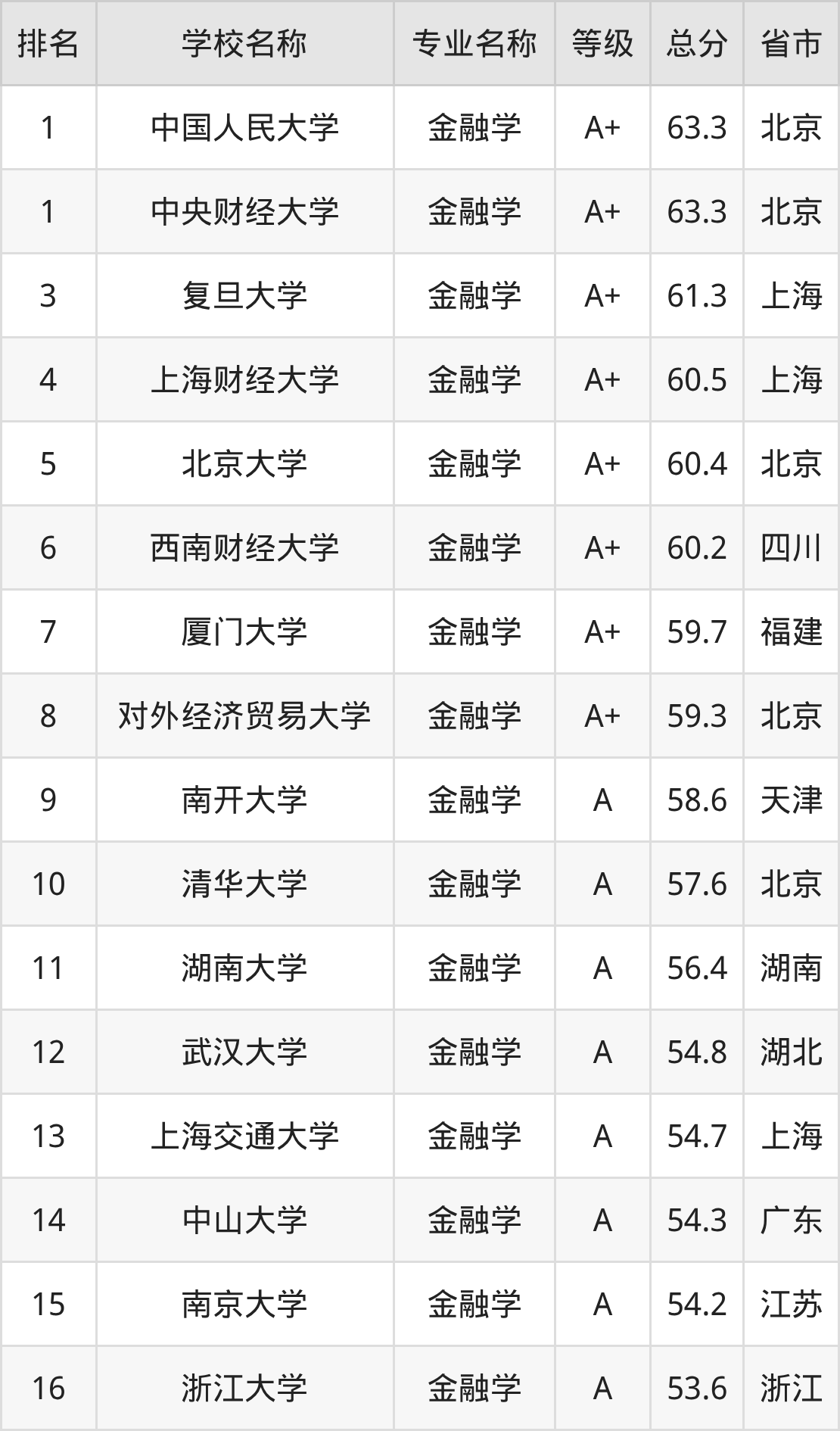 根据软科榜单可知,金融学专业全国排名前十的大学分别是:
