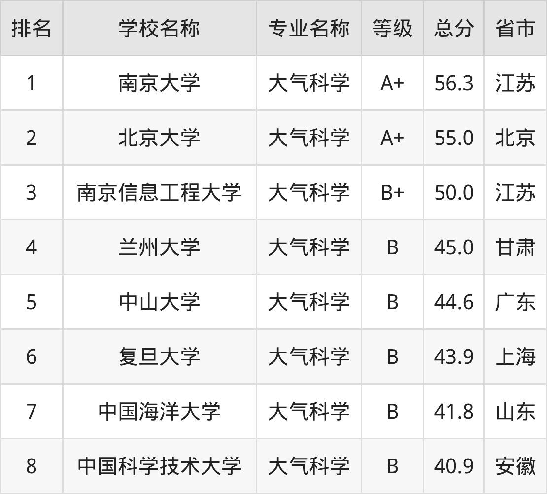根据软科榜单可知,大气科学专业全国排名前八的大学分别是: