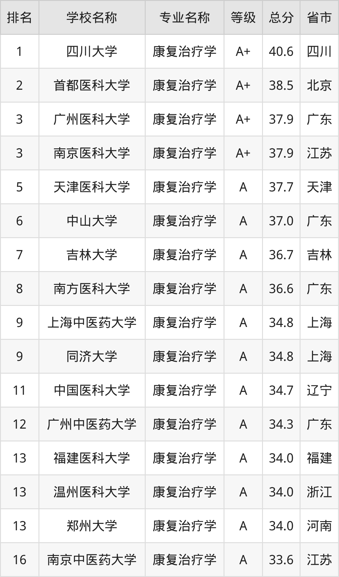 根据软科榜单可知,康复治疗学专业全国排名前十的大学分别是: