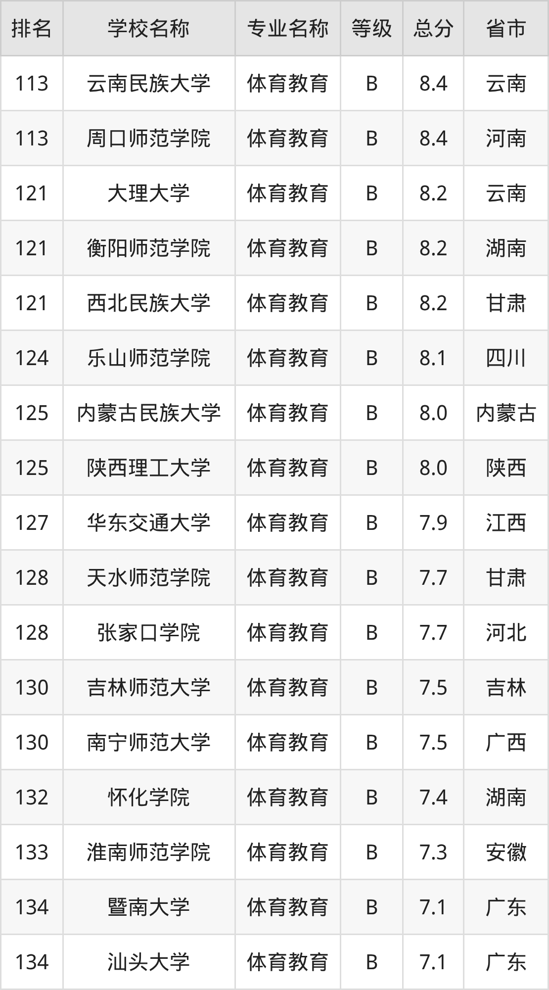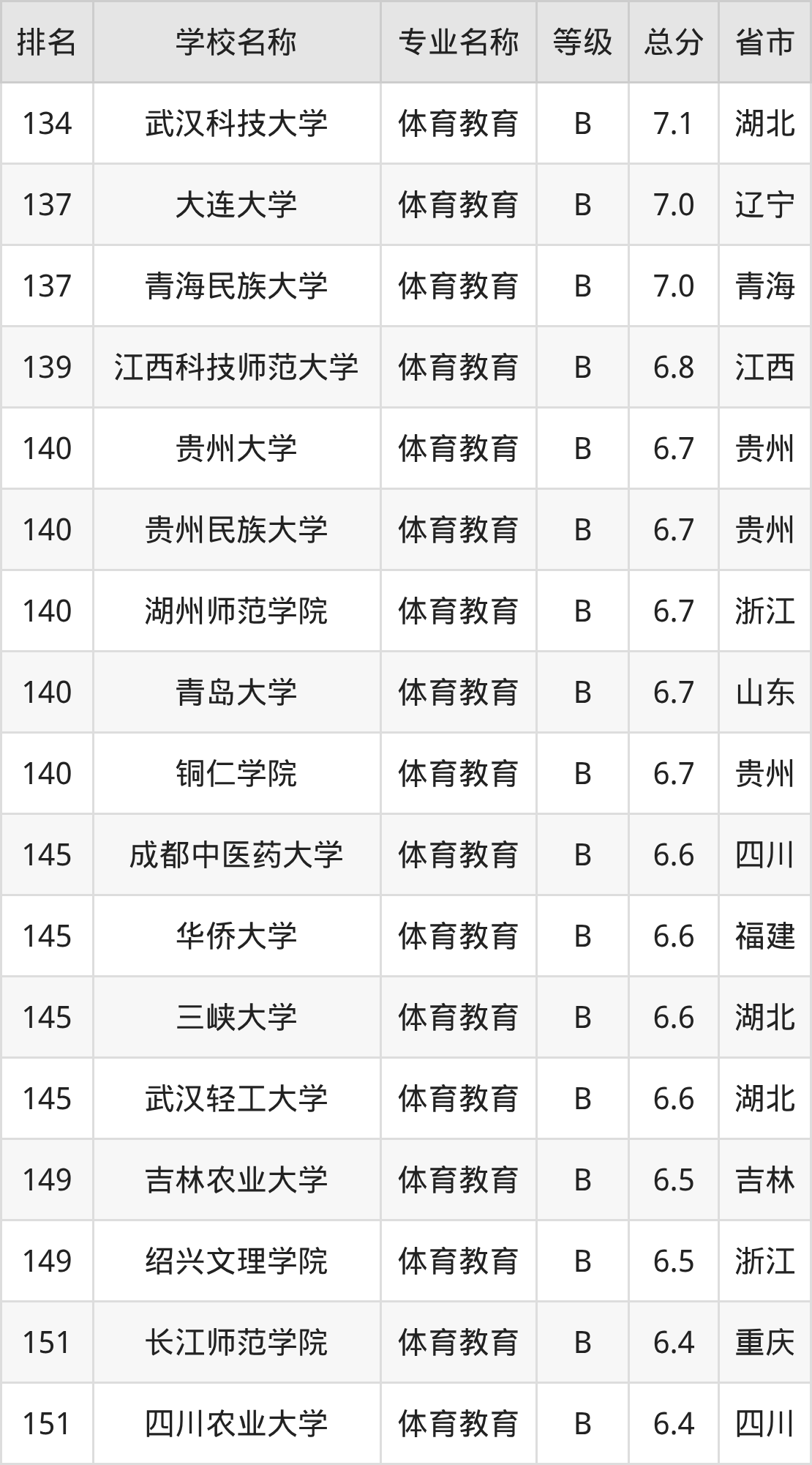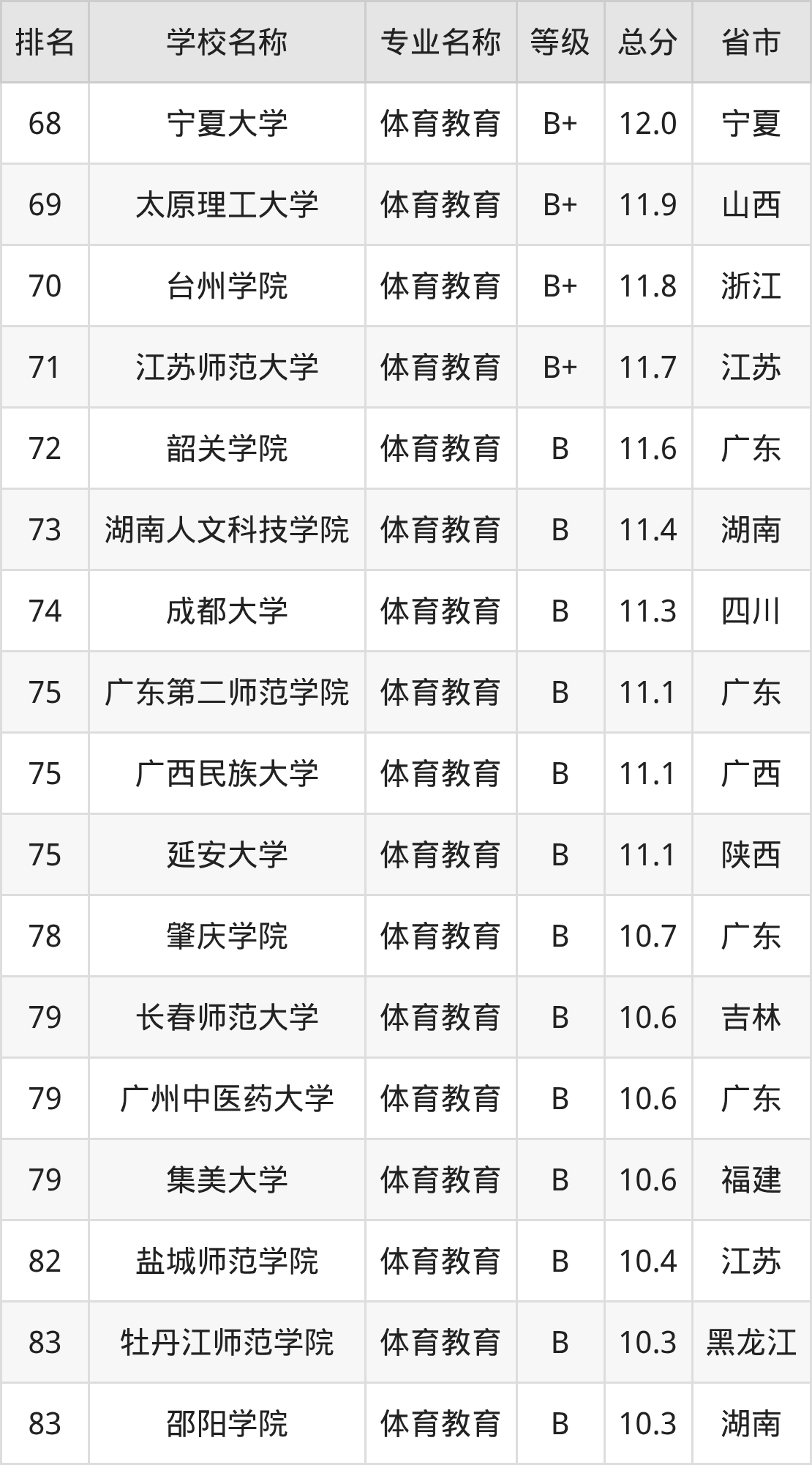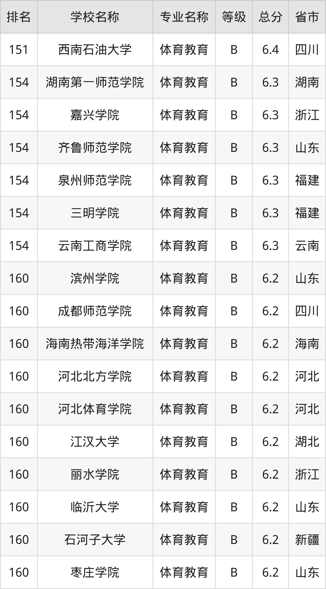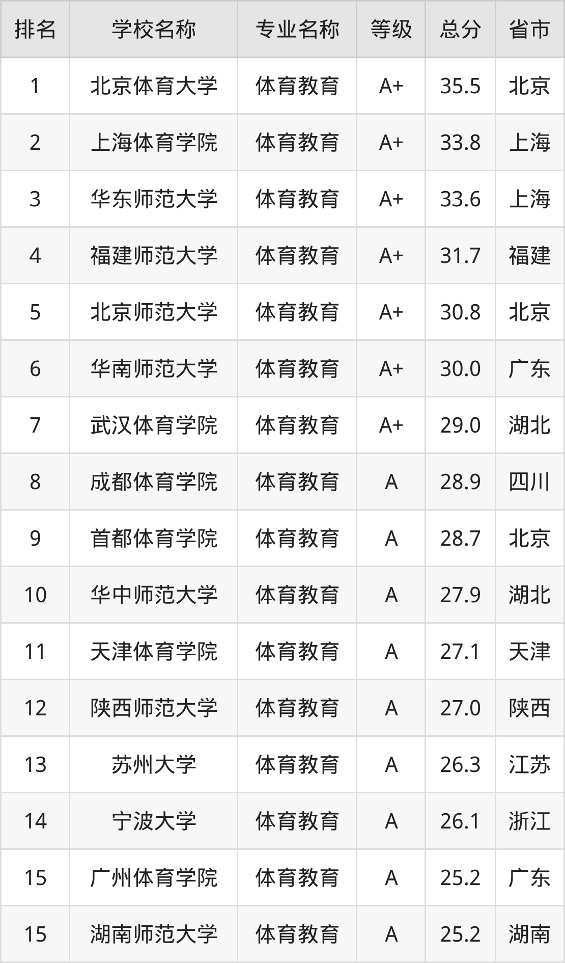 2025年体育教育专业全国大学排名中,排名第一的是北京体育大学,被软科榜单评为:体育教育专业实力最强的本科院校。本文将展示体育教育专业上榜软科榜单的180所院校排名以及等级评分,供2026年想读体育教育专业的同学们参考!