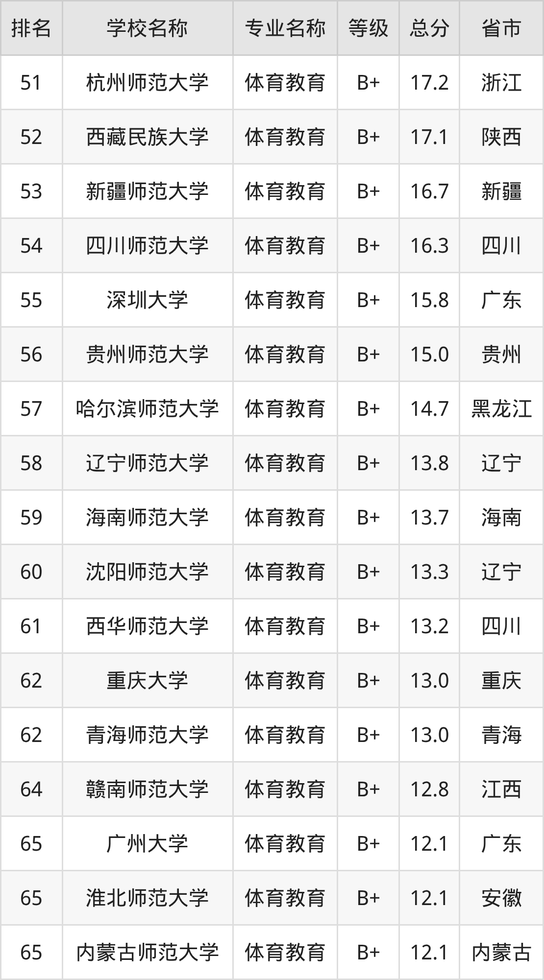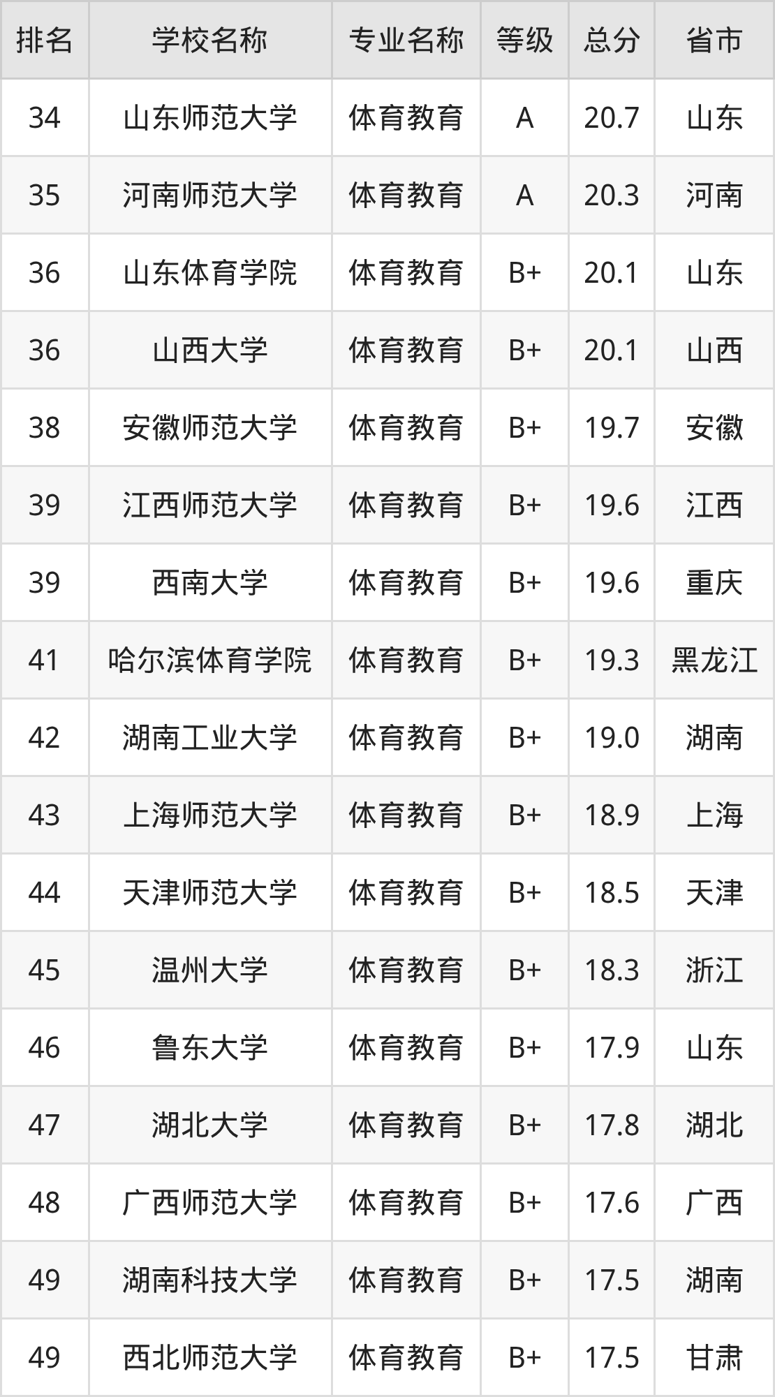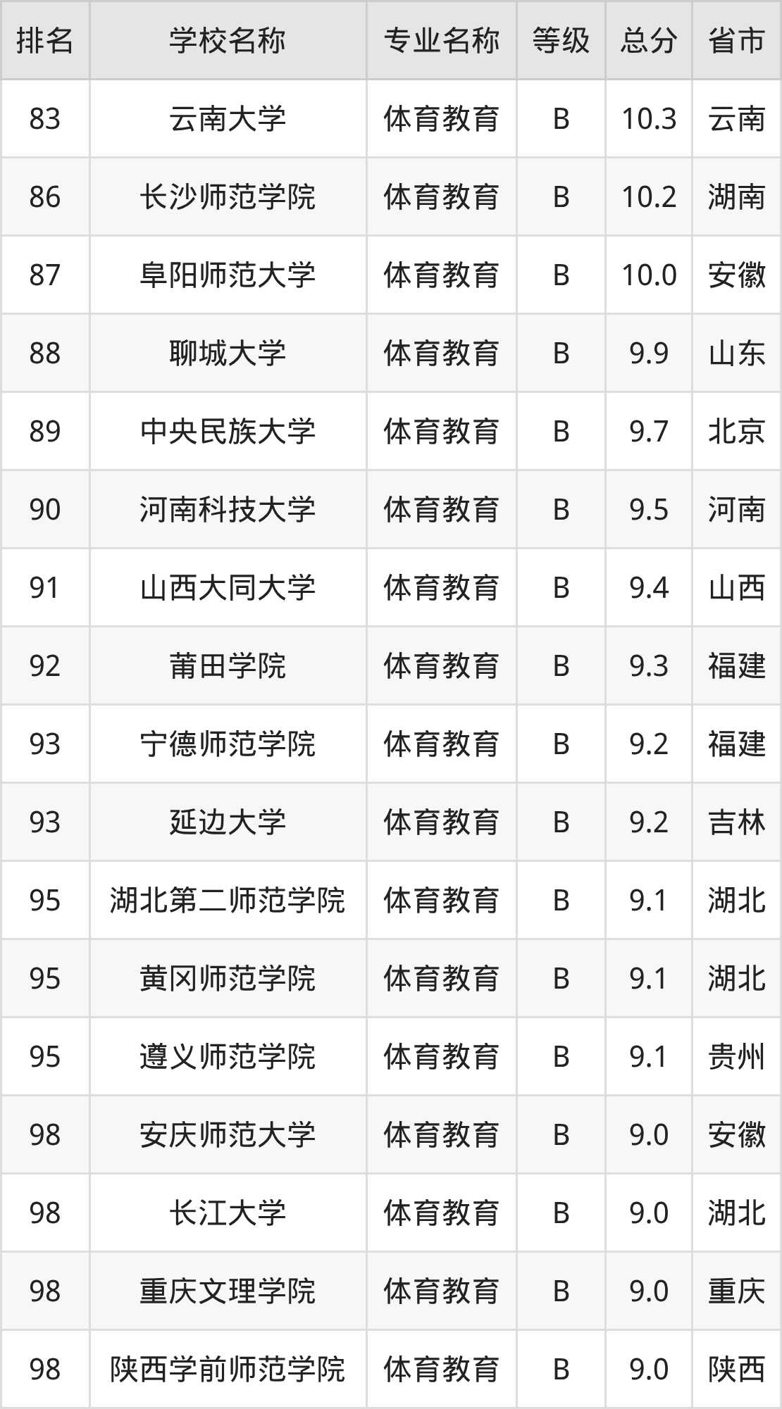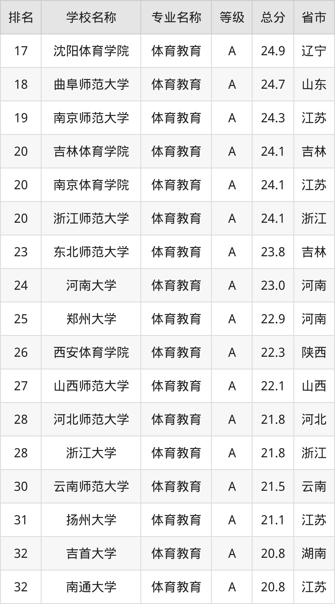 根据软科榜单可知,体育教育专业全国排名前十的大学分别是: