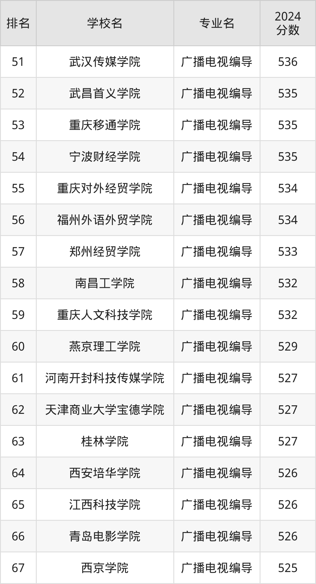 以下为全国广播电视编导专业在浙江省分数线排名前70的大学。