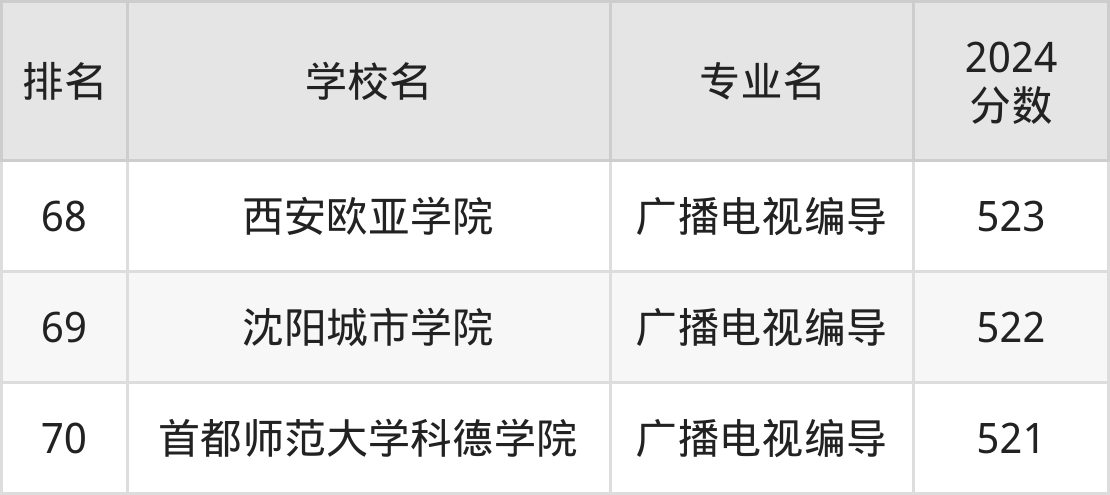 广播电视编导专业排名前70的大学中,收分较低的有首都师范大学科德学院(521分)、沈阳城市学院(522分)、西安欧亚学院(523分)、西京学院(525分)、青岛电影学院(526分)。