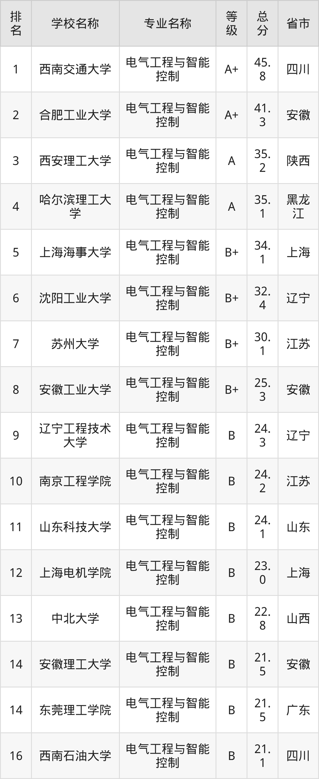 附电气工程与智能控制专业全国20所院校排名榜单一览表!