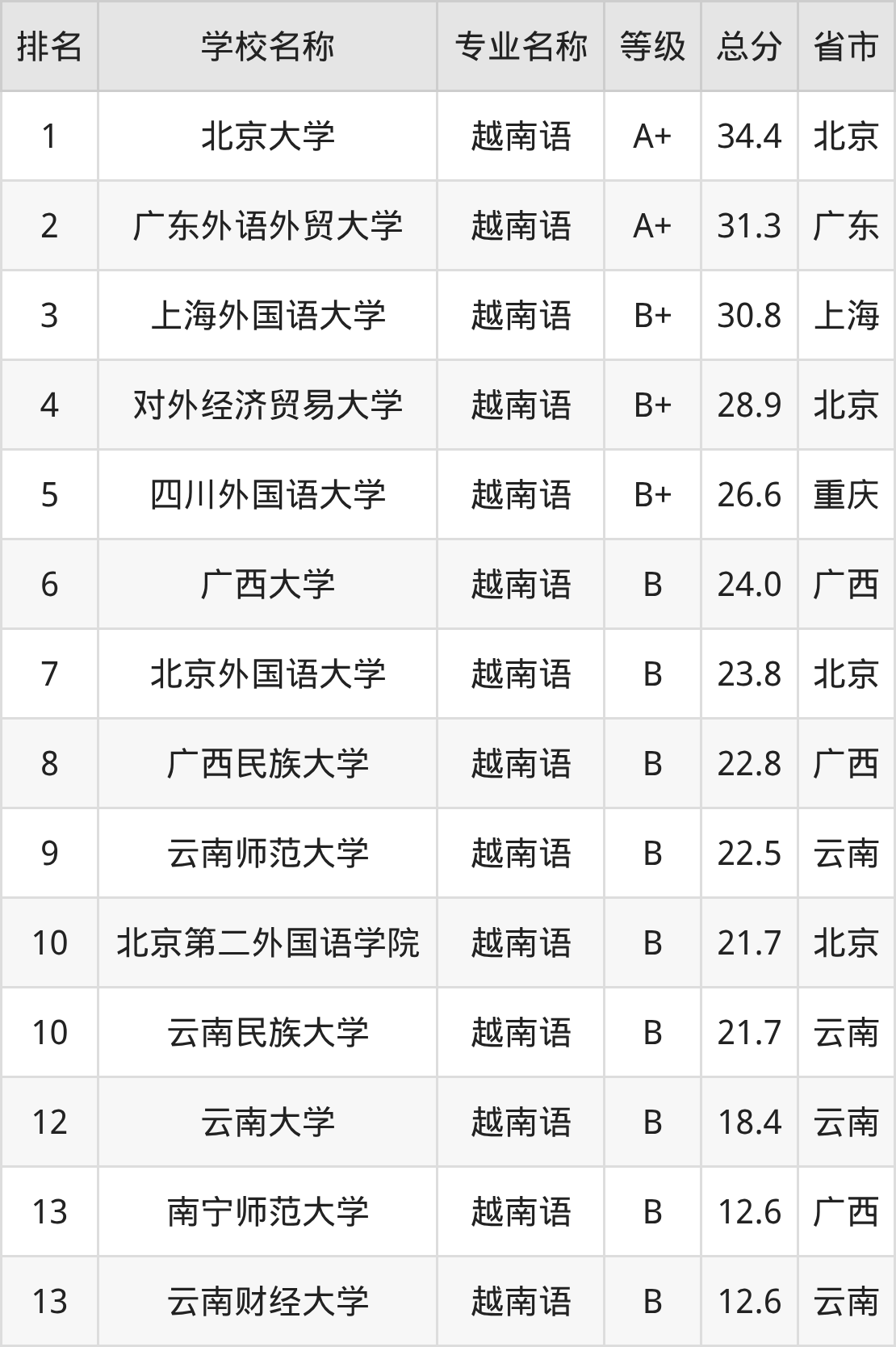 根据软科榜单可知,越南语专业全国排名前十的大学分别是: