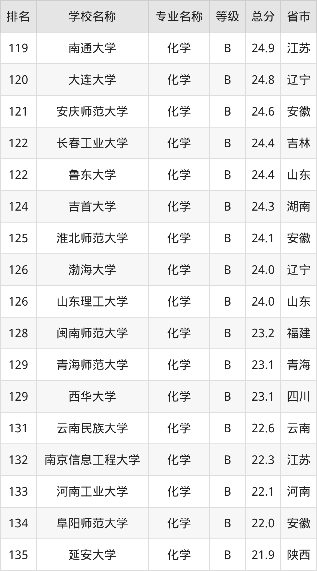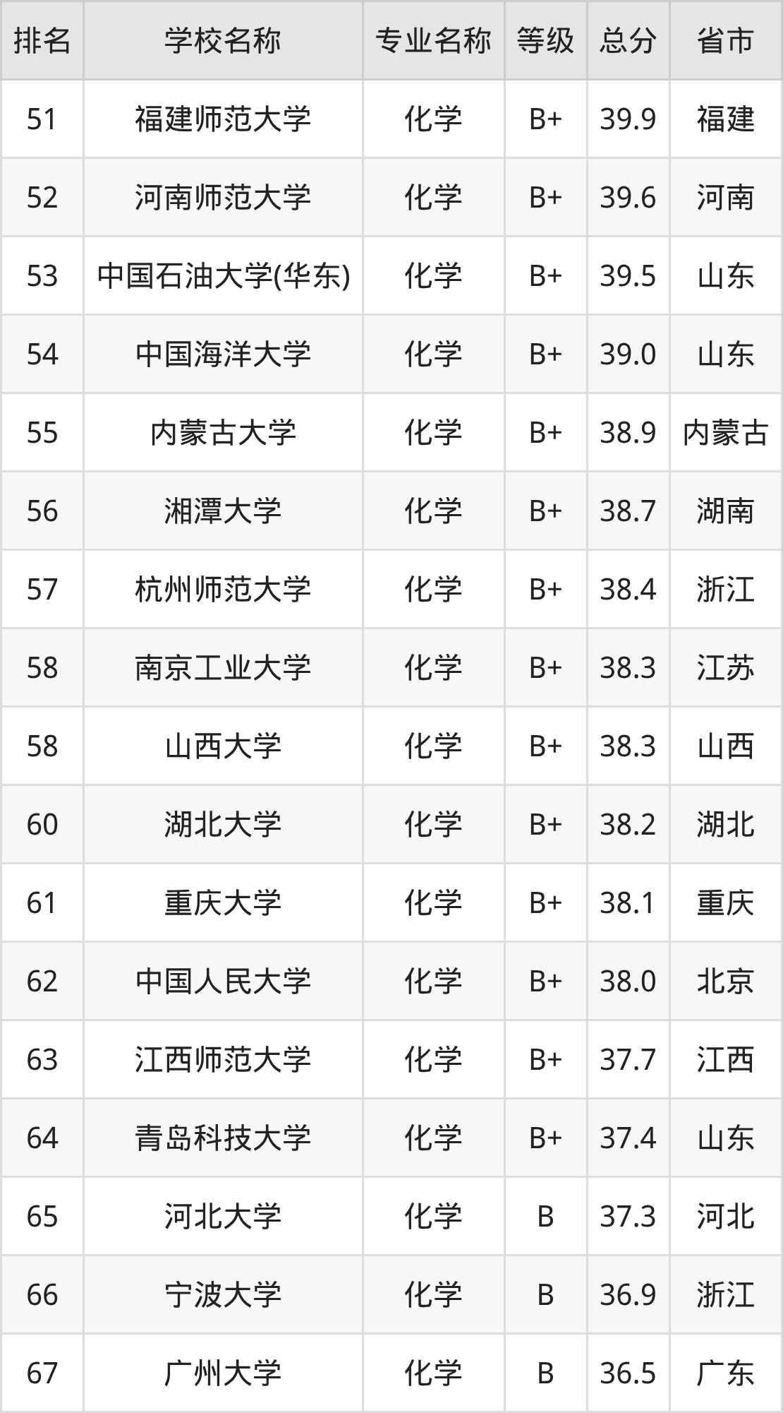 根据软科榜单可知,化学专业全国排名前十的大学分别是: