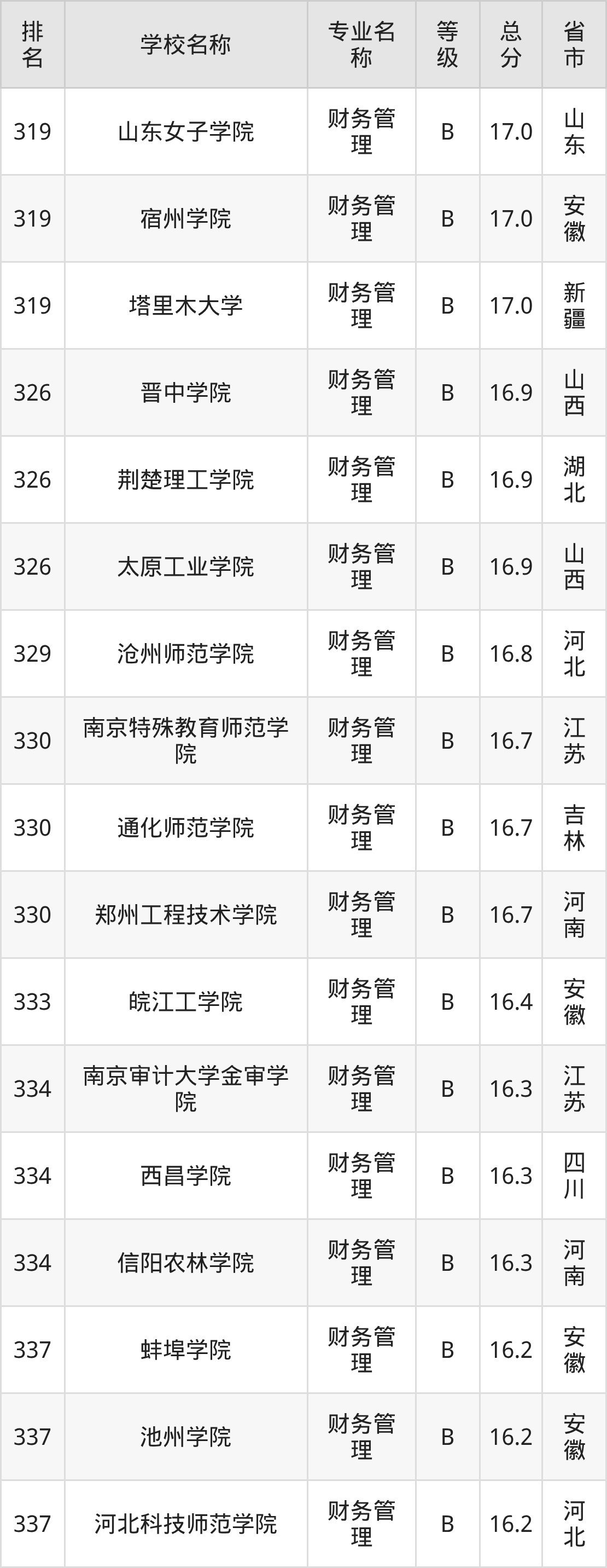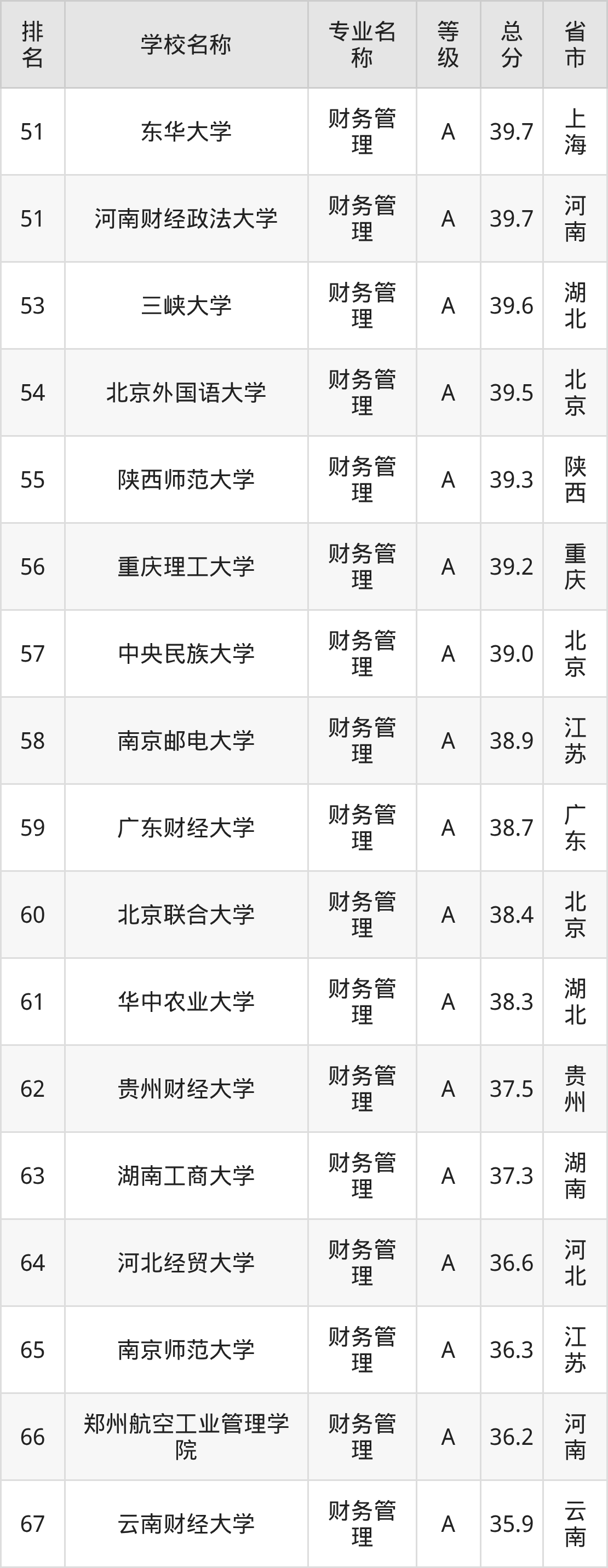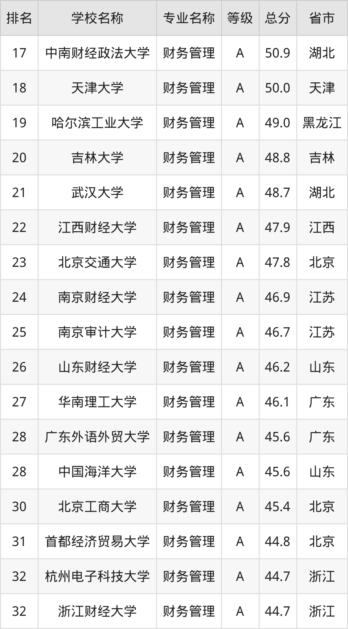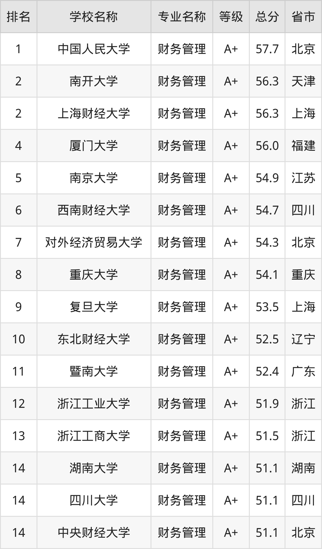 根据软科榜单可知,财务管理专业全国排名前十的大学分别是:
