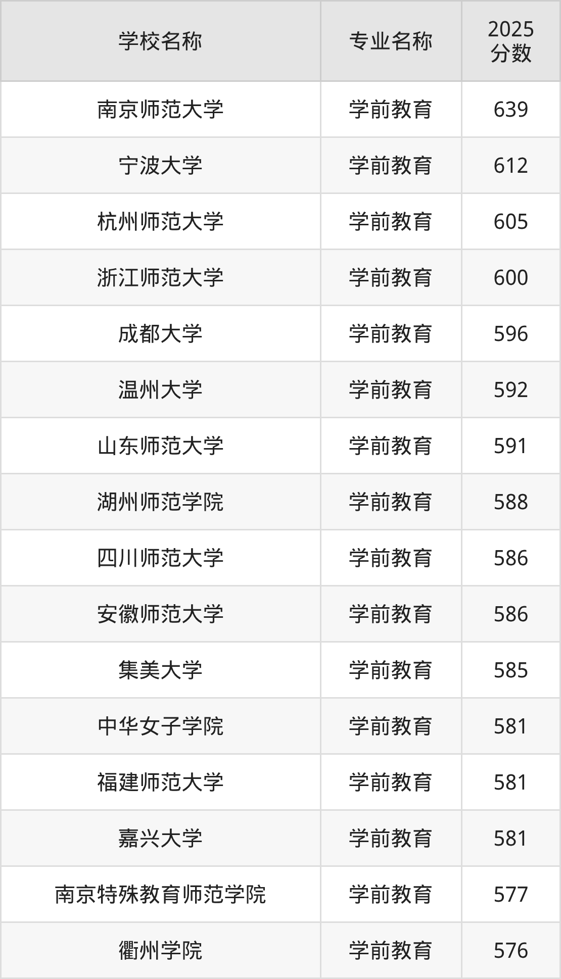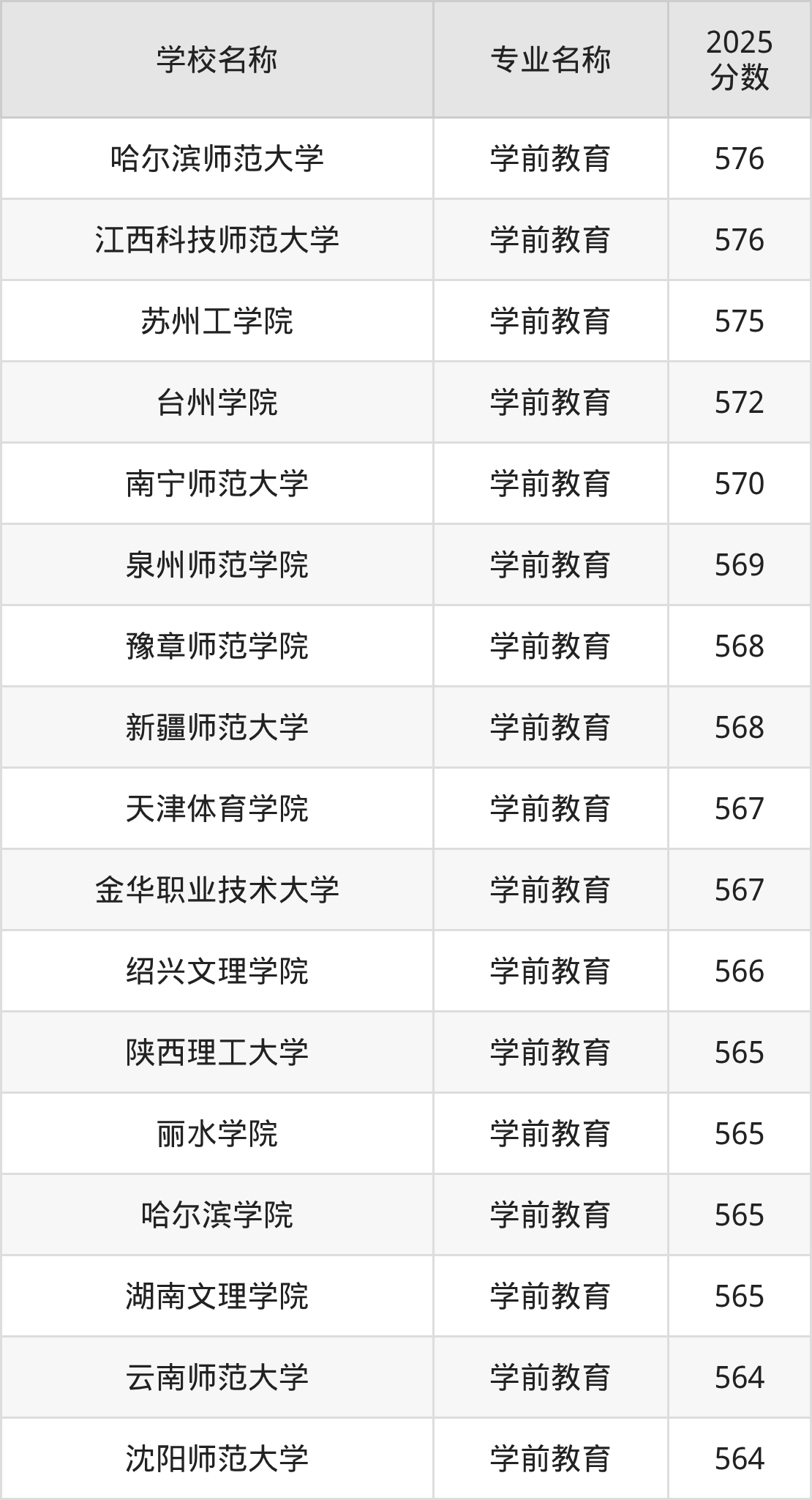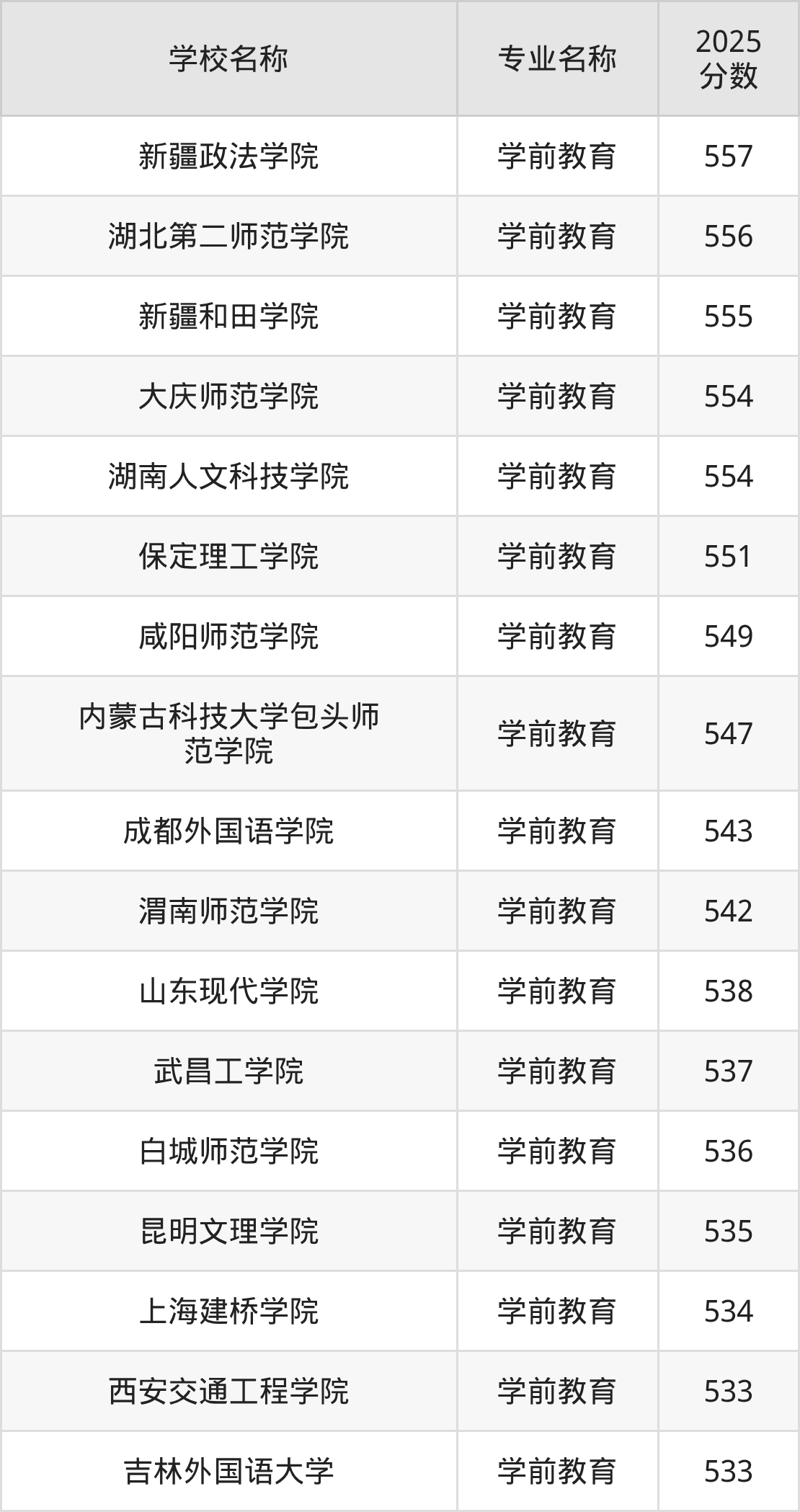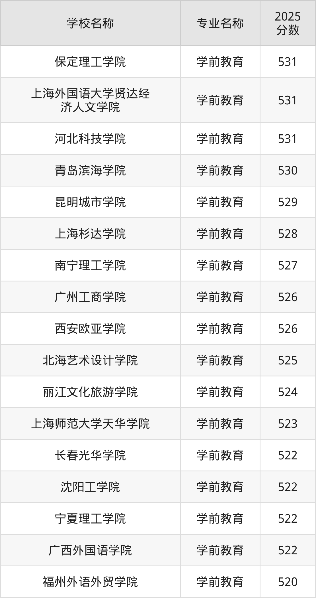下面是2025年全国本科学前教育专业大学录取分数线。