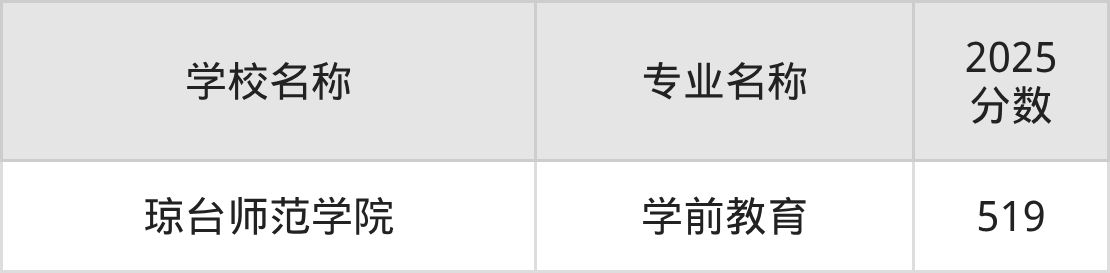 学前教育专业本科最低录取分数线:519分,对应学校是琼台师范学院。