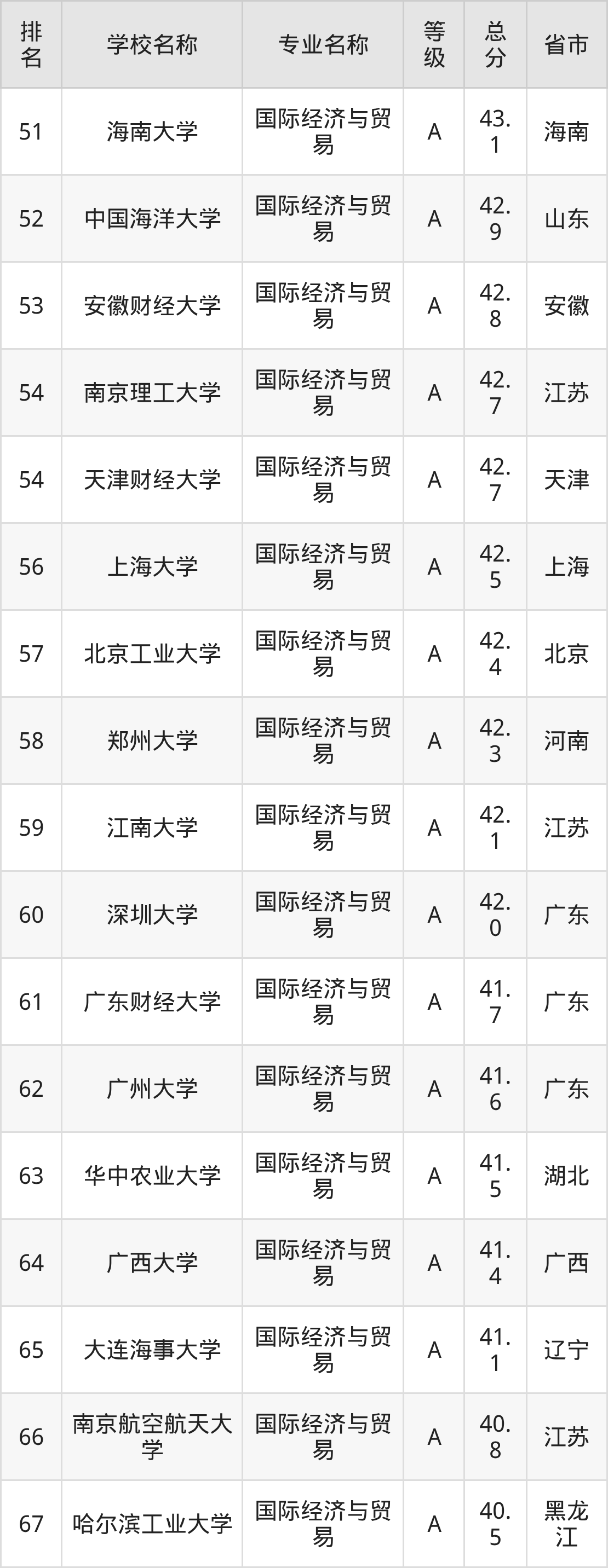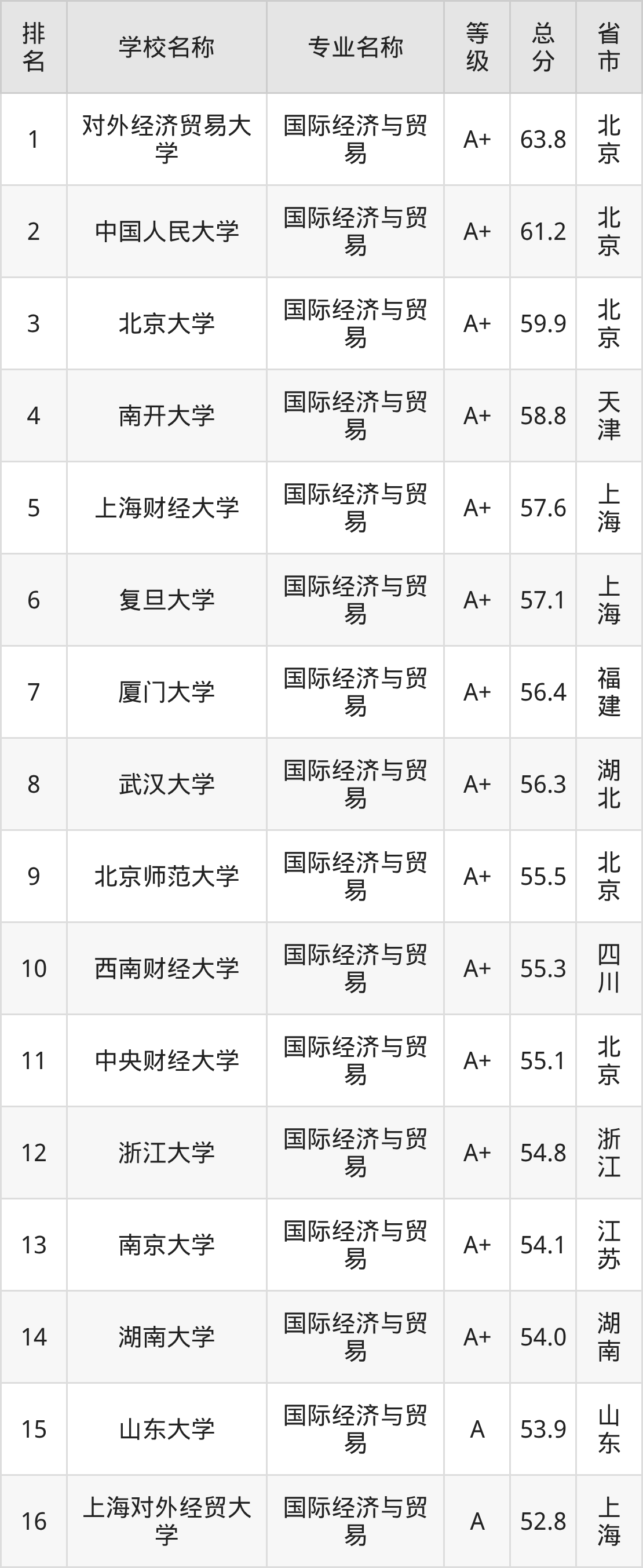 根据软科榜单可知,国际经济与贸易专业全国排名前十的大学分别是: