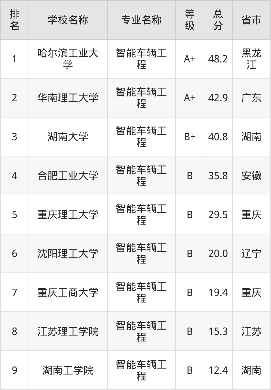 根据软科榜单可知,智能车辆工程专业全国排名前九的大学分别是: