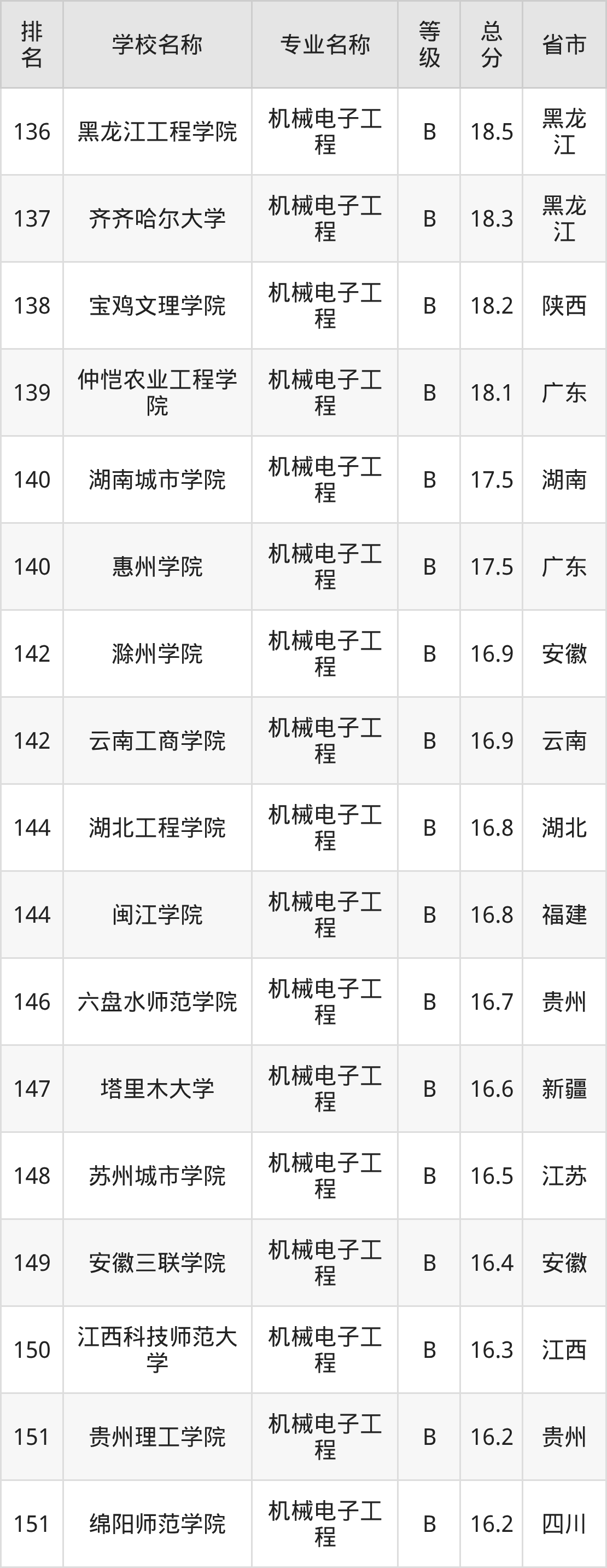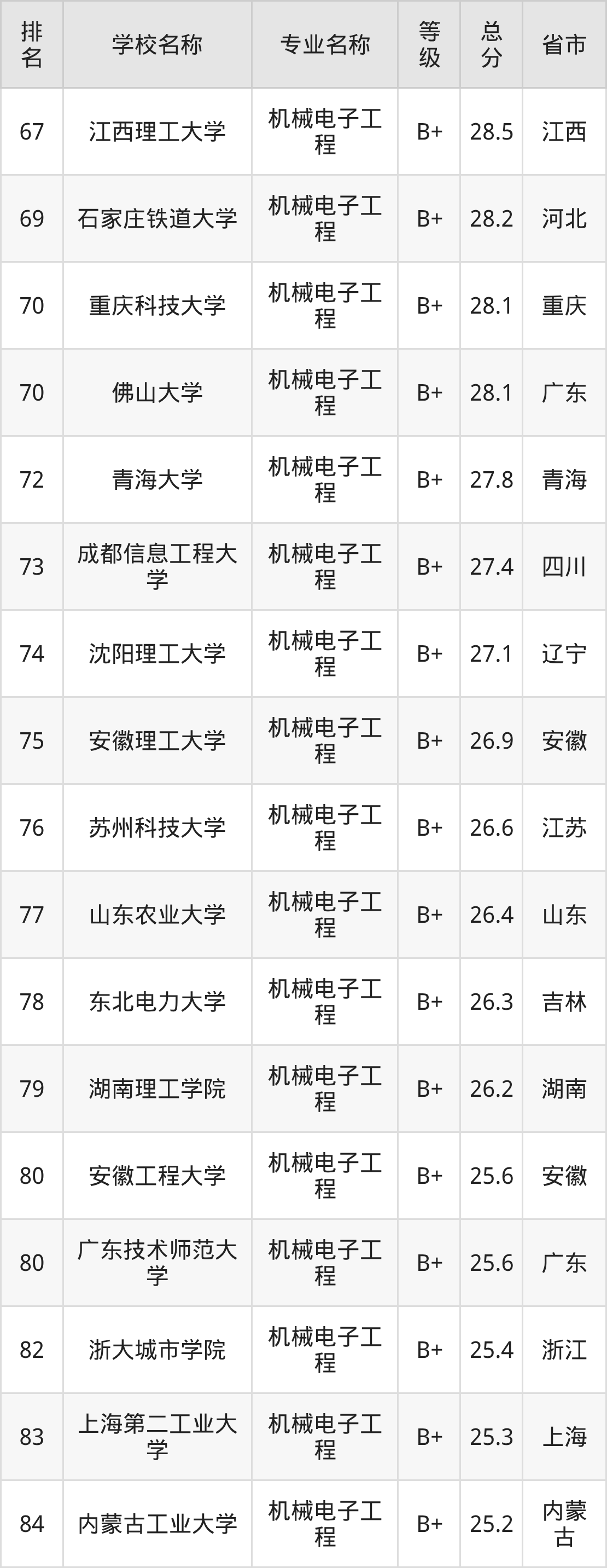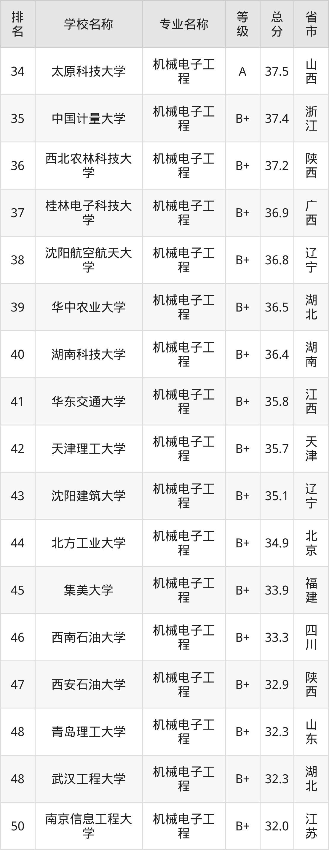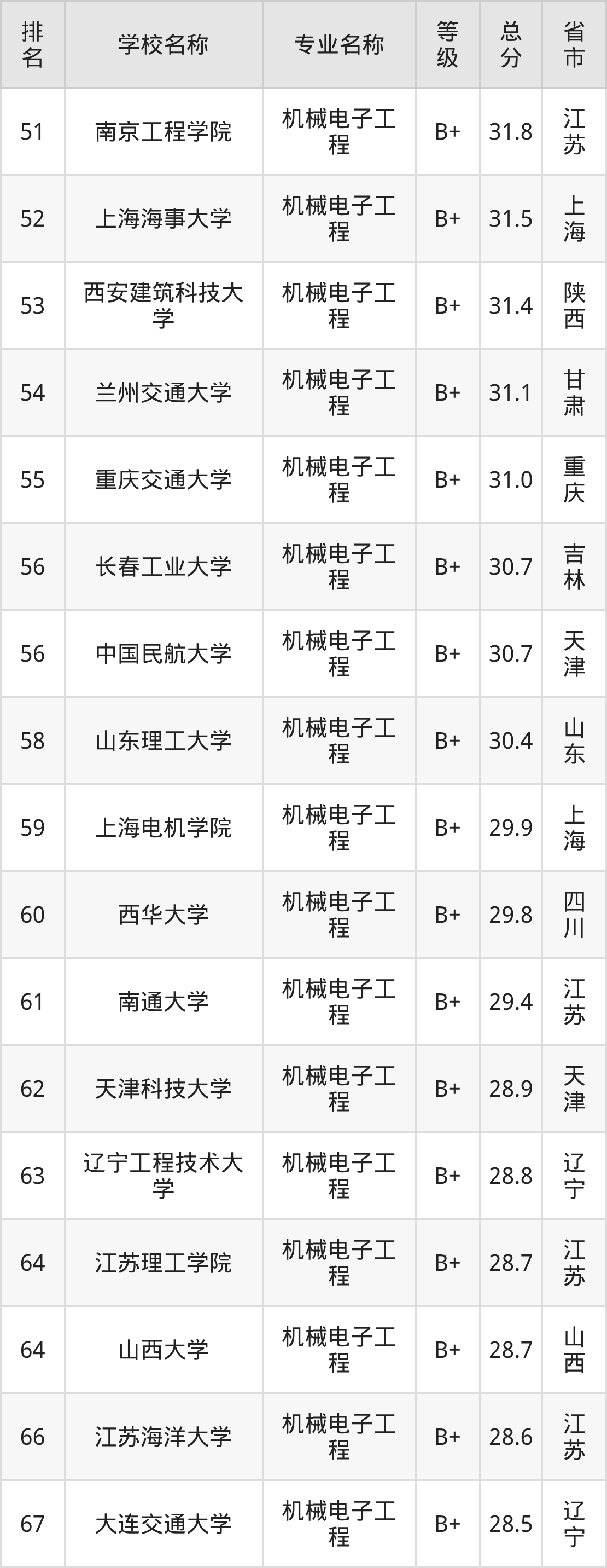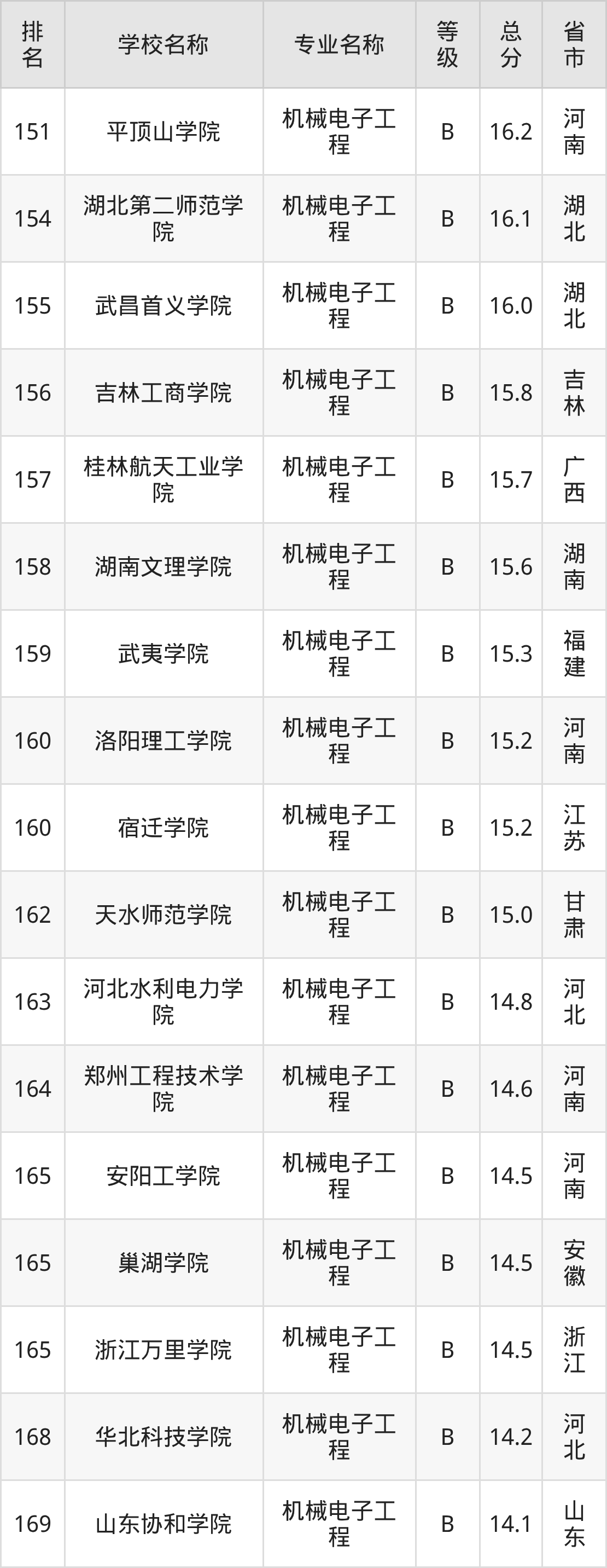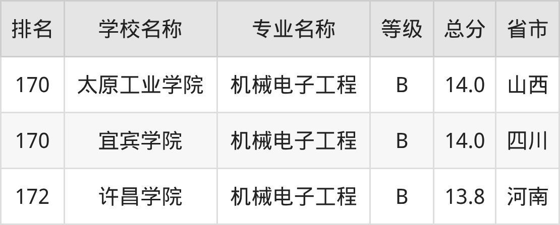 附机械电子工程专业全国172所院校排名榜单一览表!