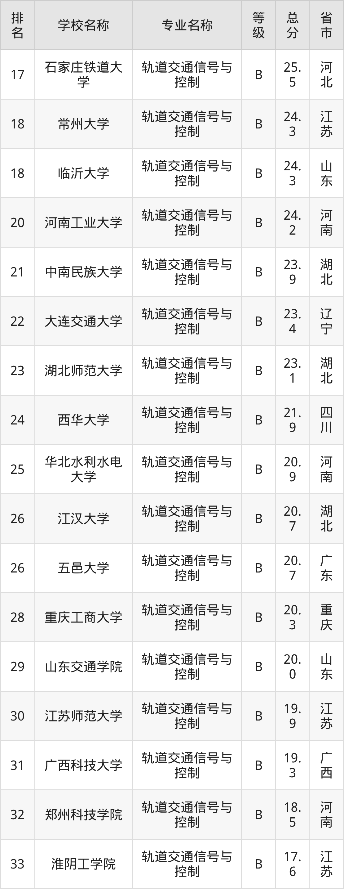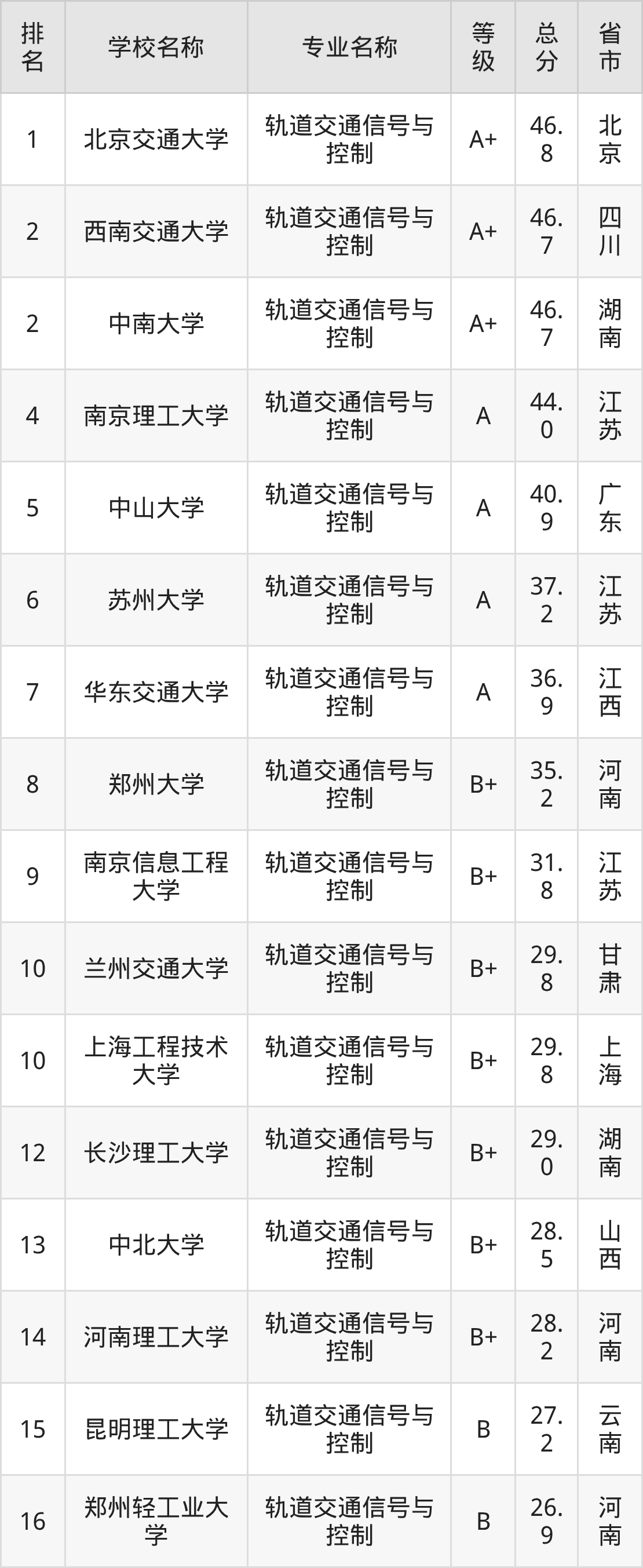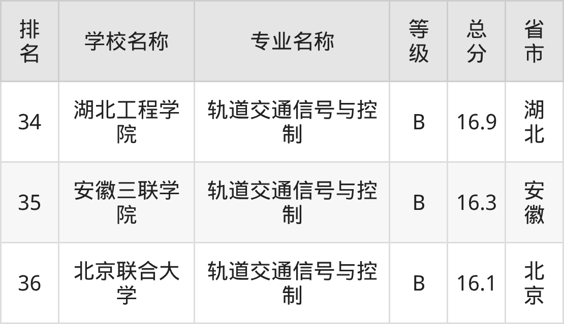 附轨道交通信号与控制专业全国36所院校排名榜单一览表!