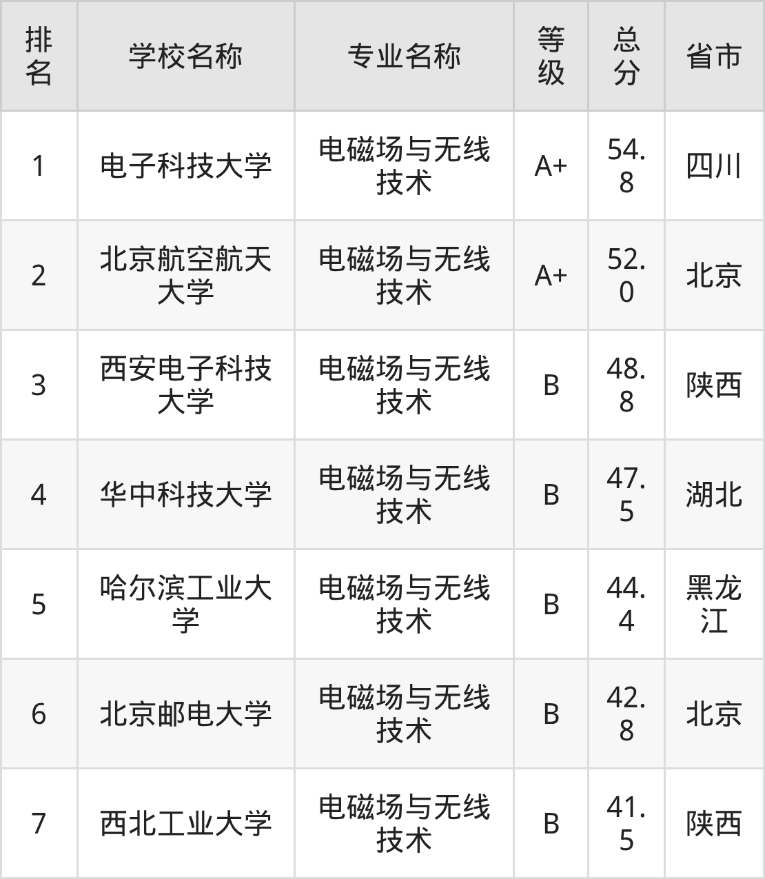根据软科榜单可知,电磁场与无线技术专业全国排名前七的大学分别是: