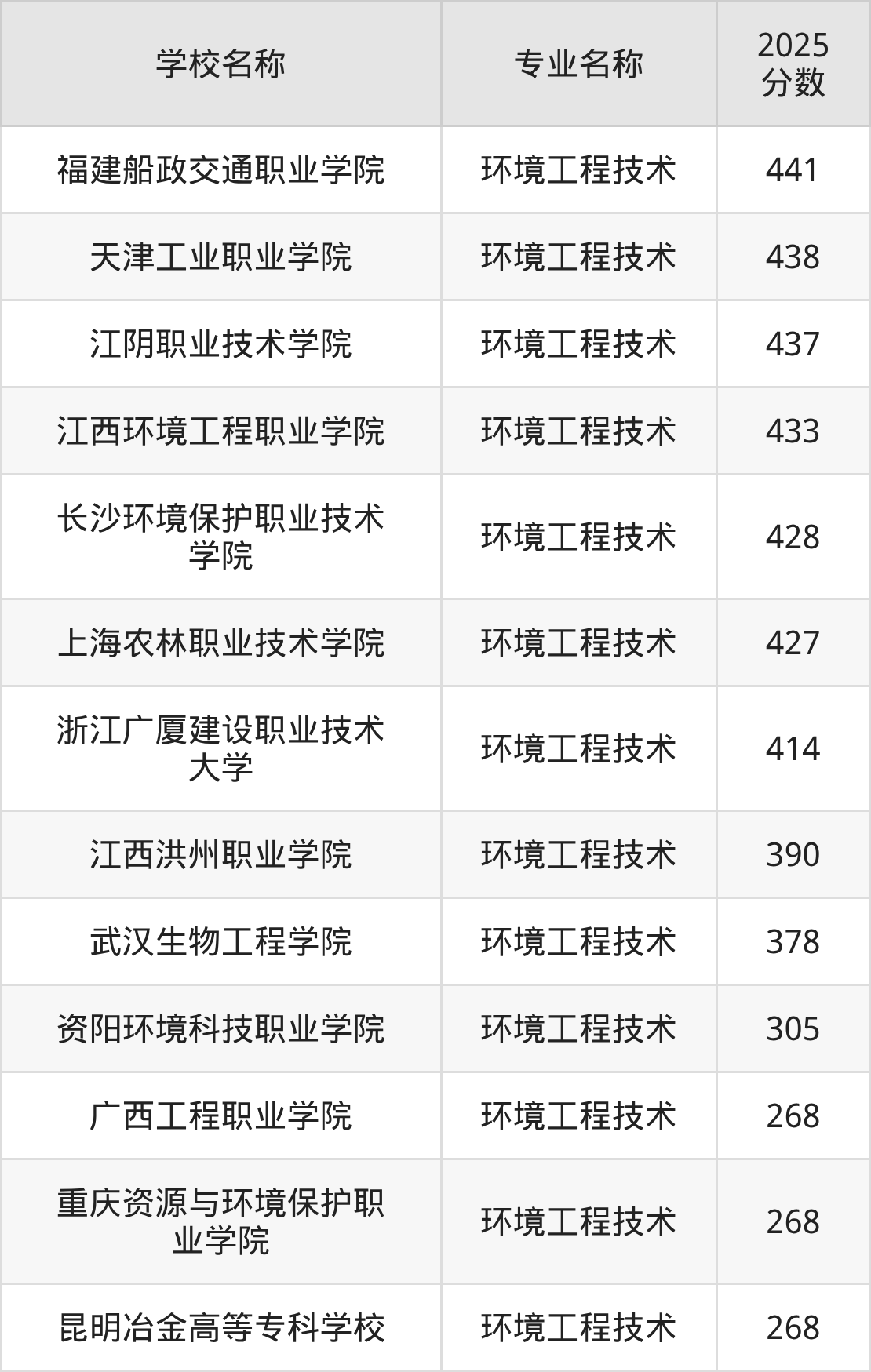 下面是2025年全国专科环境工程技术专业大学录取分数线。