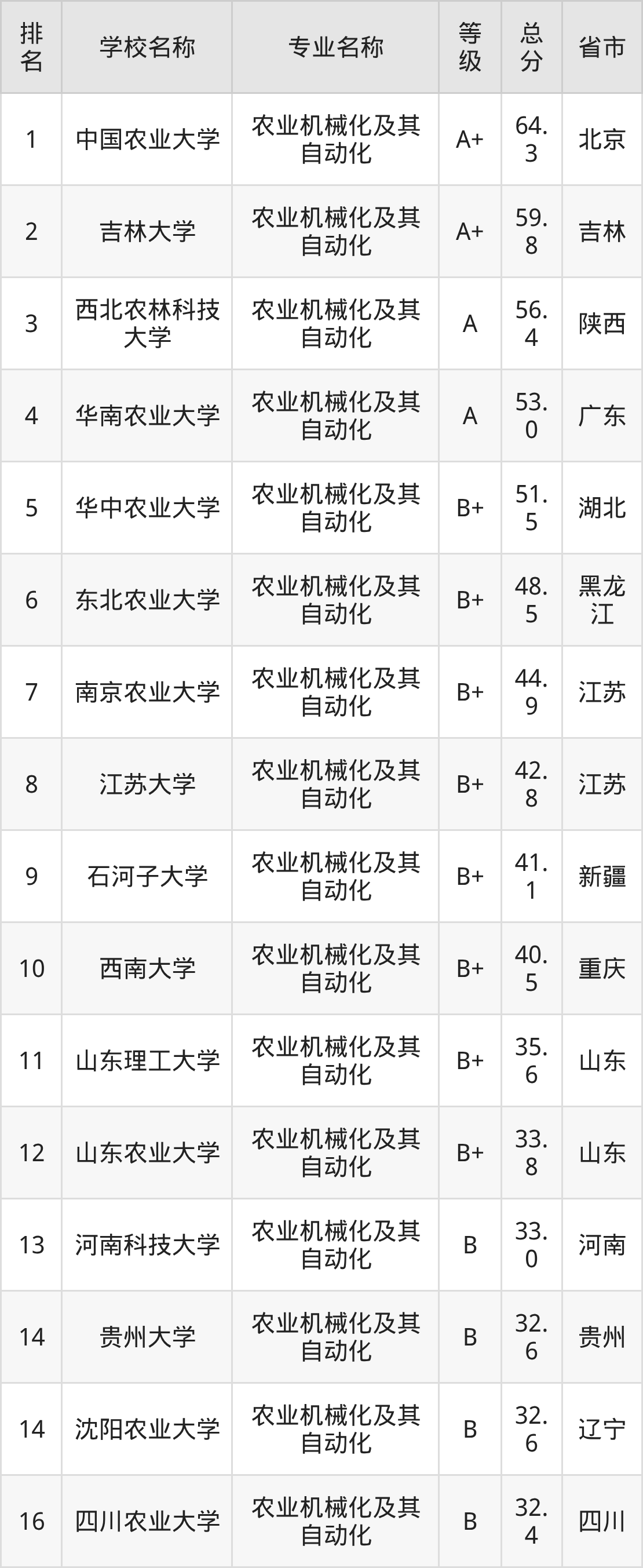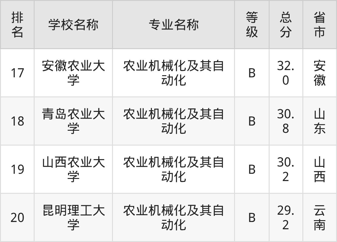附农业机械化及其自动化专业全国20所院校排名榜单一览表!