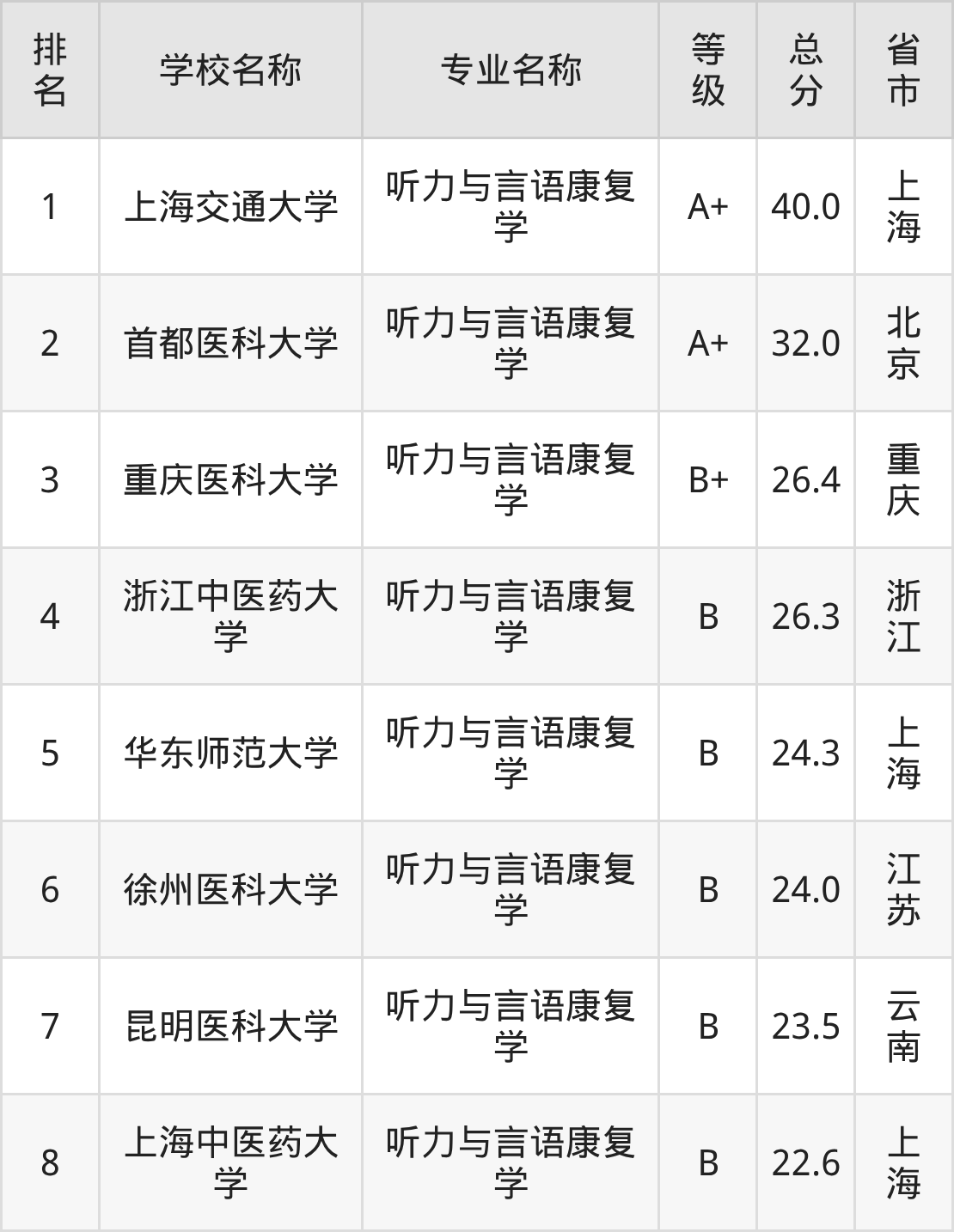 根据软科榜单可知,听力与言语康复学专业全国排名前八的大学分别是: