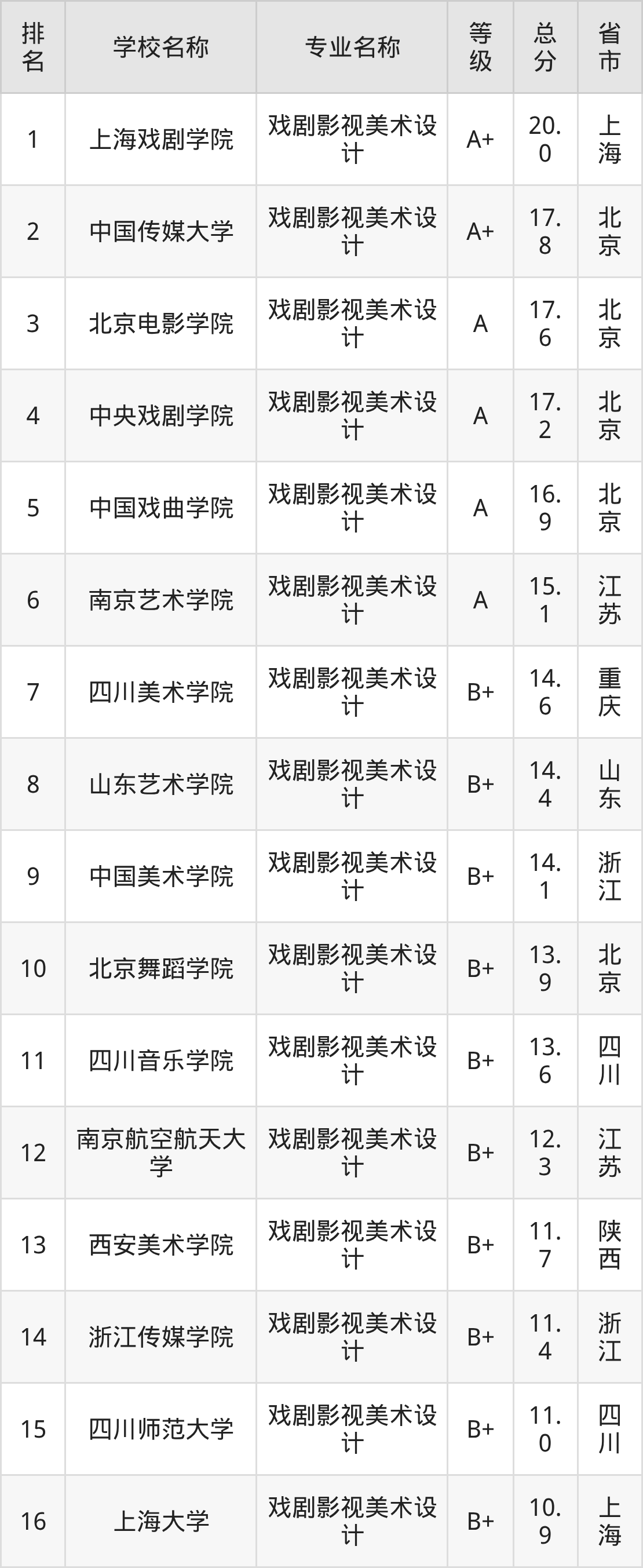 根据软科榜单可知,戏剧影视美术设计专业全国排名前十的大学分别是: