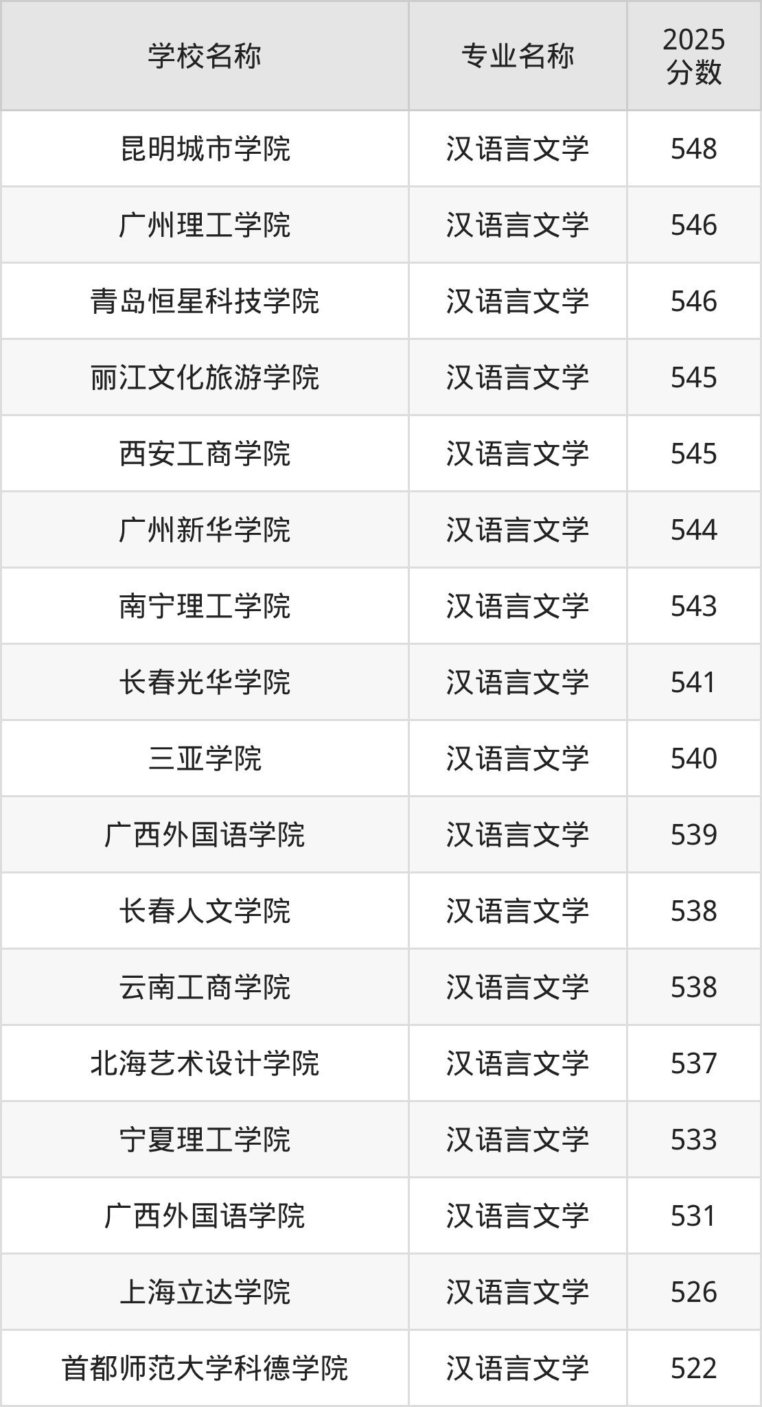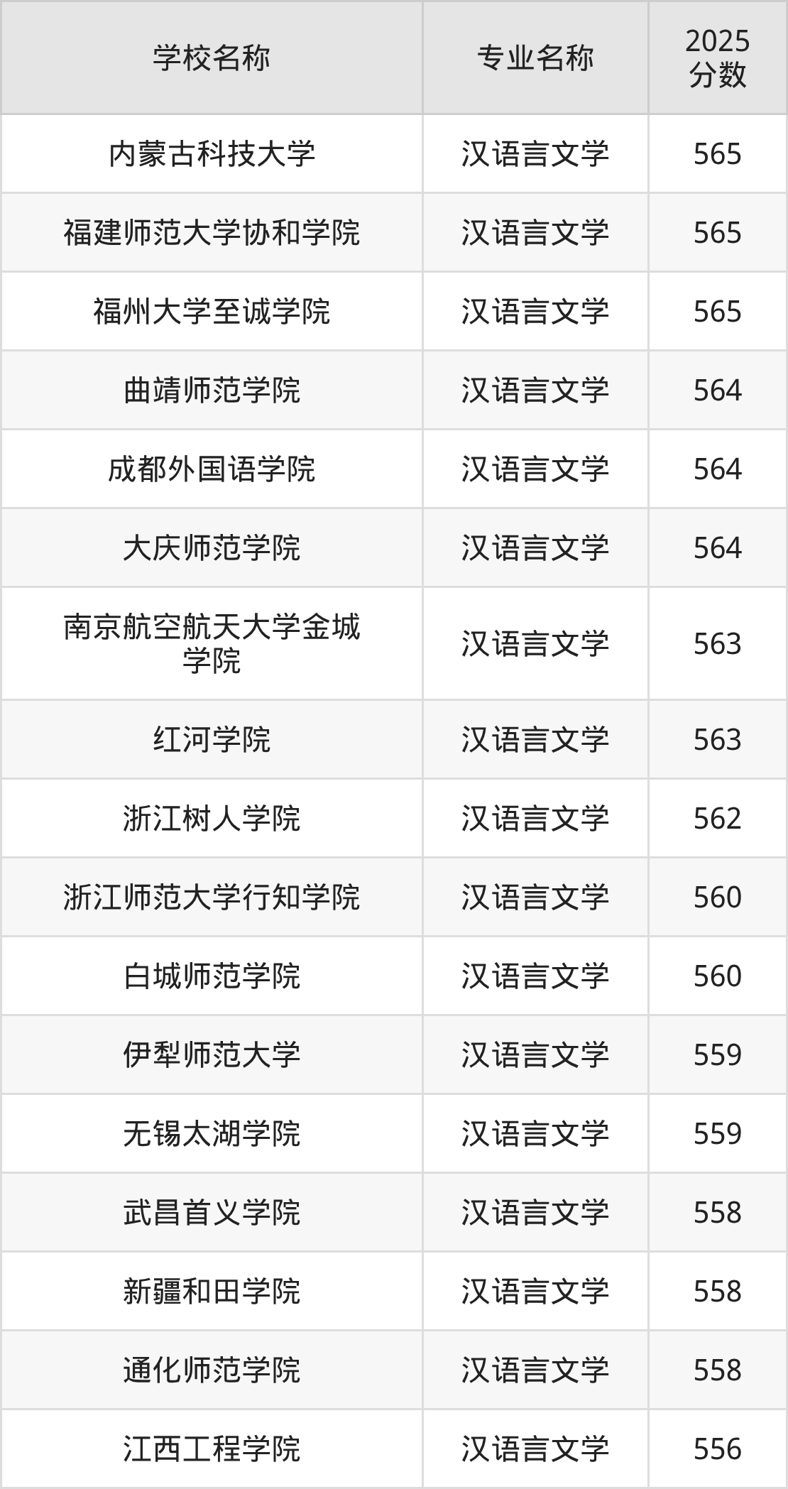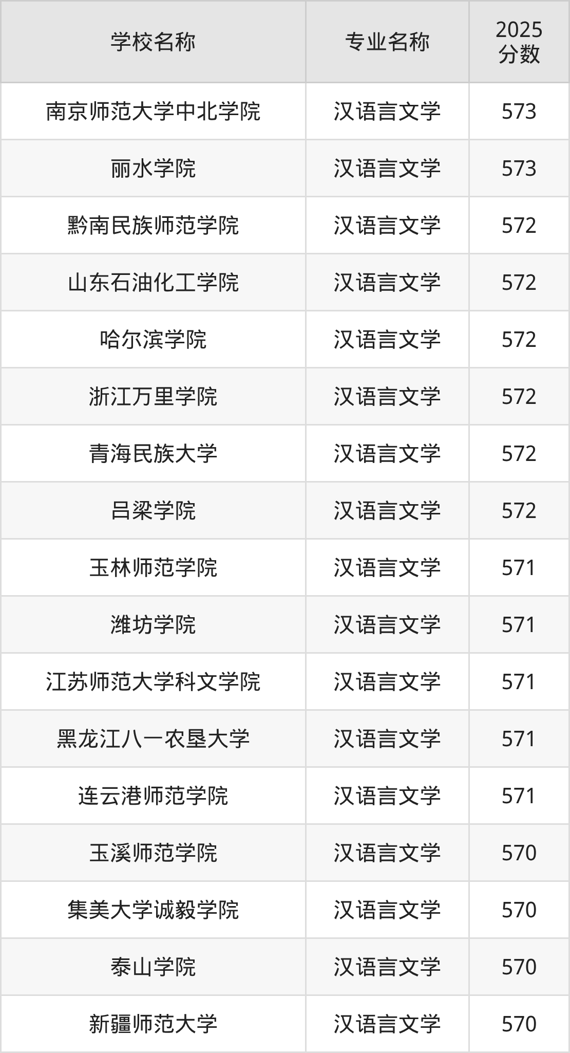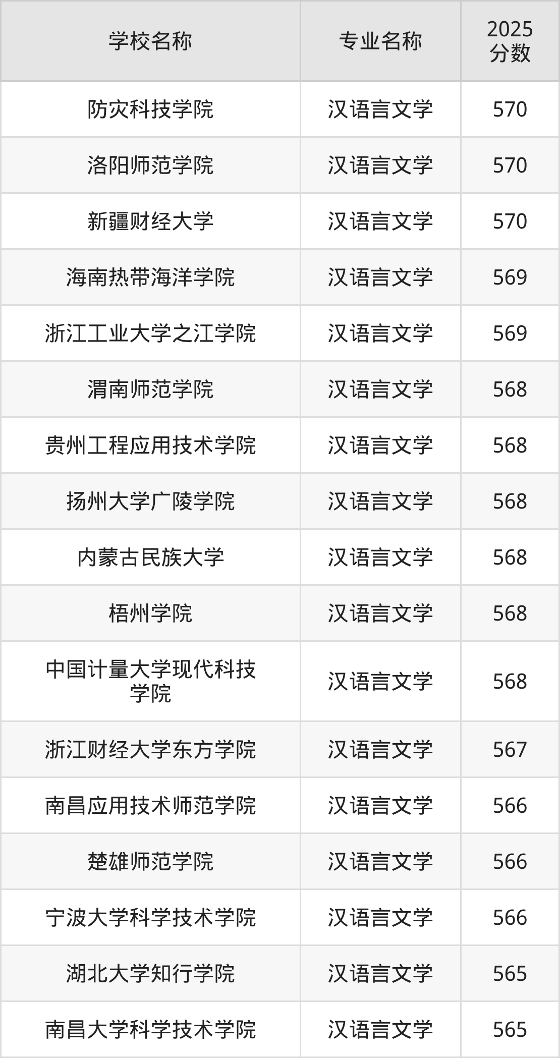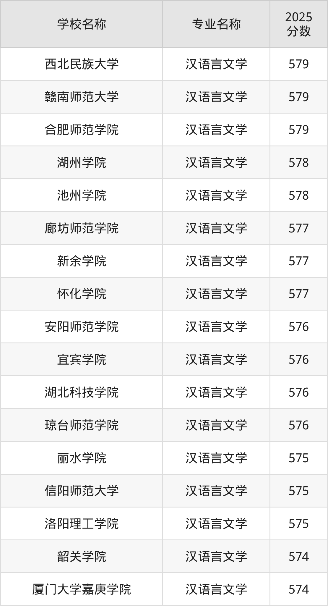 下面是2025年全国本科汉语言文学专业大学录取分数线。
