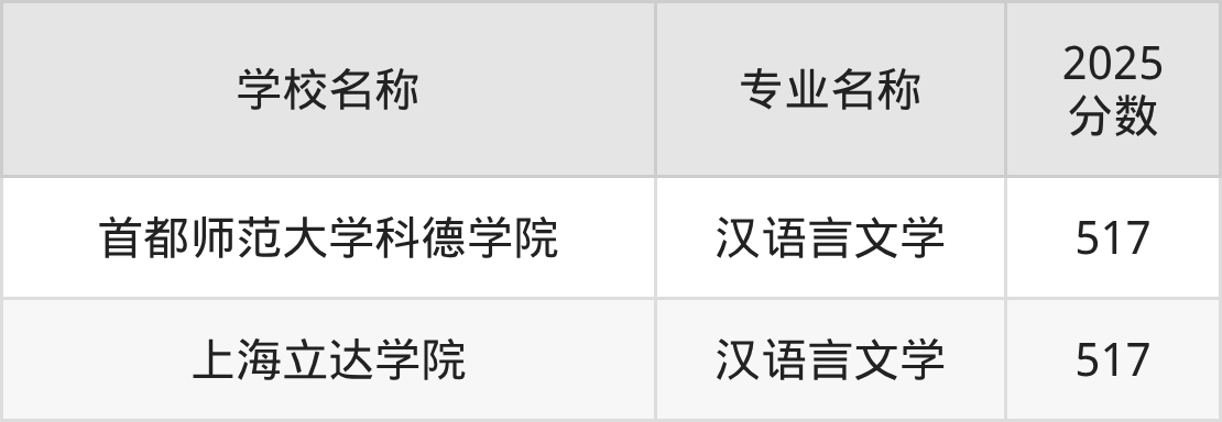 汉语言文学专业本科最低录取分数线:517分,对应学校是上海立达学院。