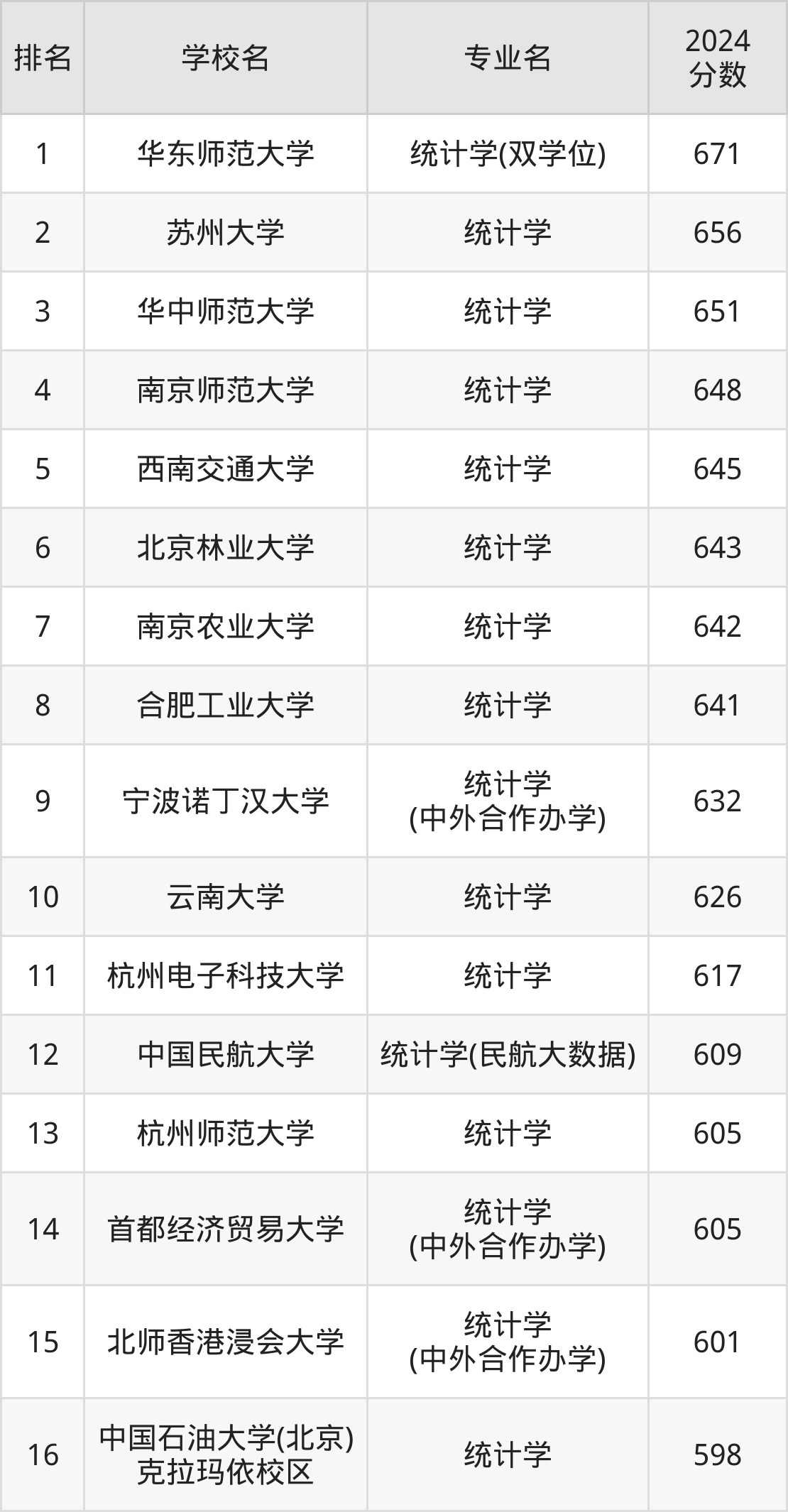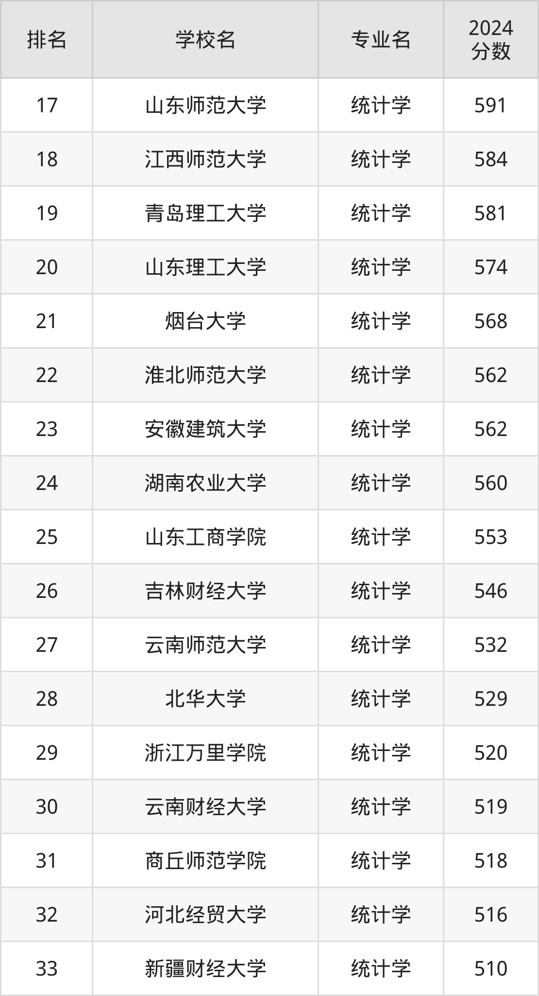 (注:不包含把统计学专业列在大类专业中招生的名校)