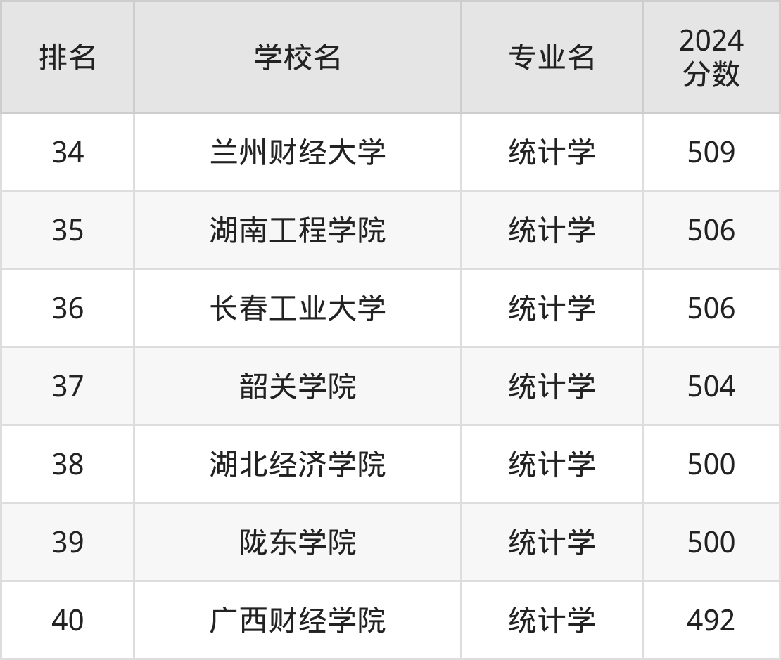 统计学专业排名前40的大学中,收分较低的有广西财经学院(492分)、陇东学院(500分)、湖北经济学院(500分)、韶关学院(504分)、长春工业大学(506分)。