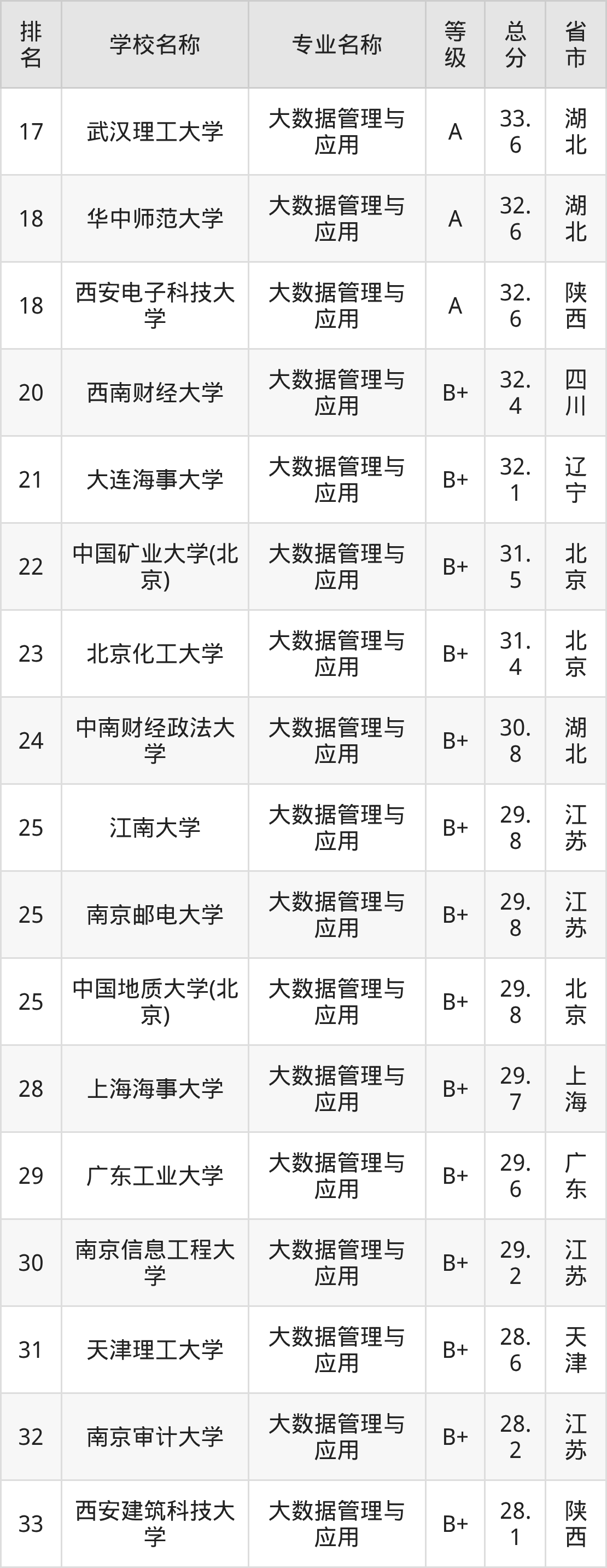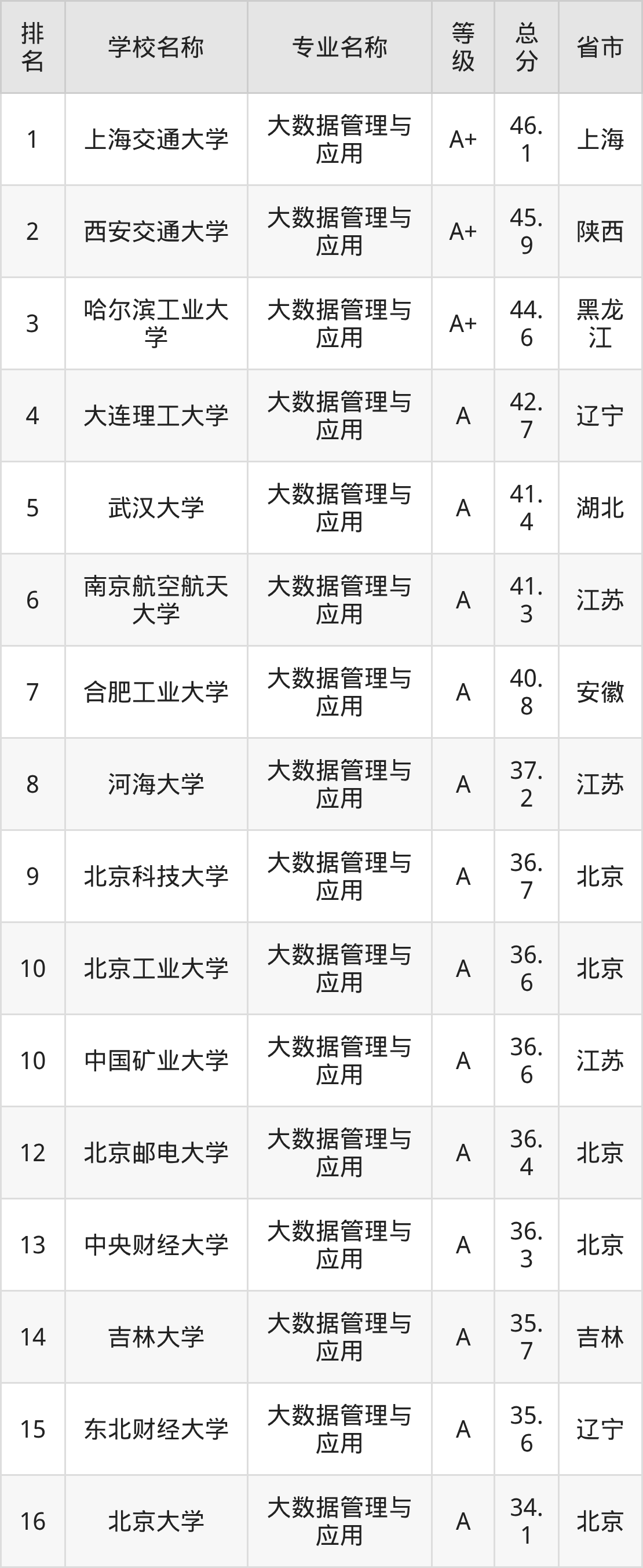 根据软科榜单可知,大数据管理与应用专业全国排名前十的大学分别是: