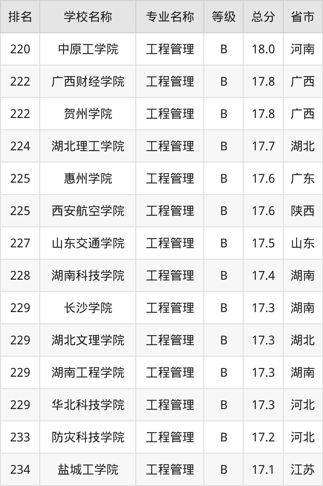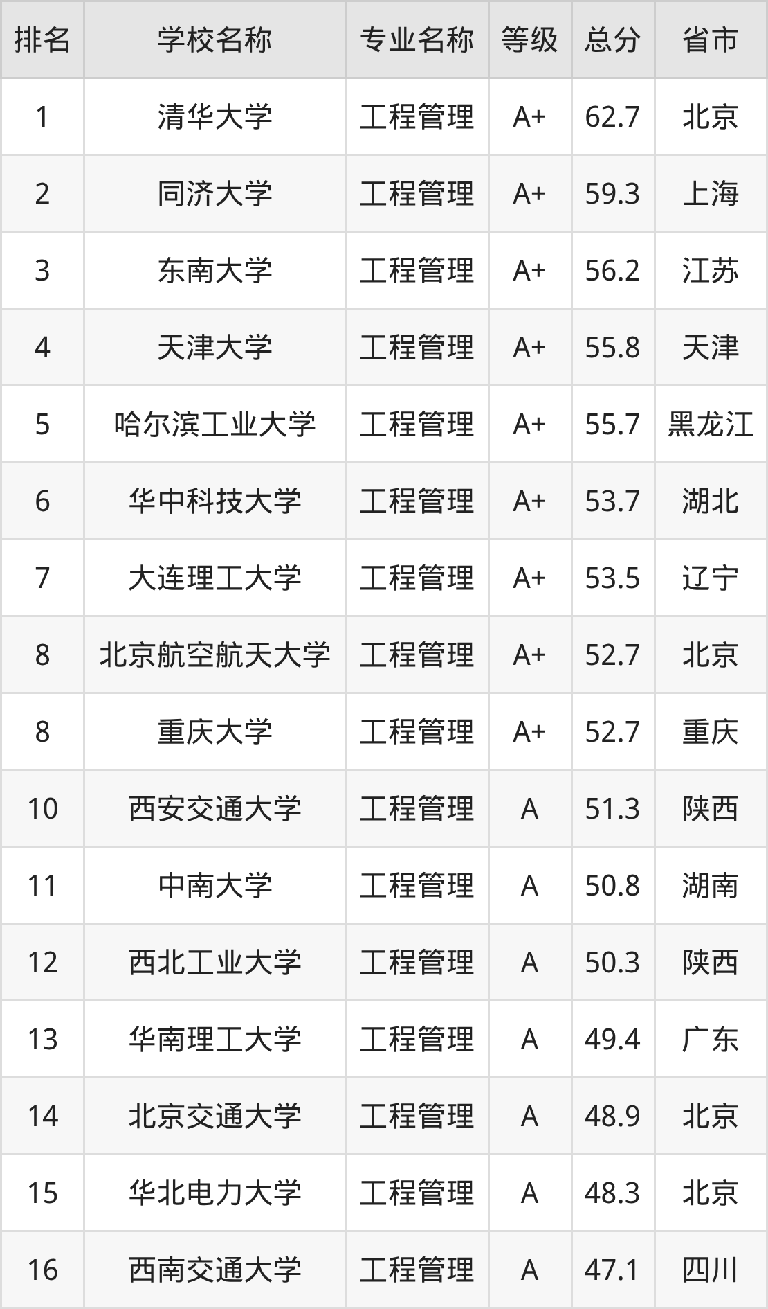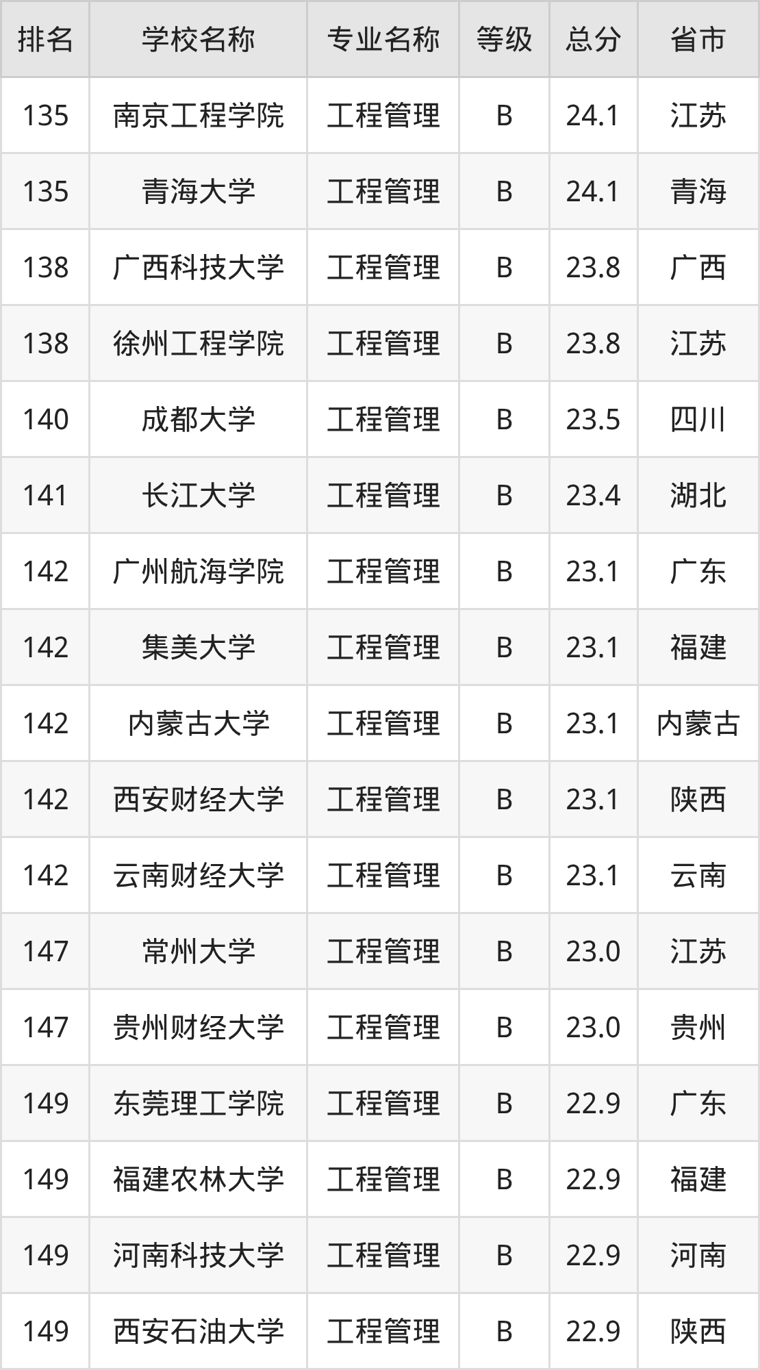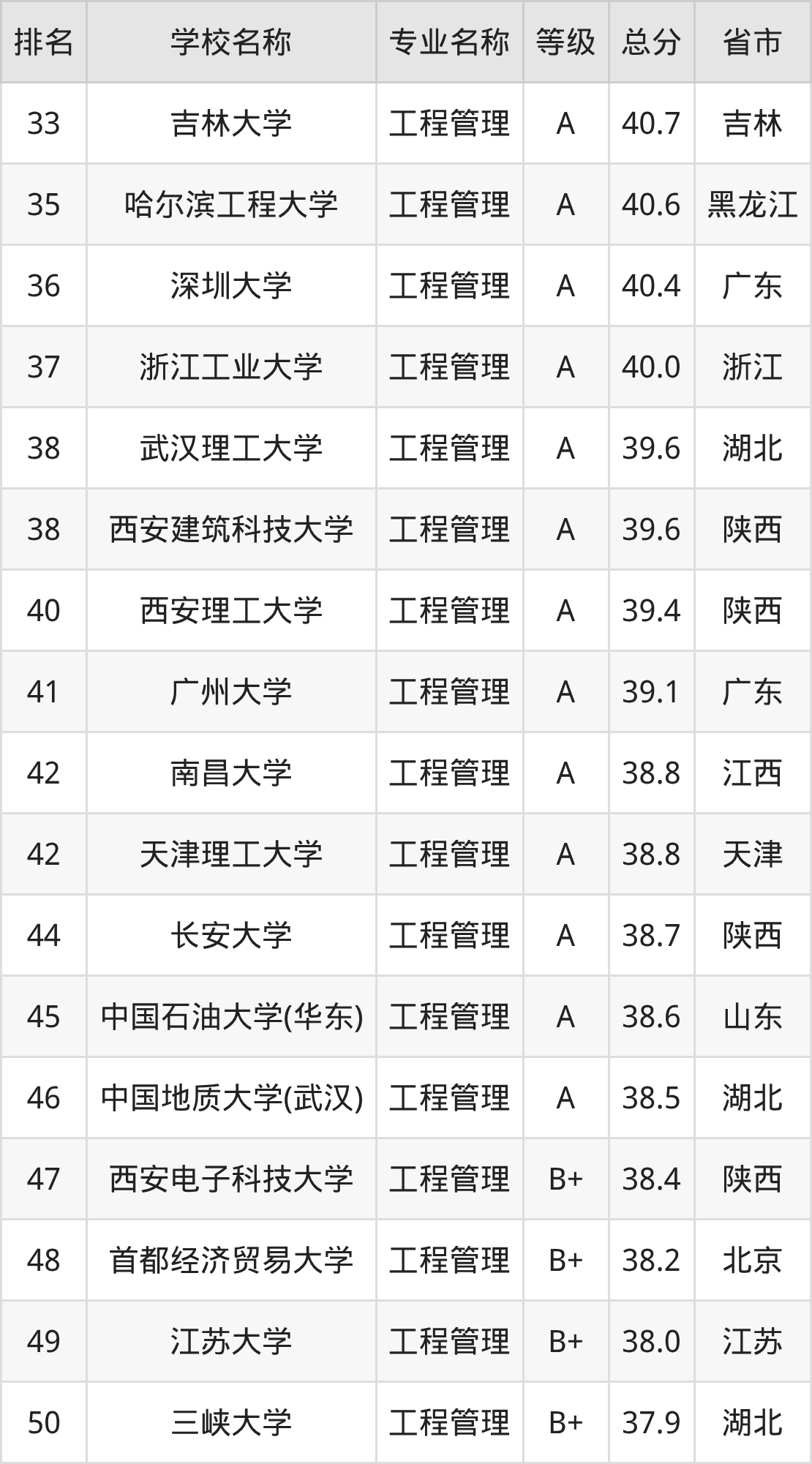 附工程管理专业全国234所院校排名榜单一览表!