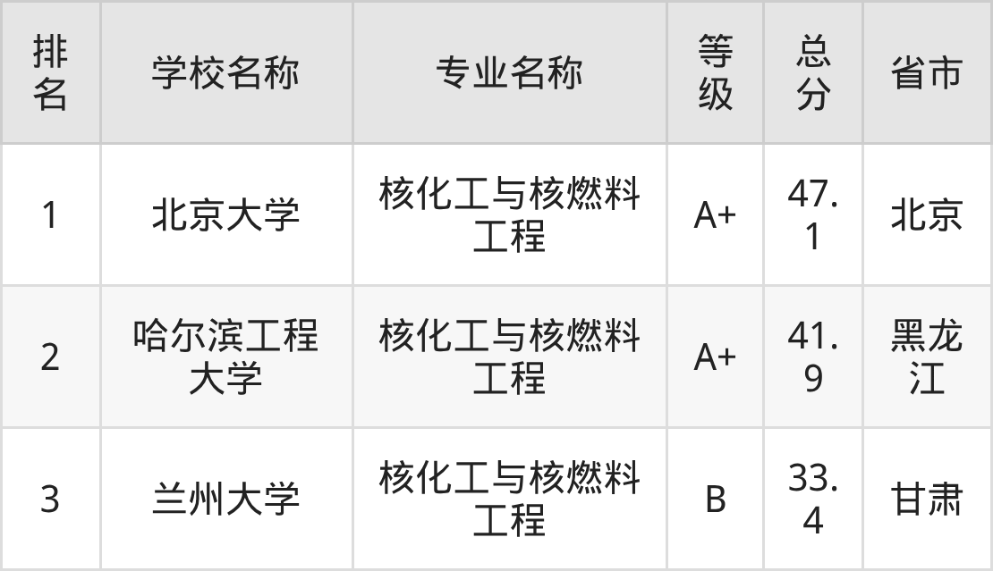 根据软科榜单可知,核化工与核燃料工程专业全国排名前三的大学分别是: