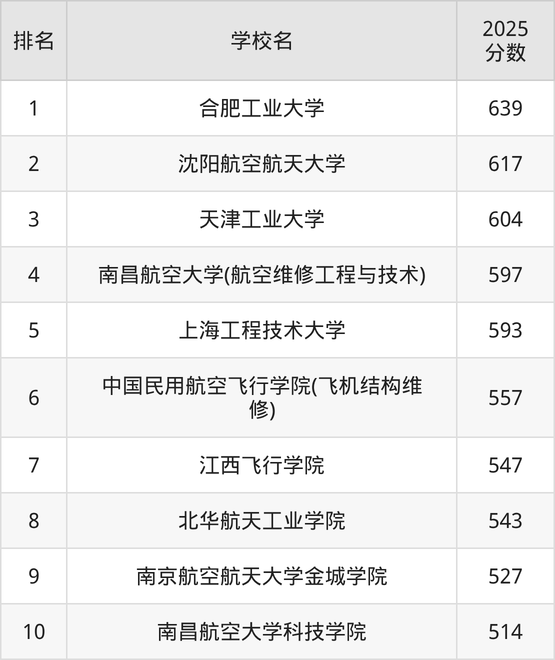 根据软科2025最新排名可知,飞行器制造工程专业最好的十所名校名单如下: