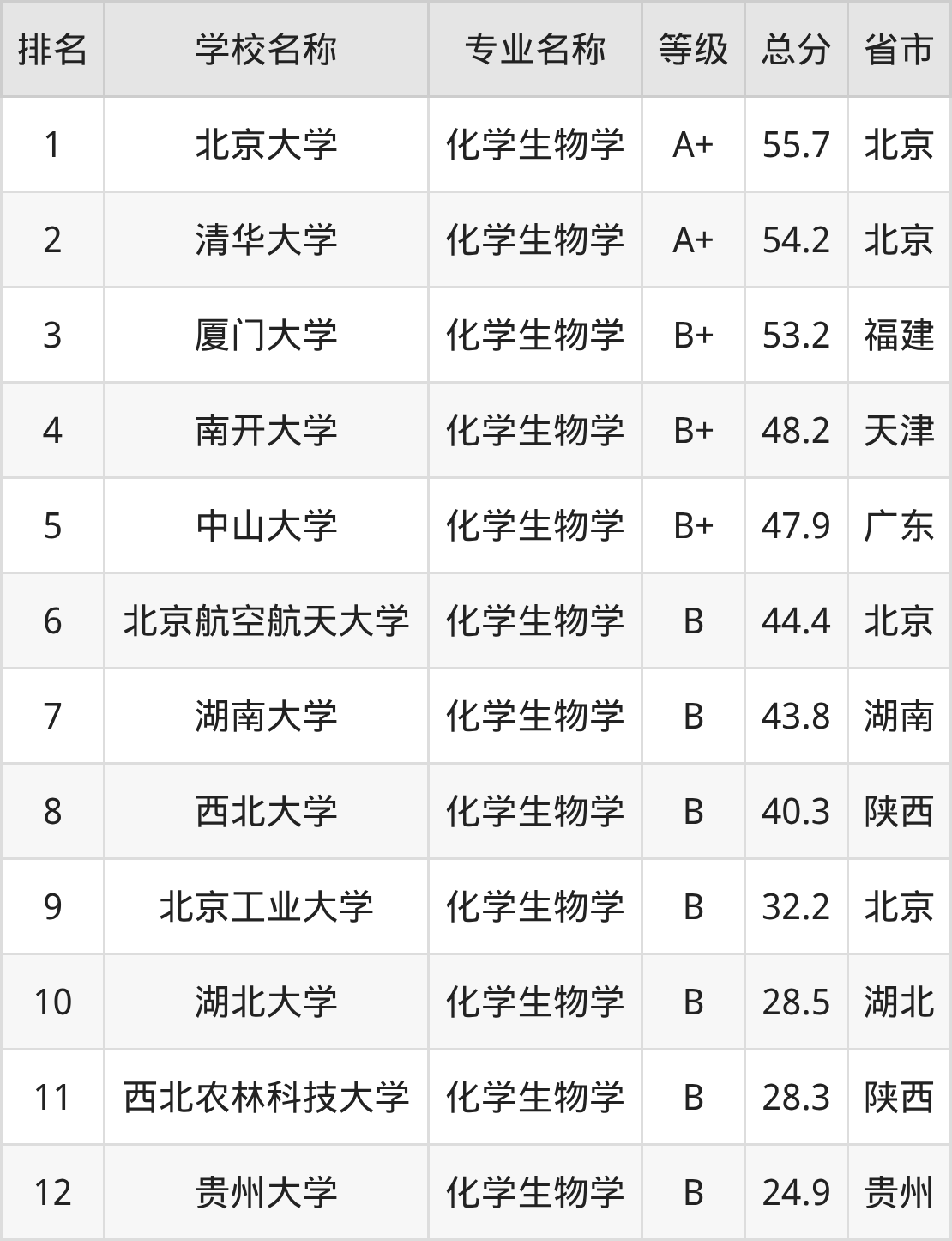 根据软科榜单可知,化学生物学专业全国排名前十的大学分别是: