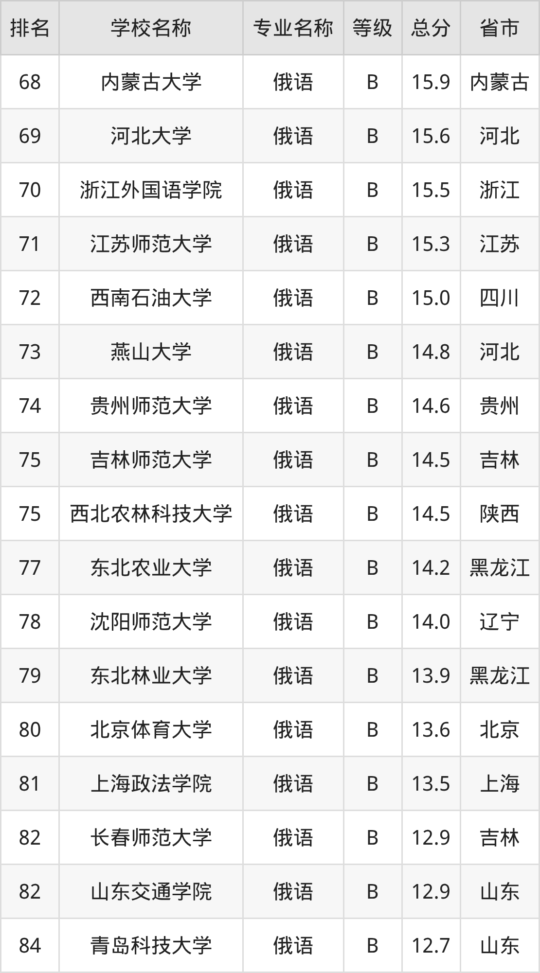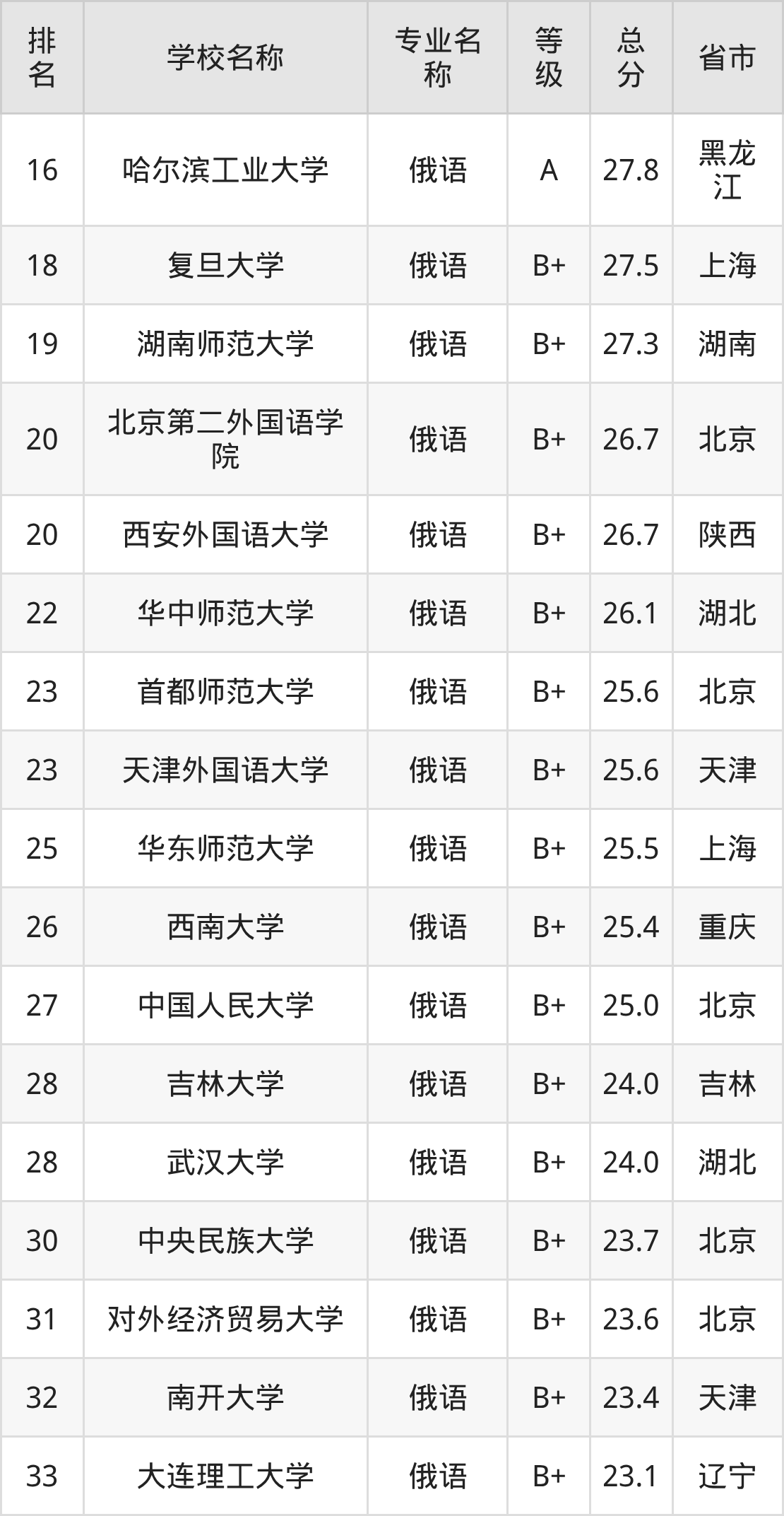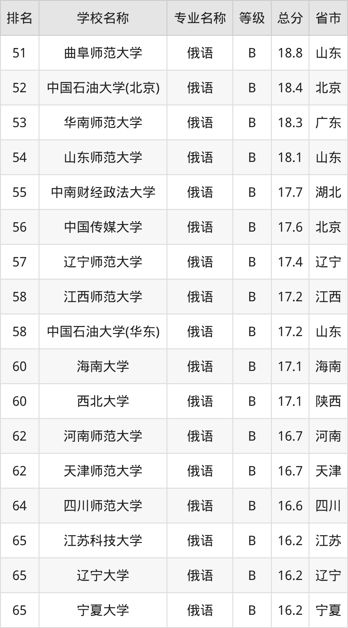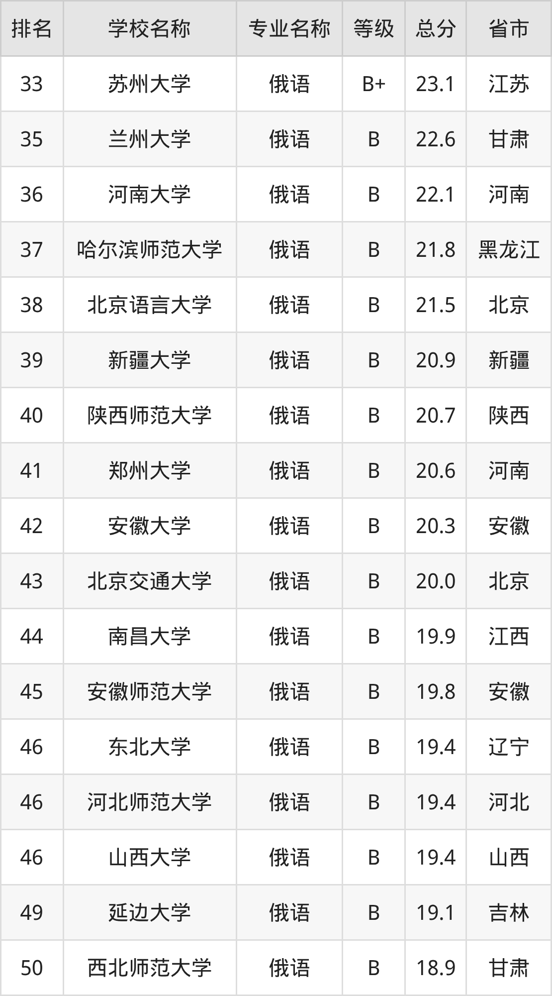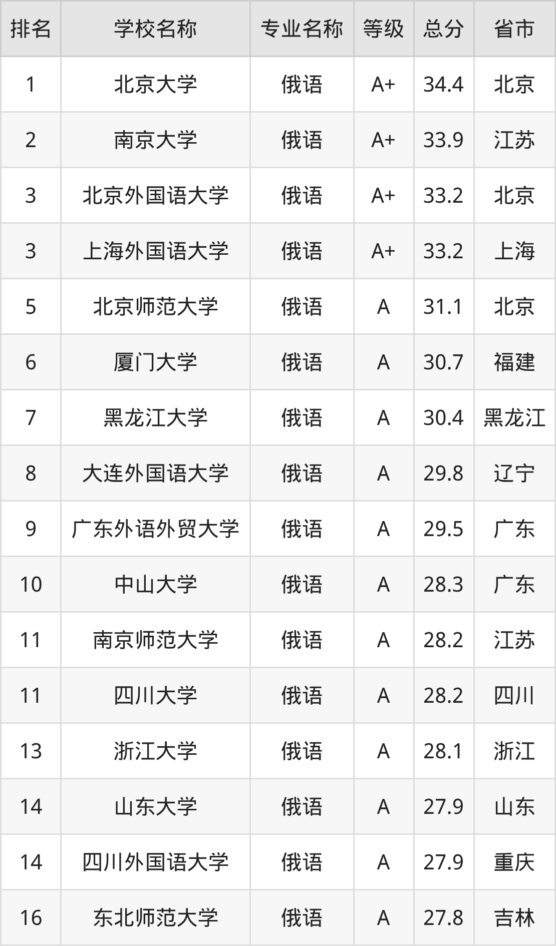 根据软科榜单可知,俄语专业全国排名前十的大学分别是:
