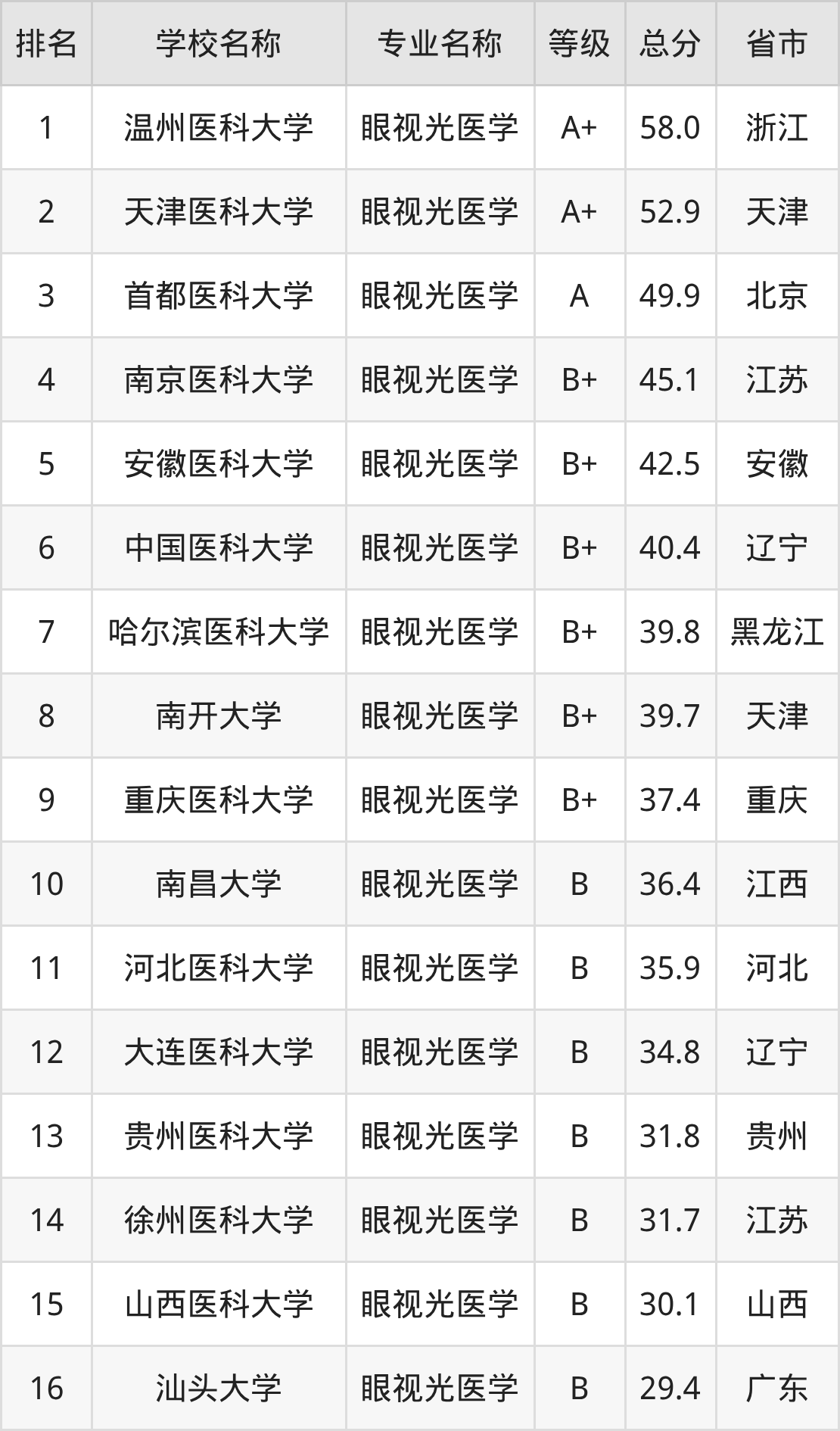 附眼视光医学专业全国16所院校排名榜单一览表!