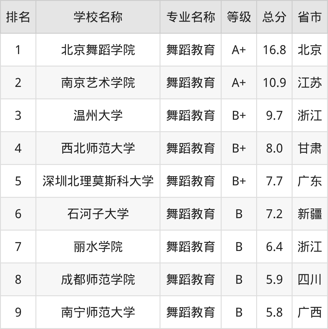 根据软科榜单可知,舞蹈教育专业全国排名前九的大学分别是: