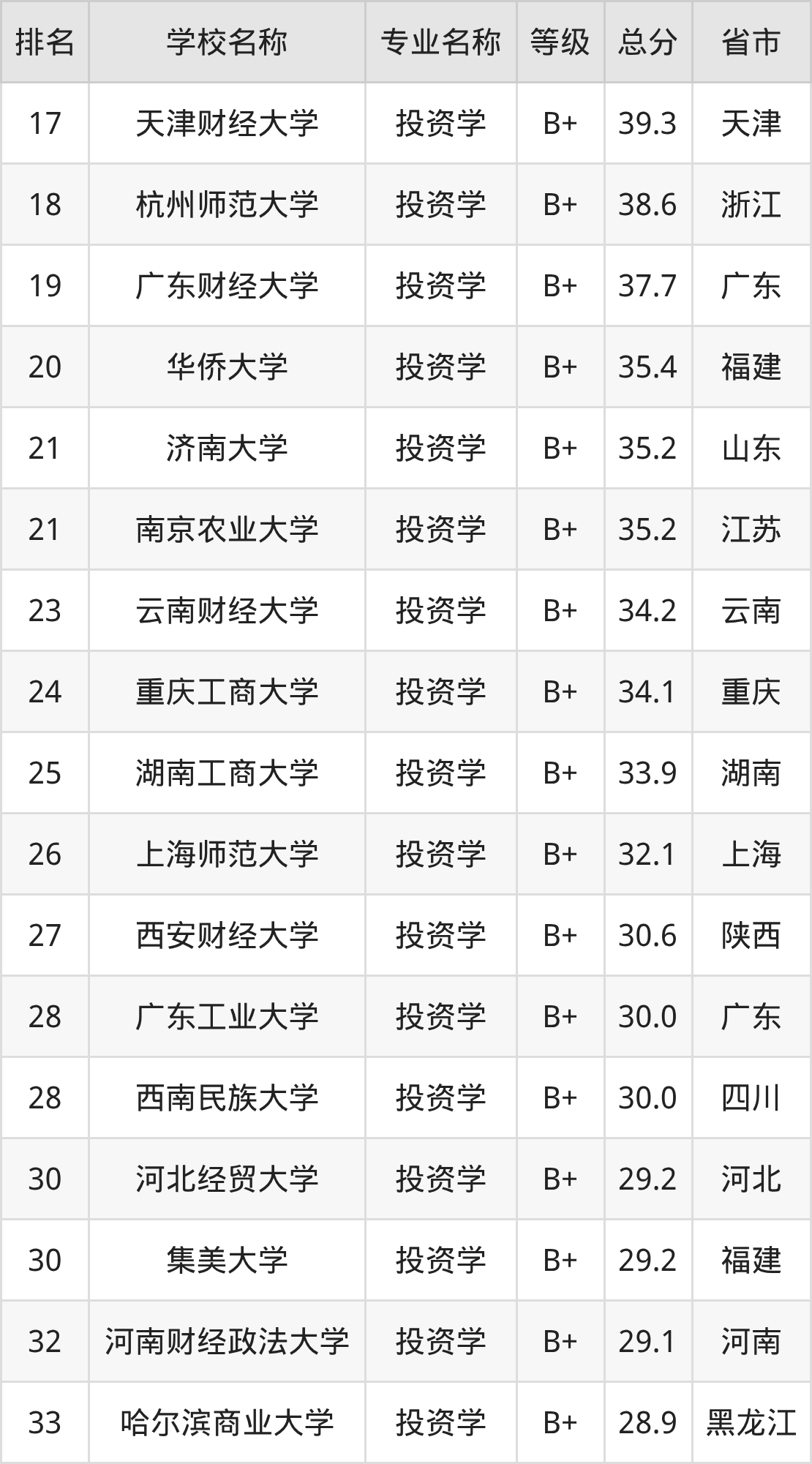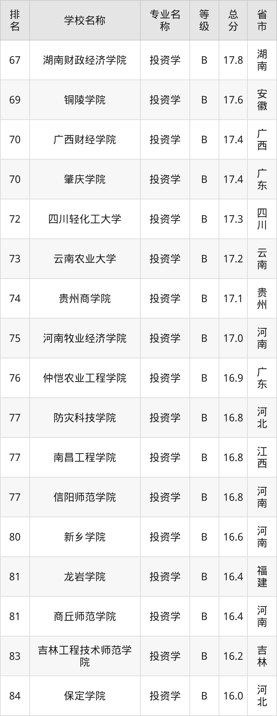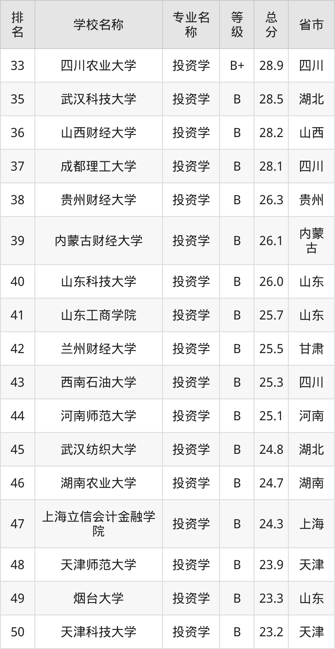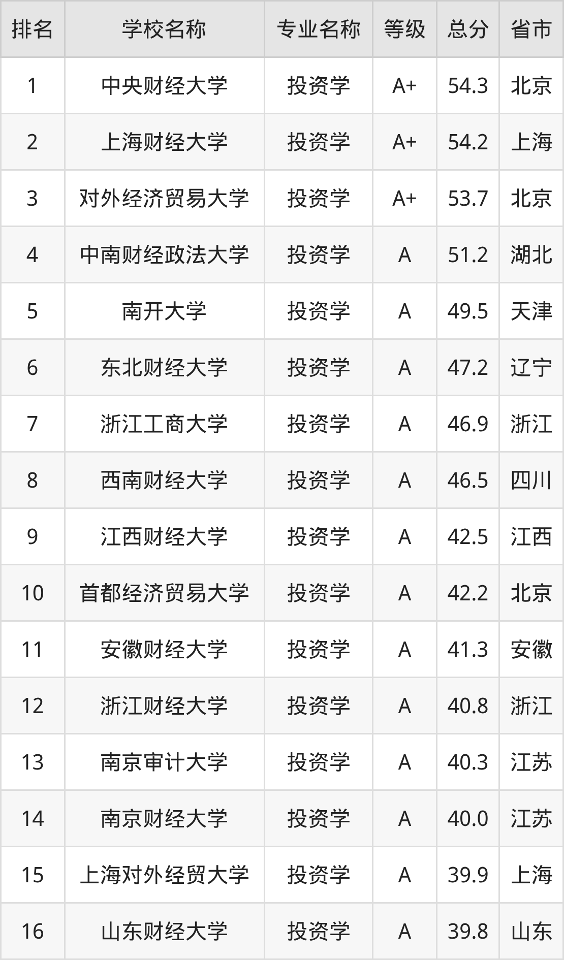 根据软科榜单可知,投资学专业全国排名前十的大学分别是: