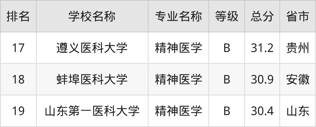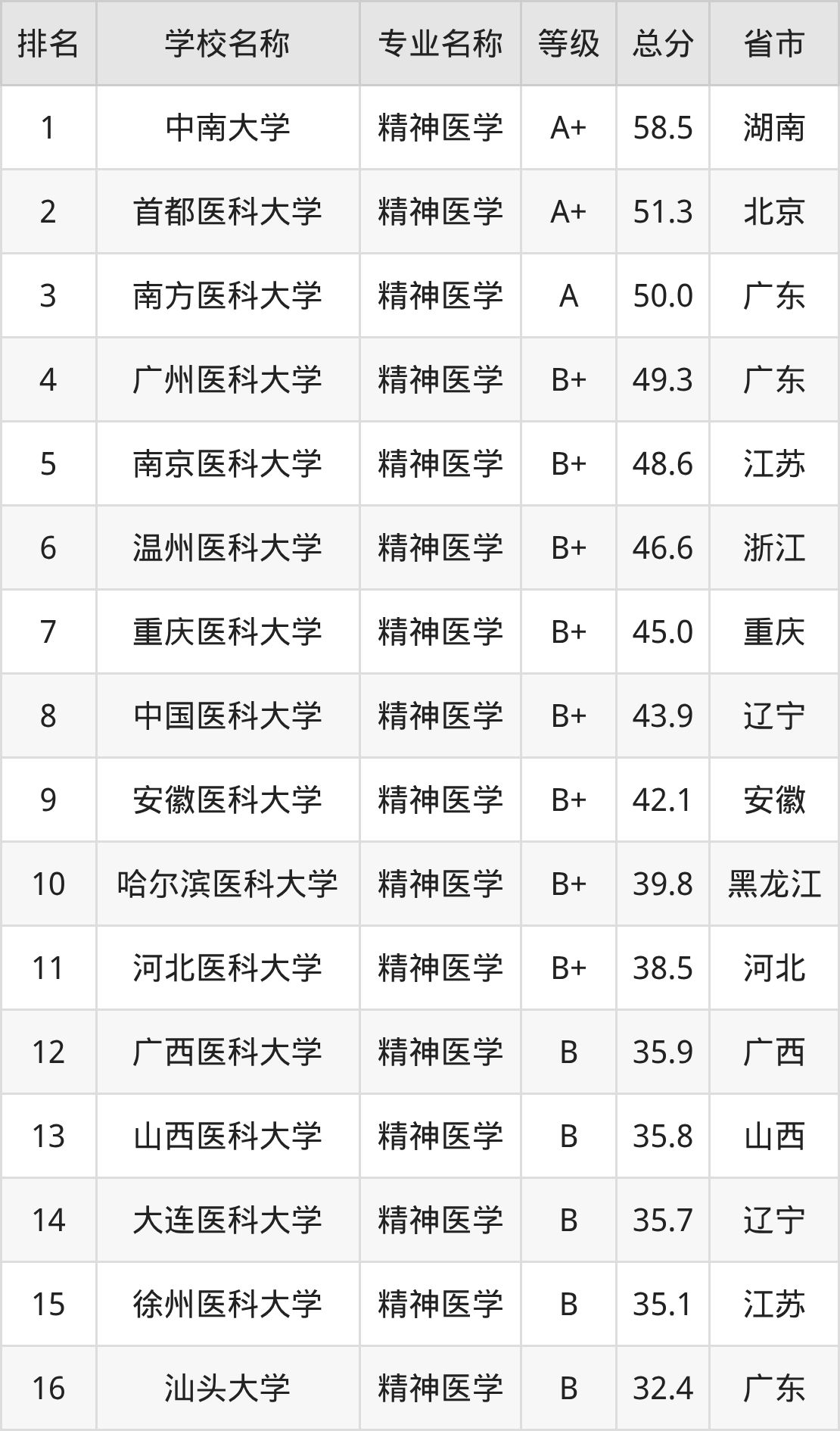 根据软科榜单可知,精神医学专业全国排名前十的大学分别是: