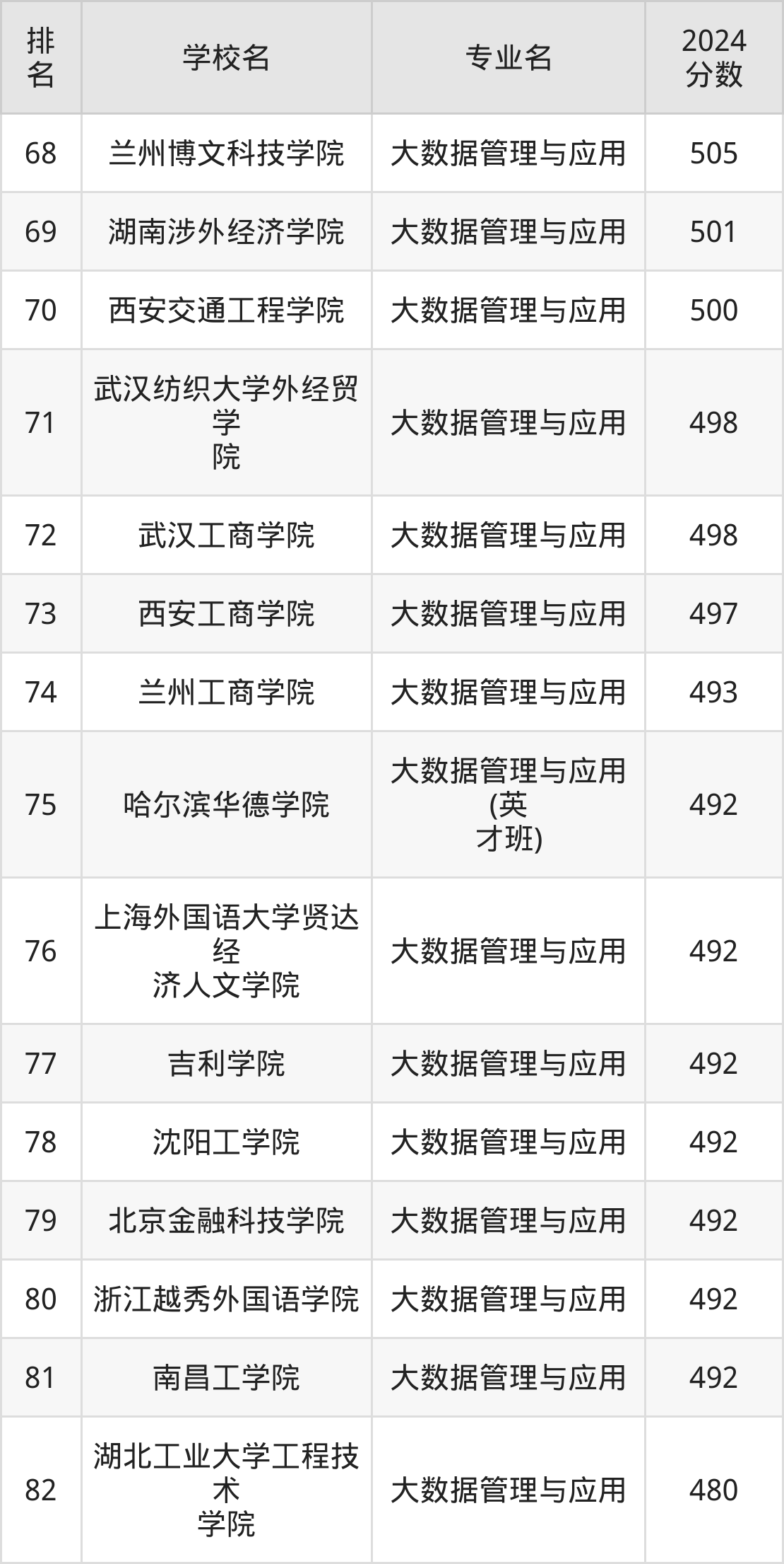 大数据管理与应用专业排名前90的大学中,收分较低的有湖北工业大学工程技术学院(480分)、南昌工学院(492分)、浙江越秀外国语学院(492分)、北京金融科技学院(492分)、沈阳工学院(492分)。