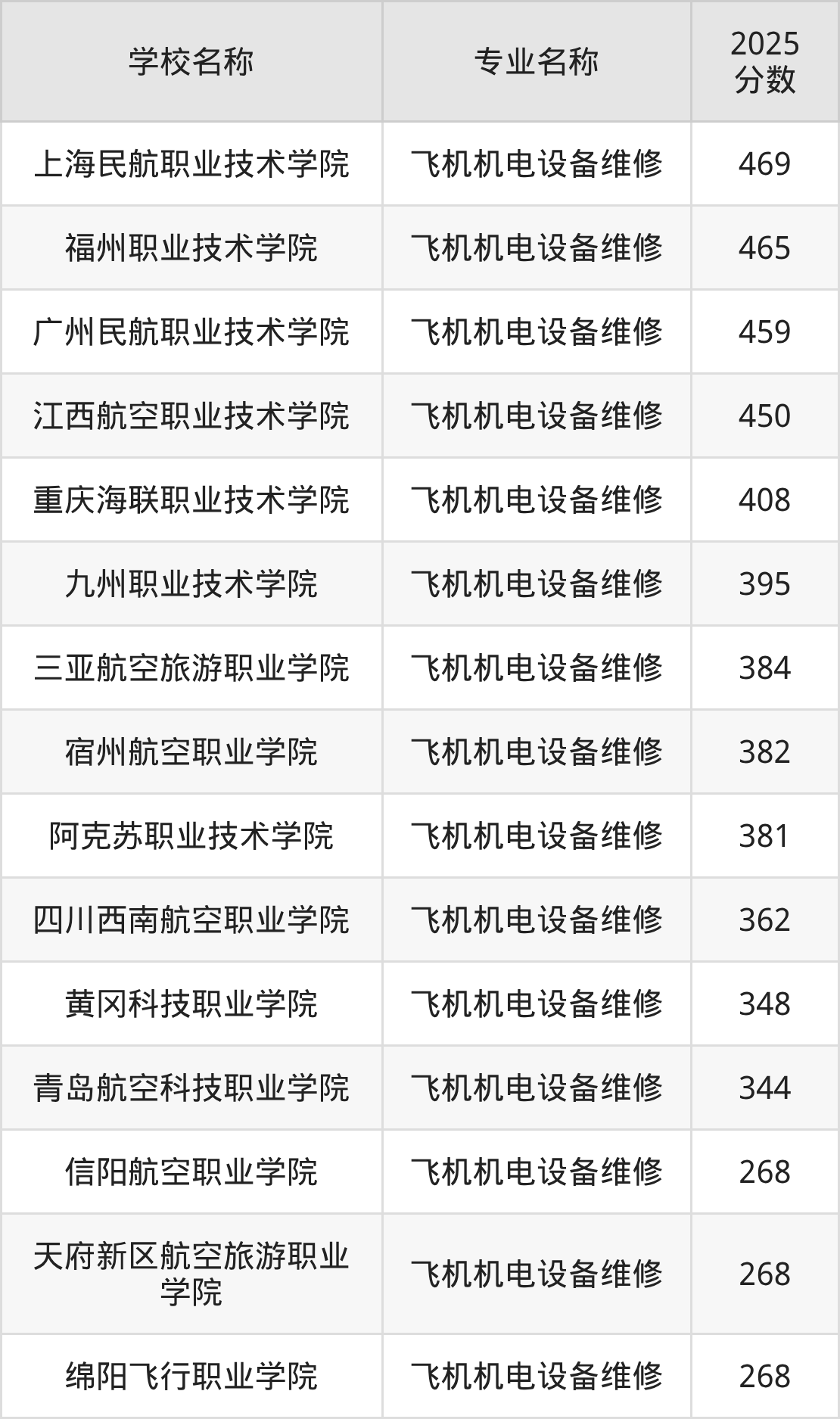 下面是2025年全国专科飞机机电设备维修专业大学录取分数线。
