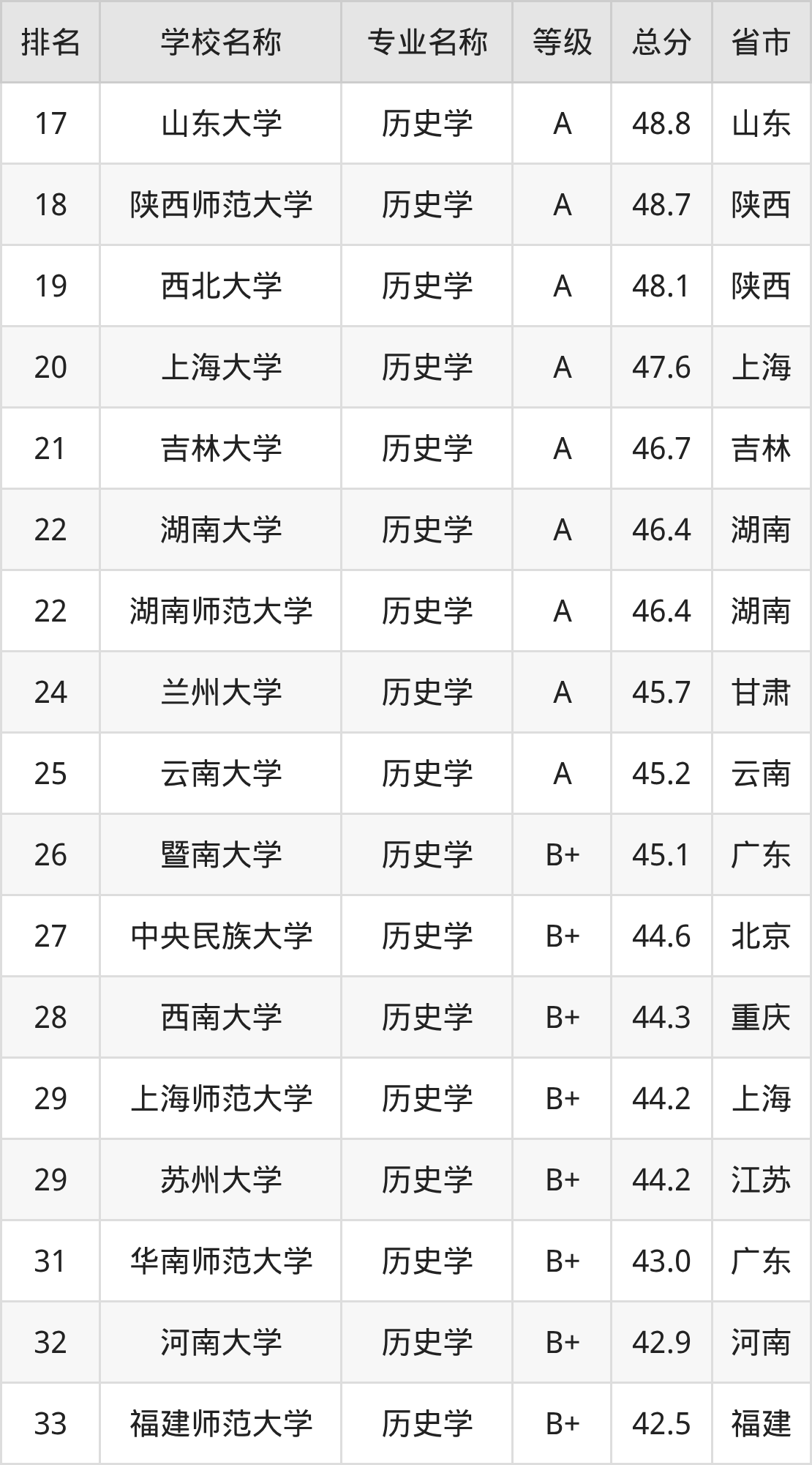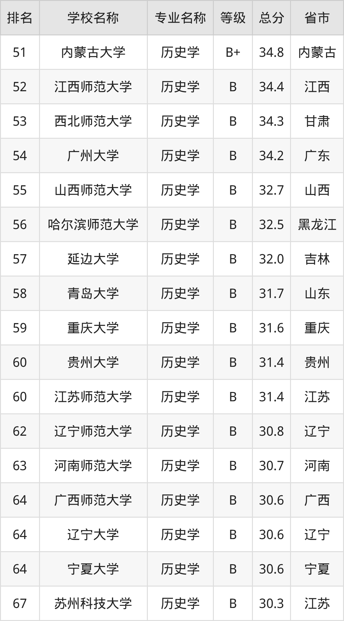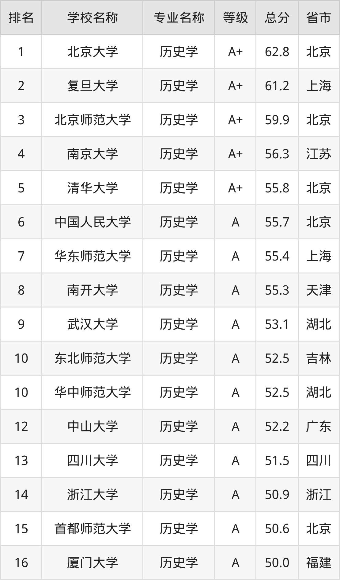 根据软科榜单可知,历史学专业全国排名前十的大学分别是: