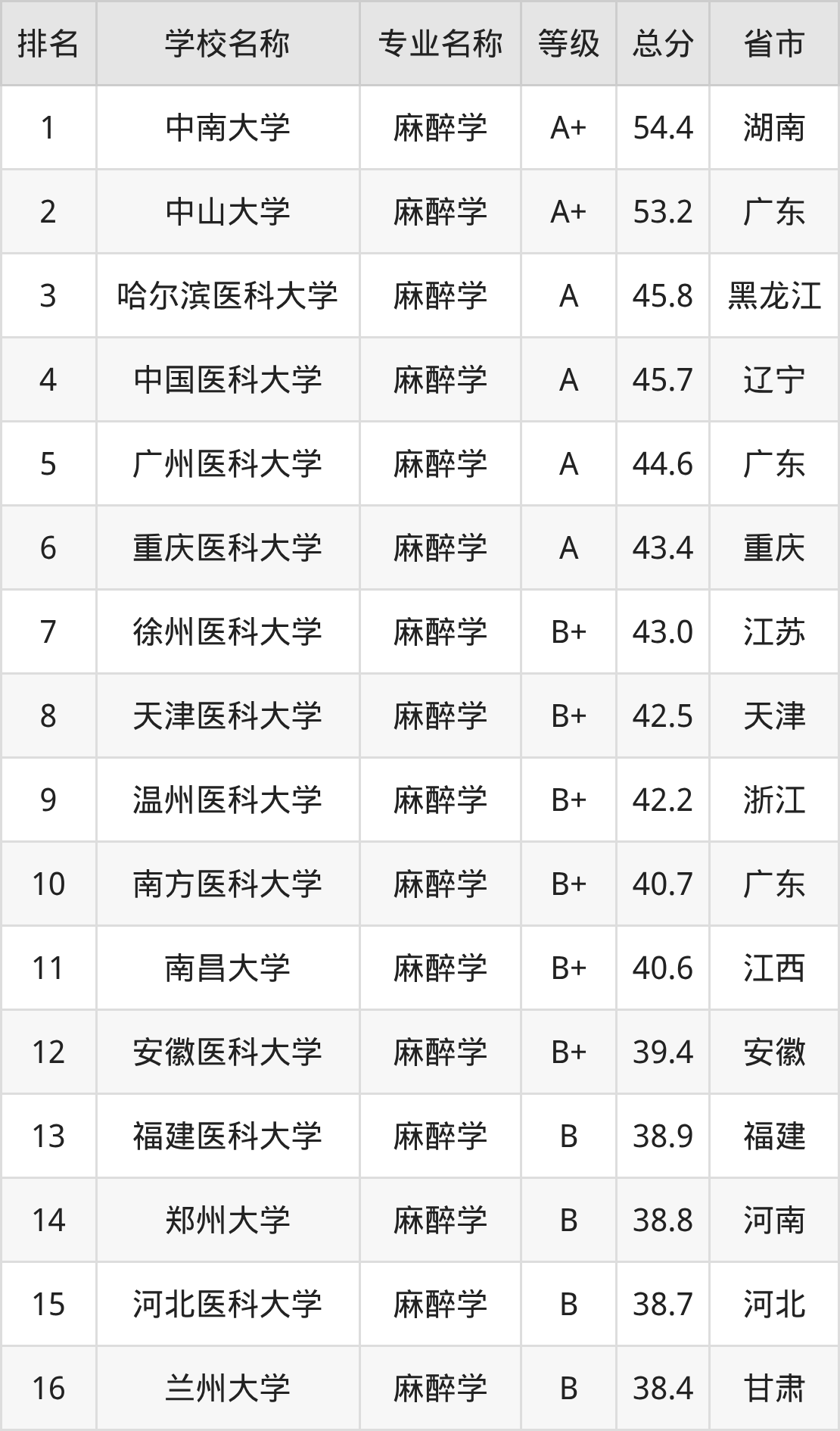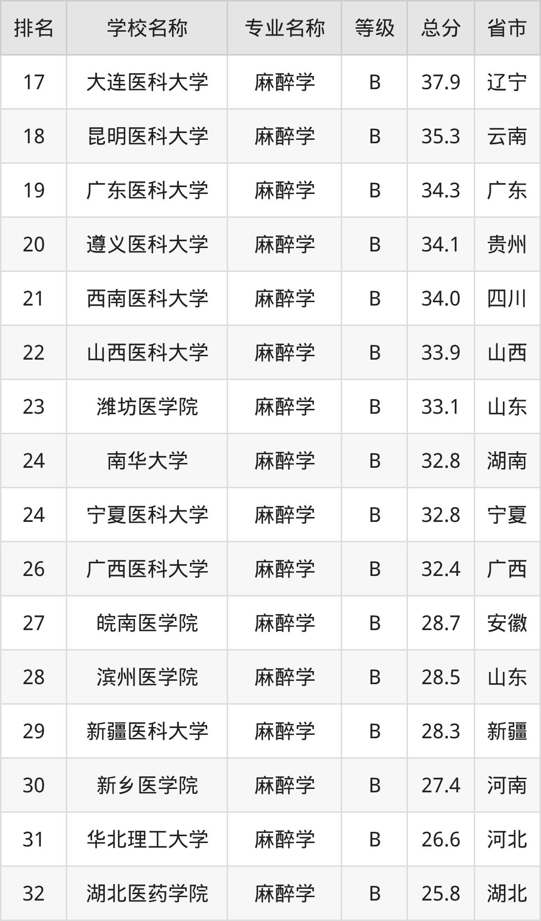 附麻醉学专业全国32所院校排名榜单一览表!