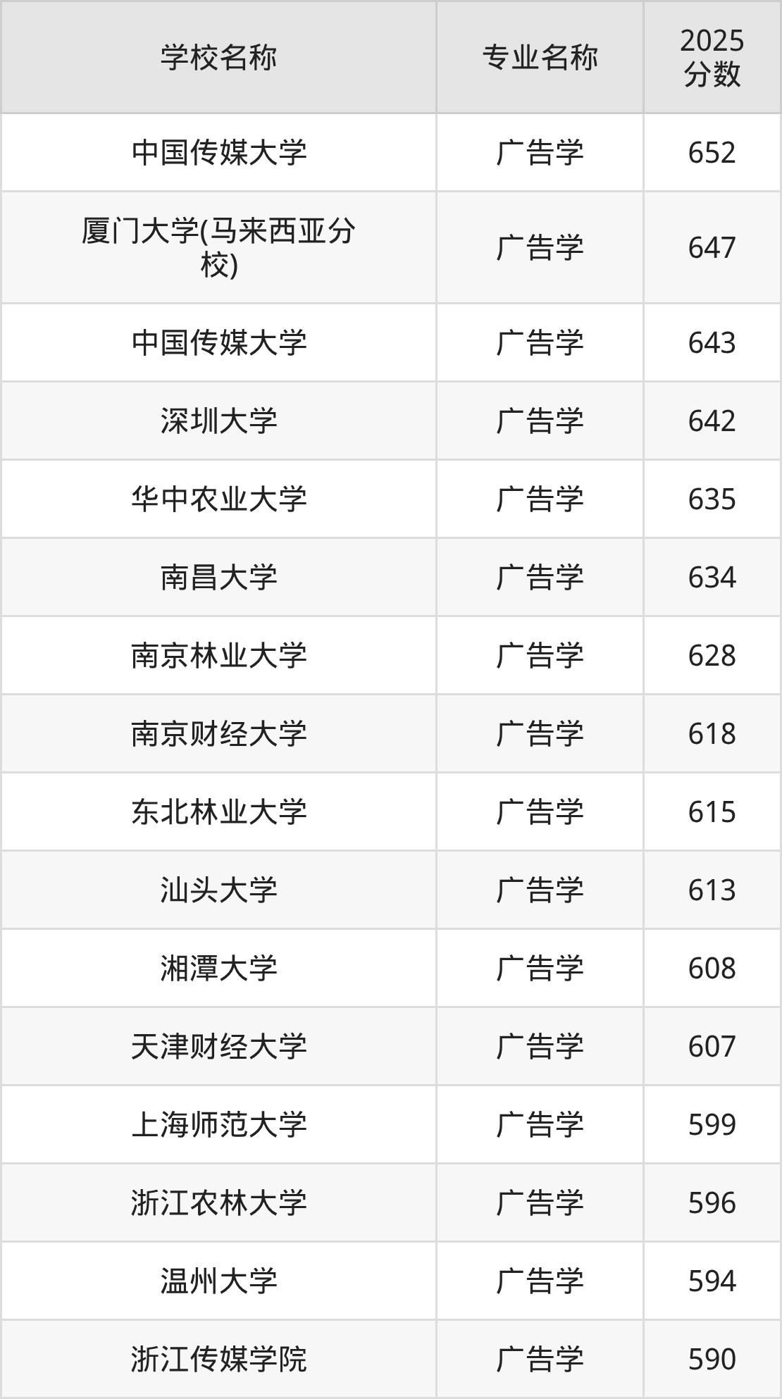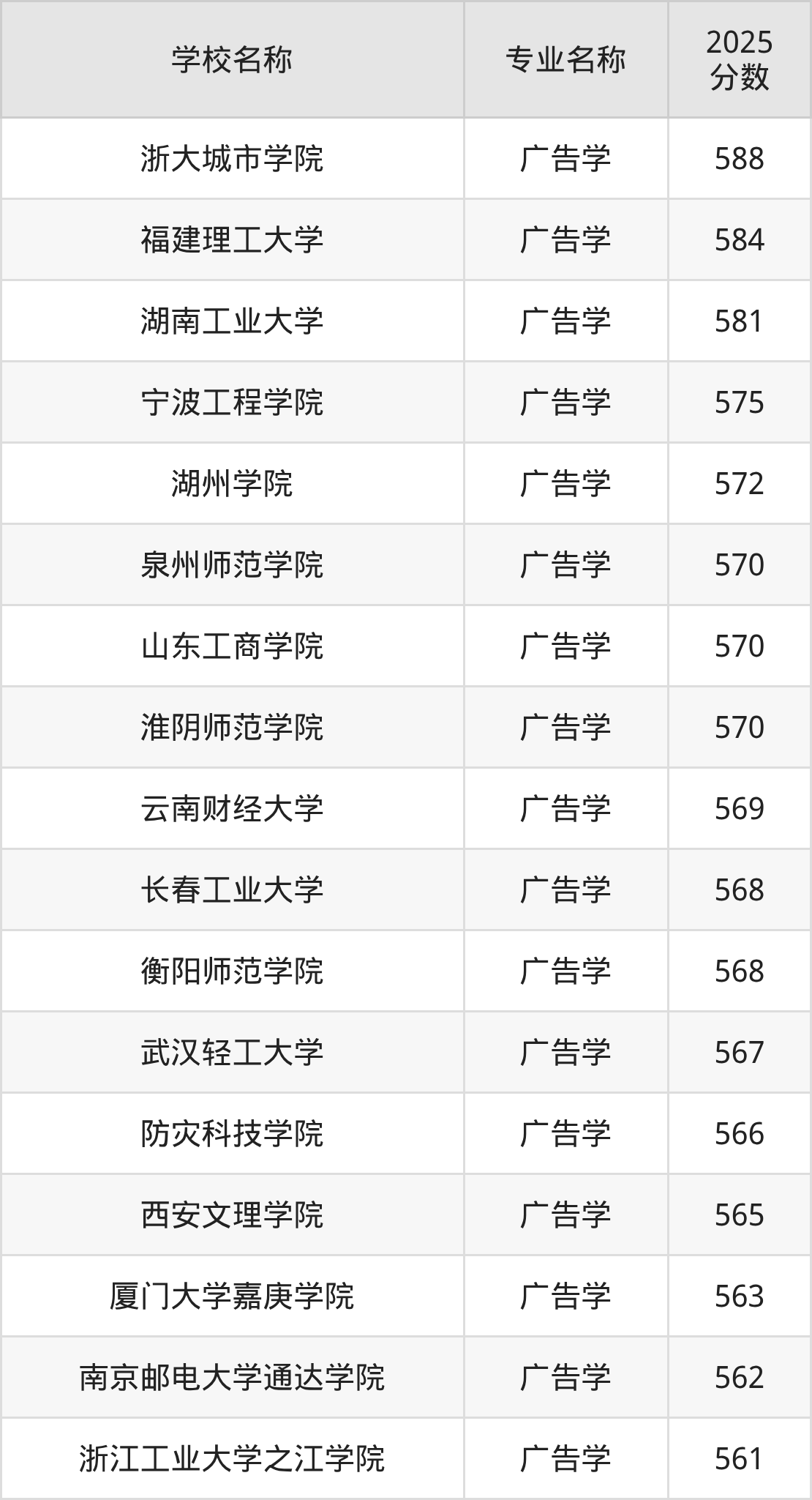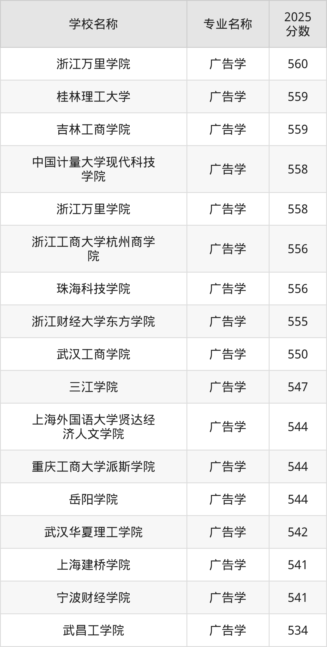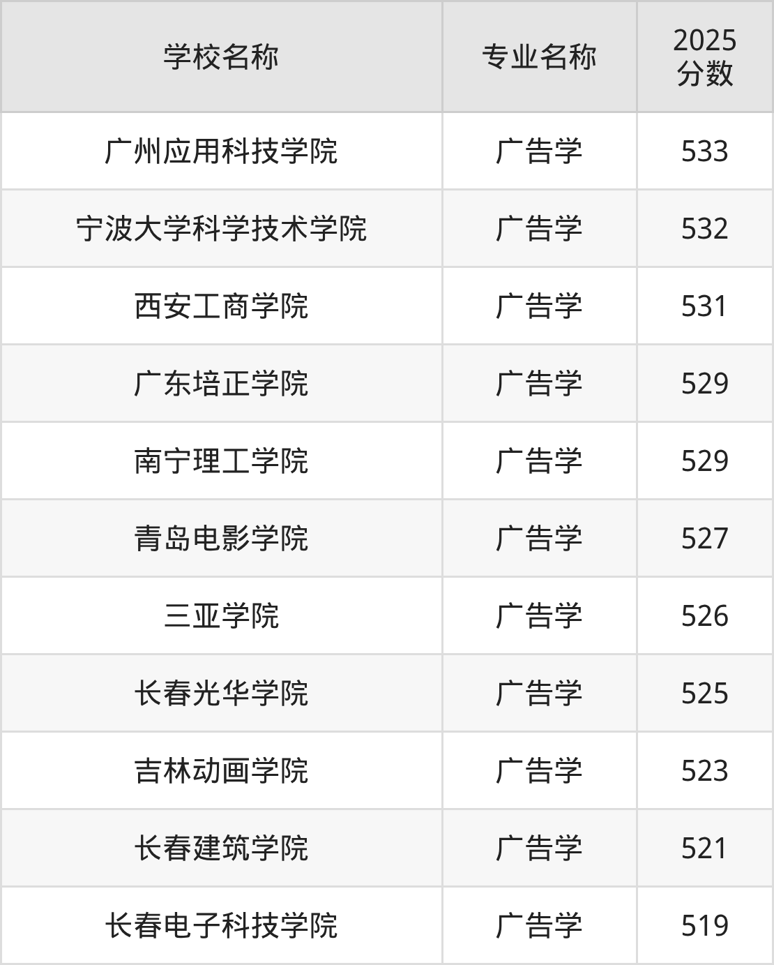 下面是2025年全国本科广告学专业大学录取分数线。